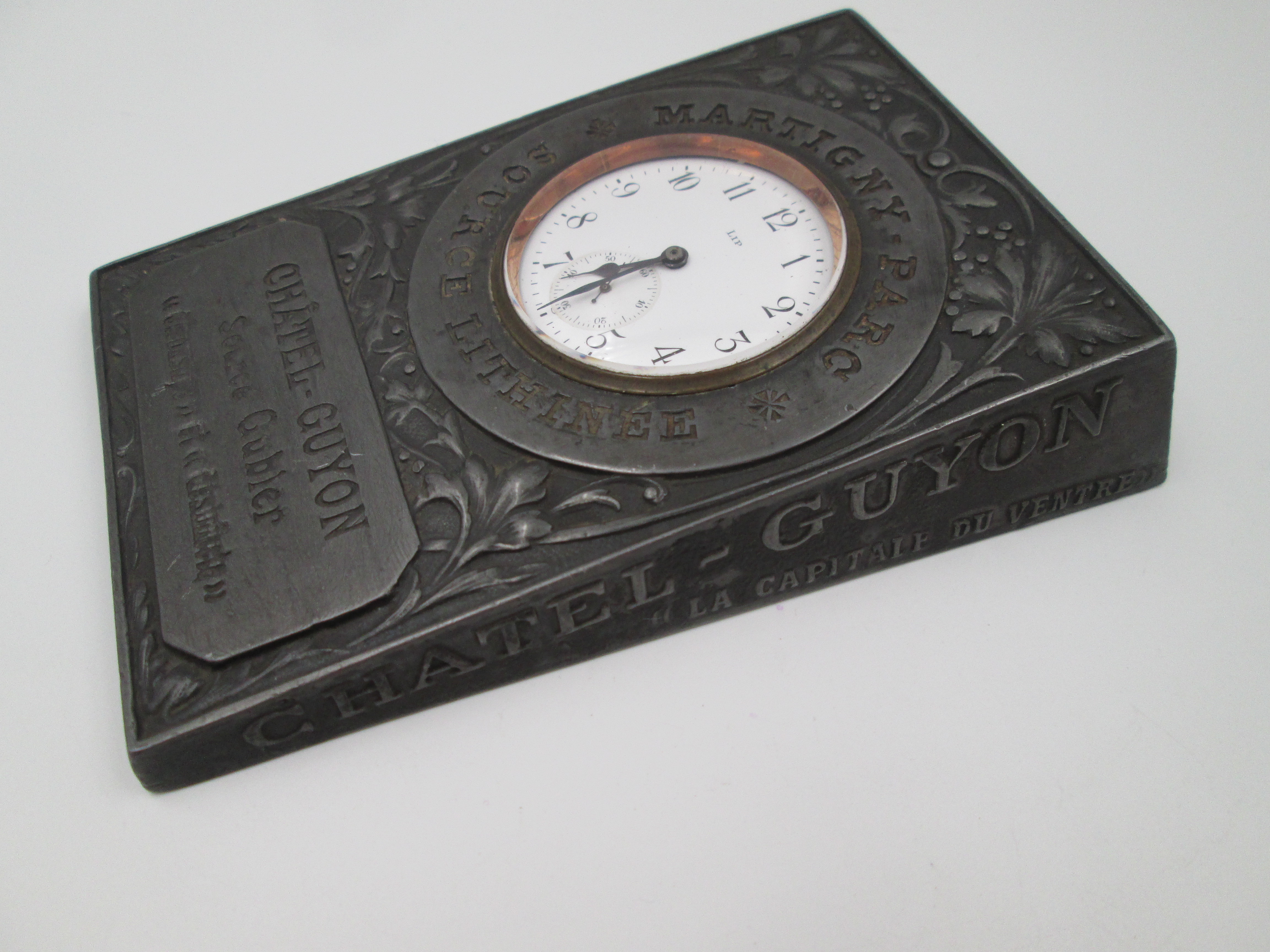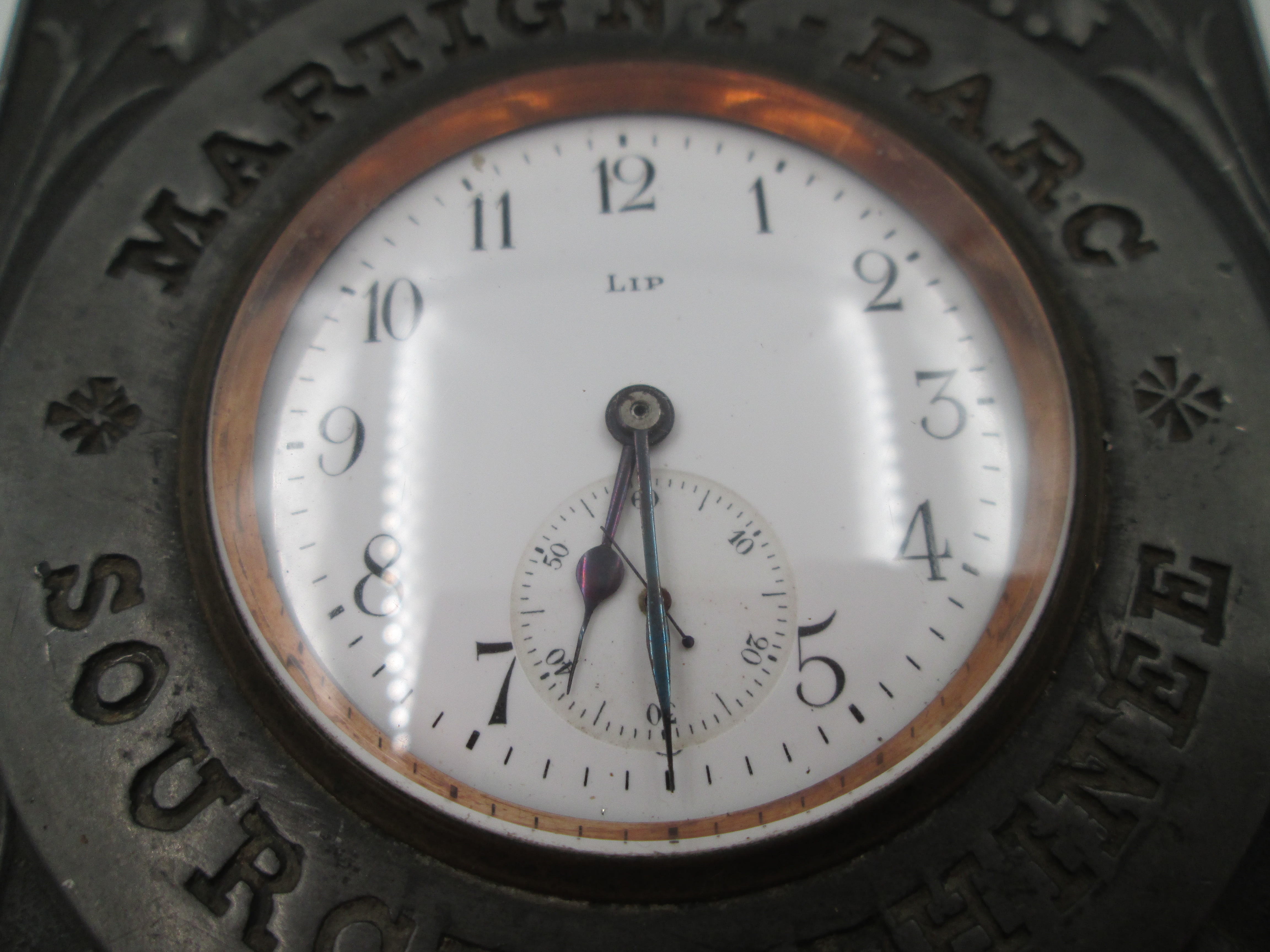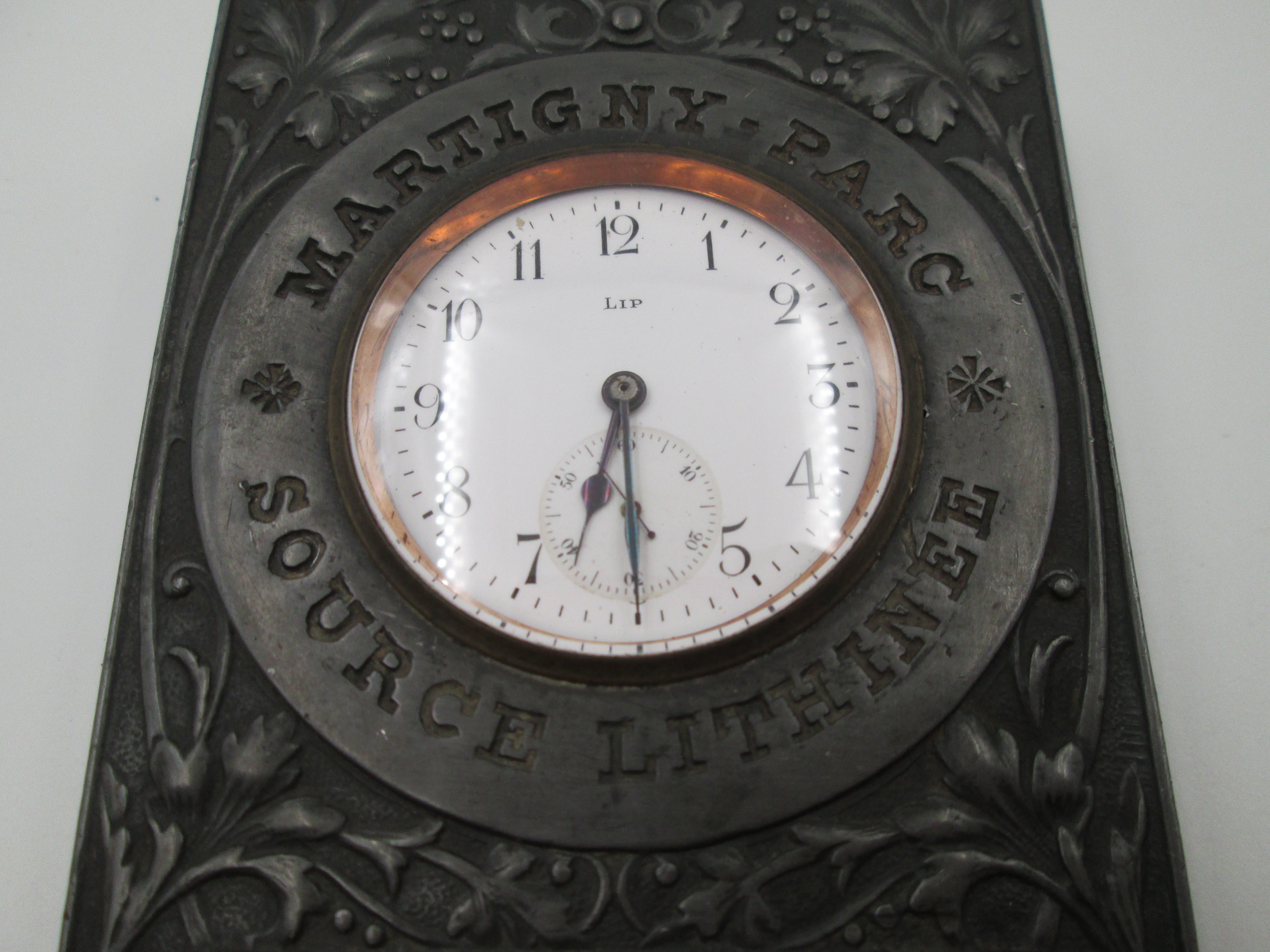 Advertising paperweight wind-up table desk Lip brand clock. Ornate iron. France. 1950's