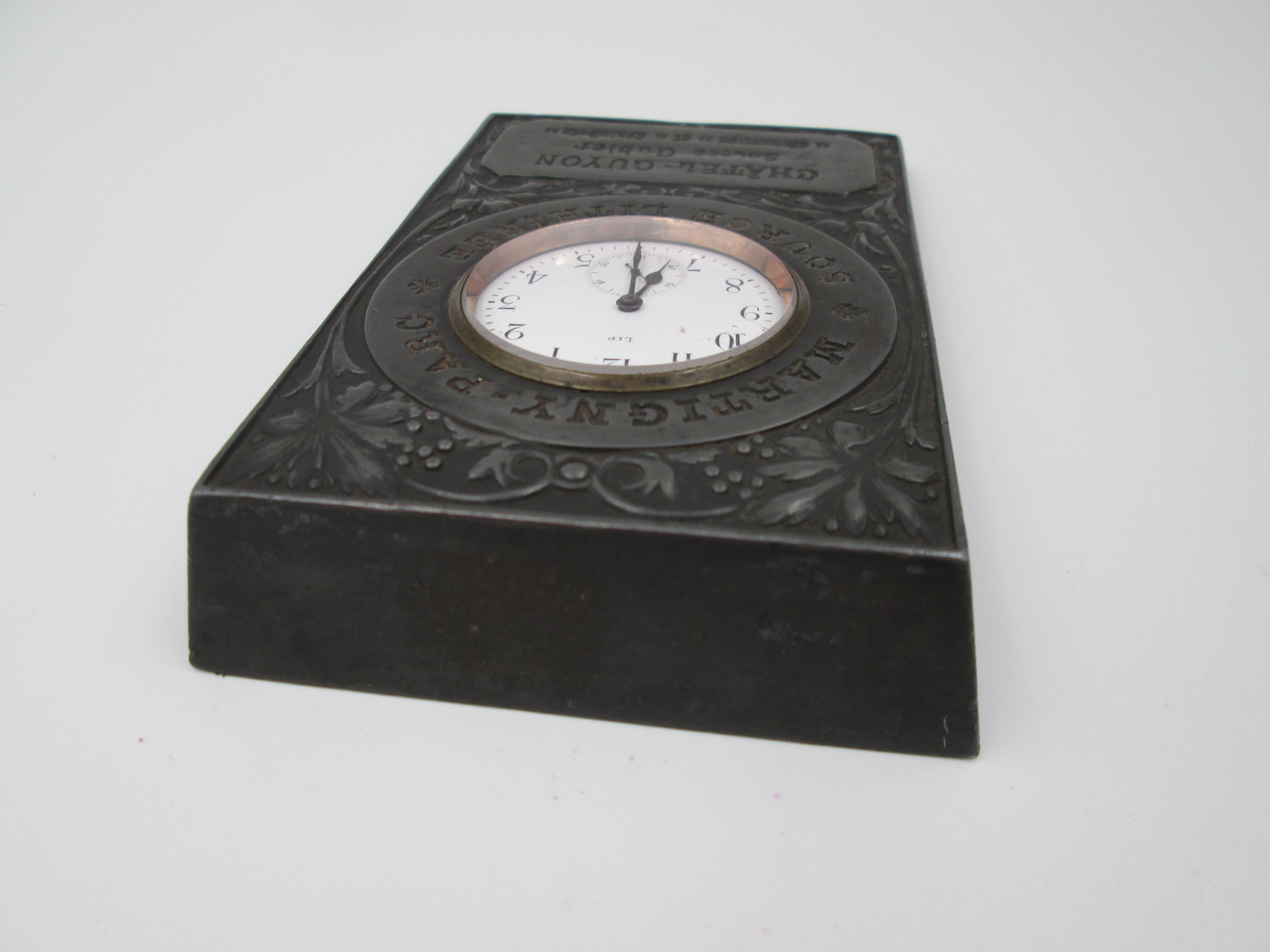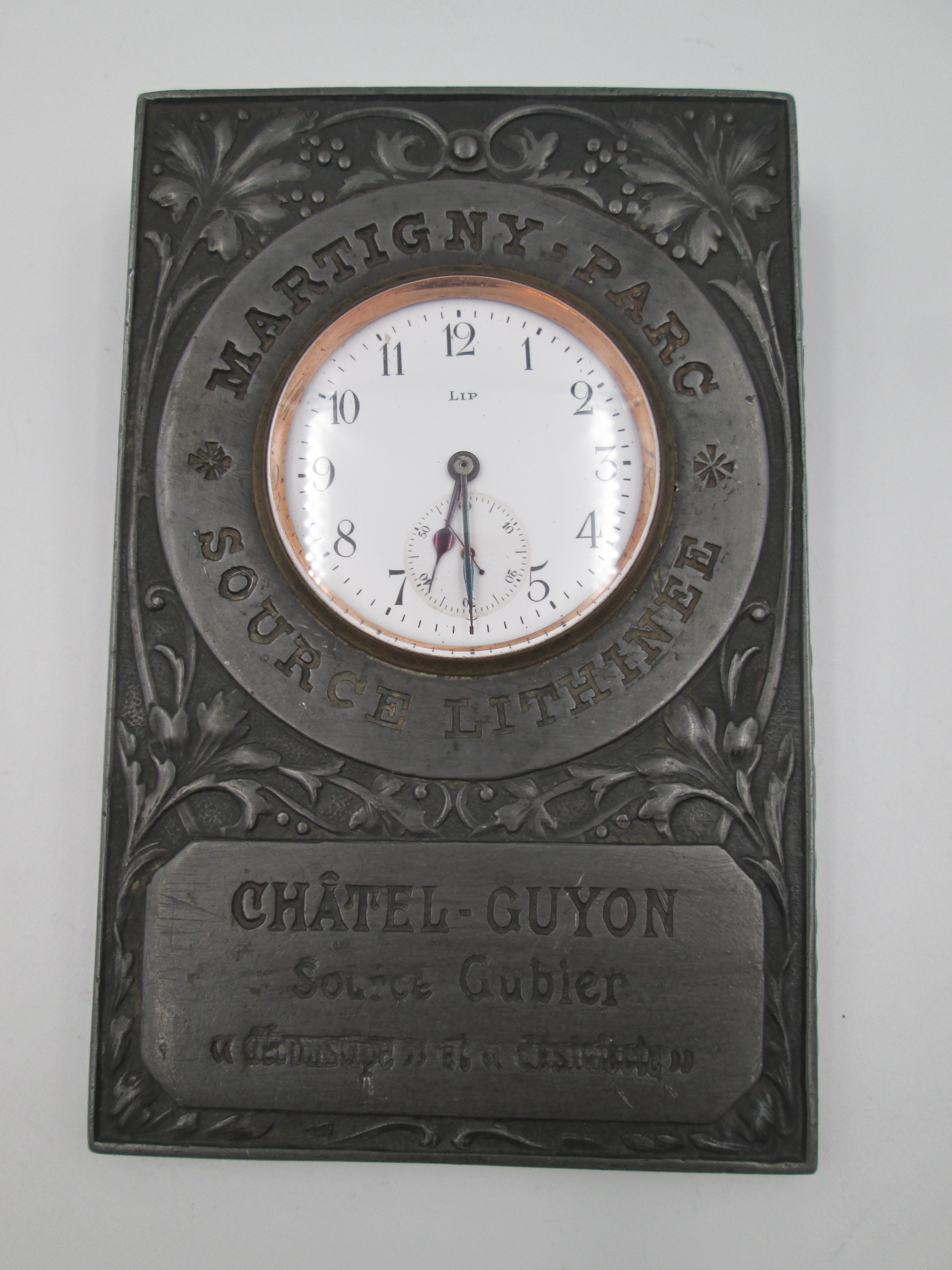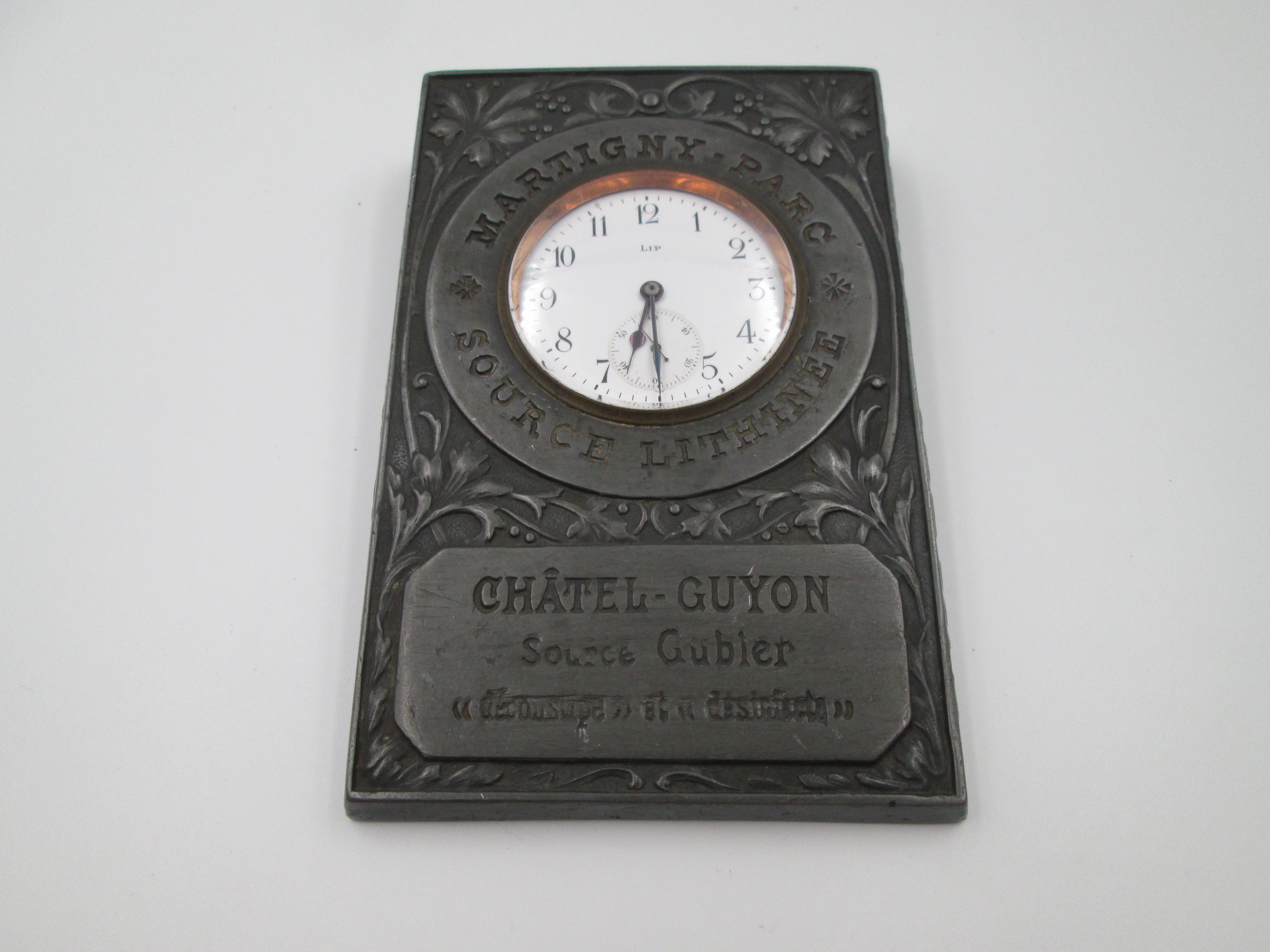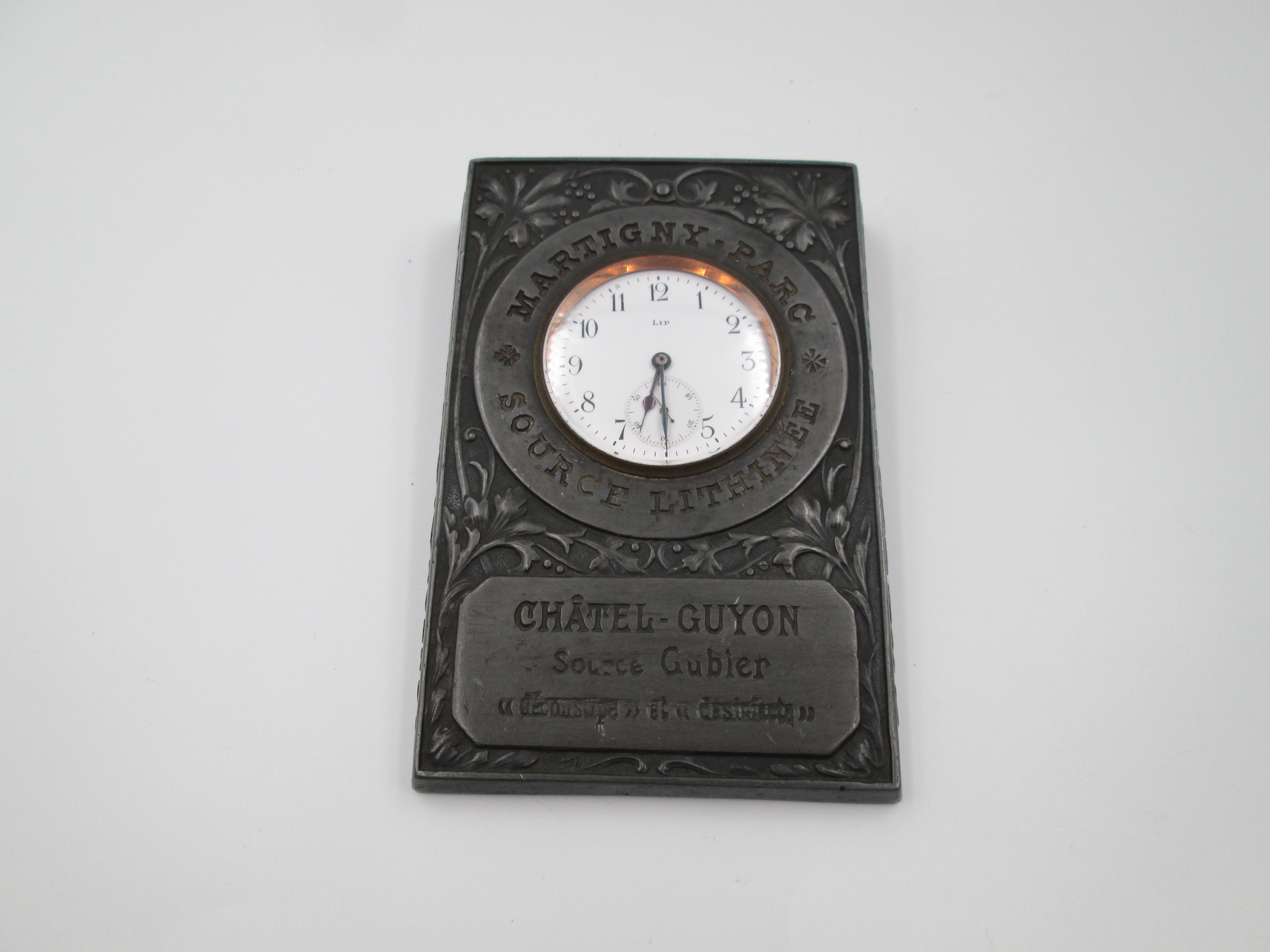 Advertising paperweight wind-up table desk Lip brand clock. Ornate iron. France. 1950's