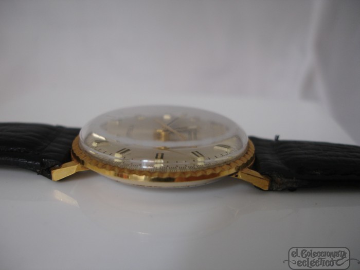Gold plated case and stainless steel back. Plexiglass crystal.