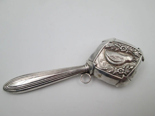 Baby rattle with handle. 835 sterling silver. Duck with flowers and leaves. Portugal. 1980's
