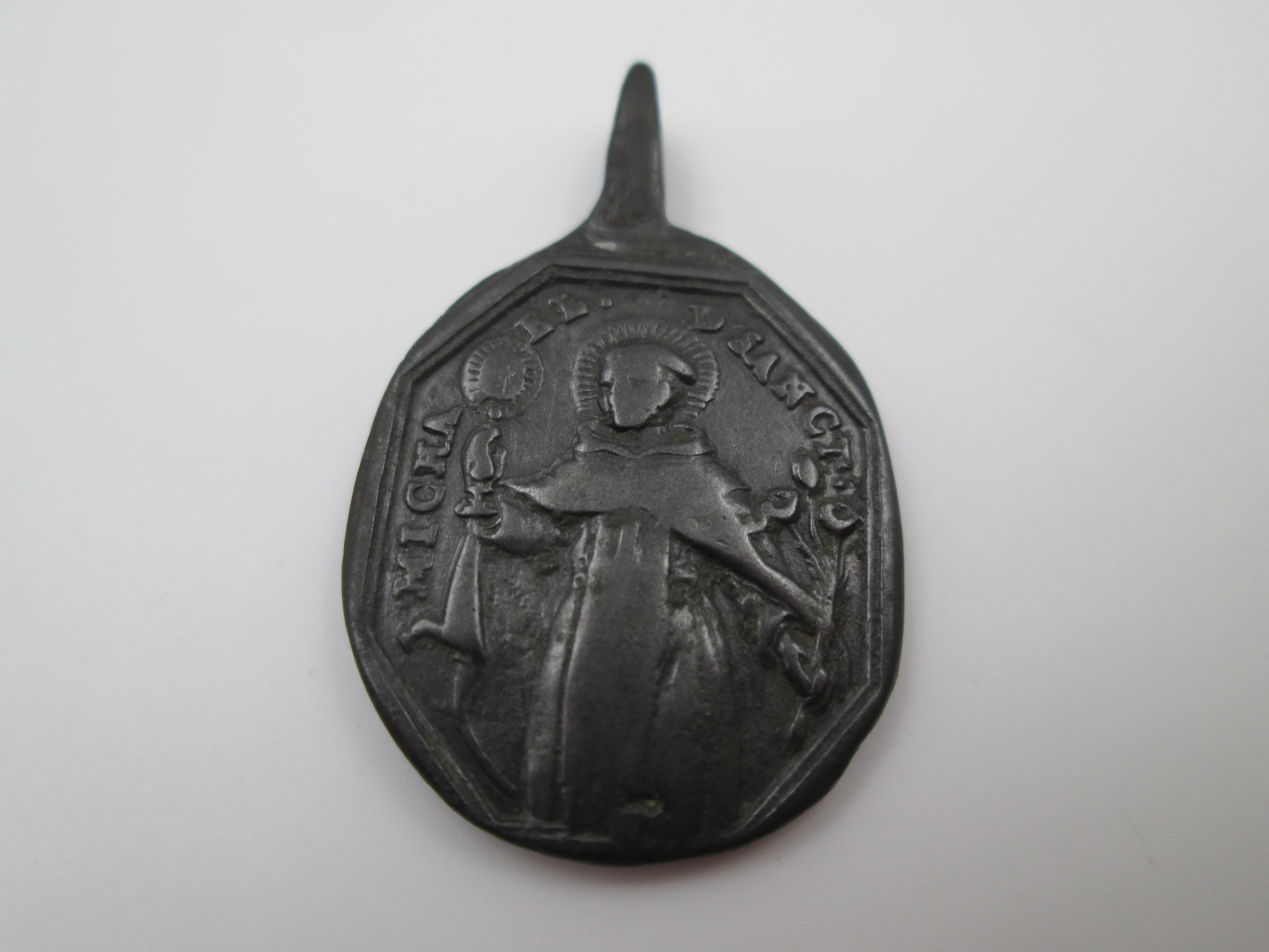 Bronze medal. Saint Michael and Jesus of Nazareth. High relief. Ring on top. 18th century