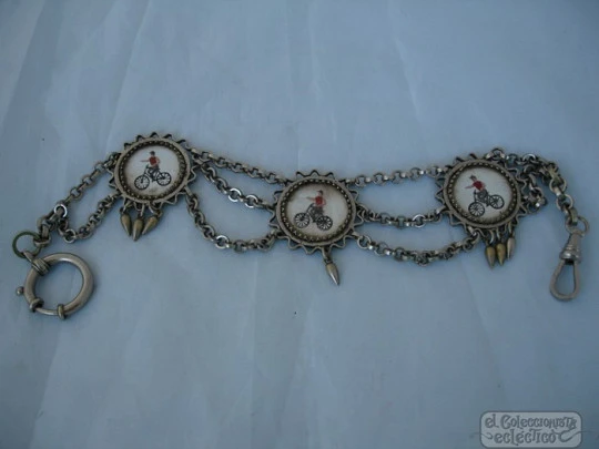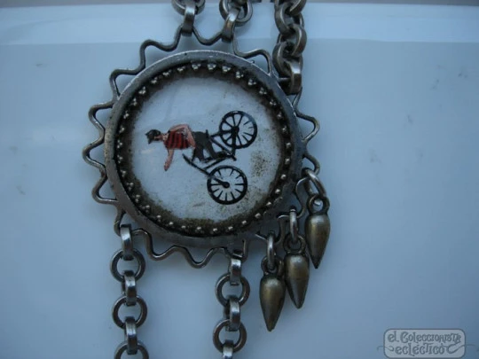 Chatelaine pocket watch. Nickel plated metal. Enamels. Cyclists. Circa 1930-1940.