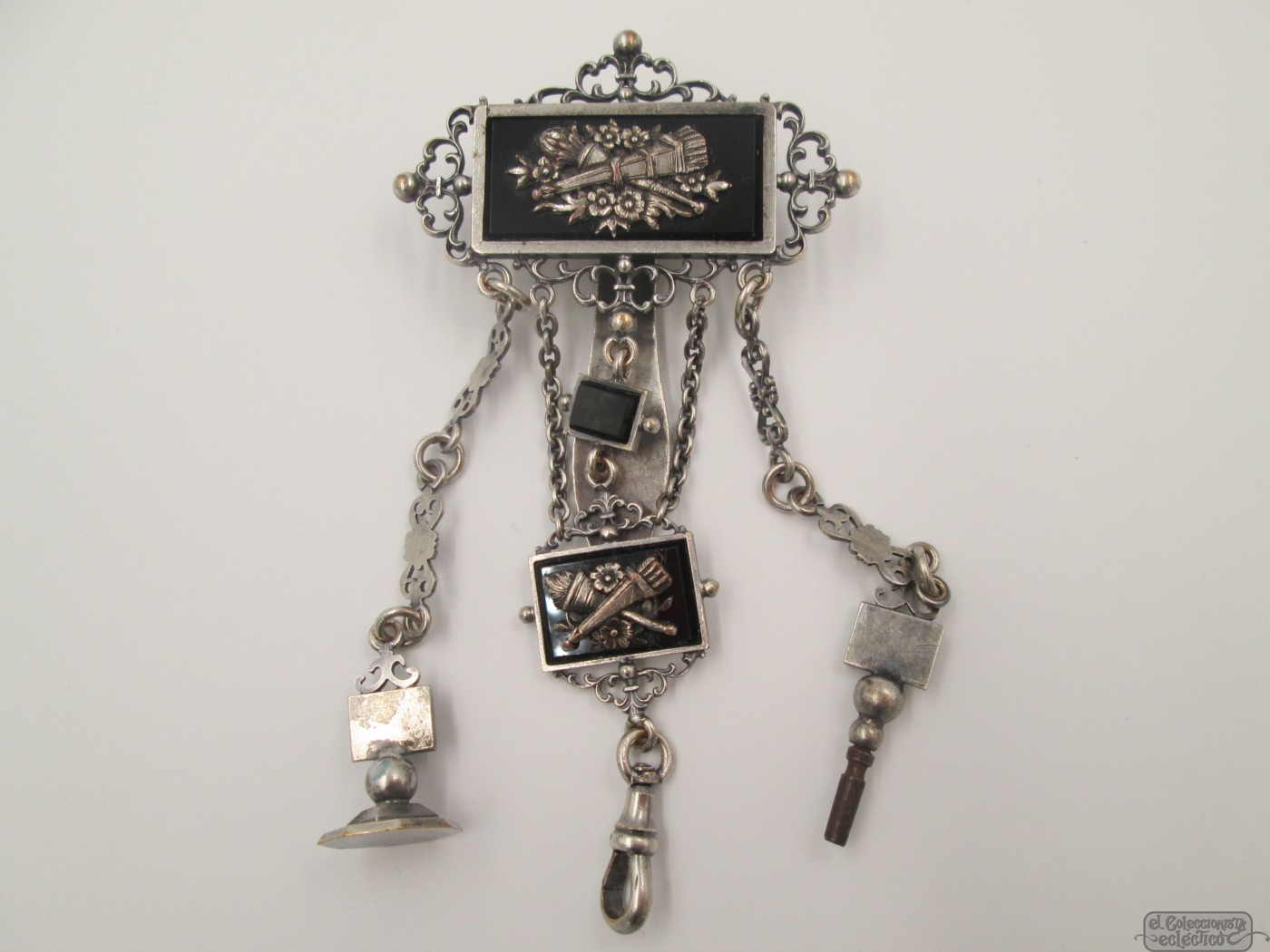 Chatelaine pocket watch. Onyx & silver metal. Key and seal. 1900. Cornucopia