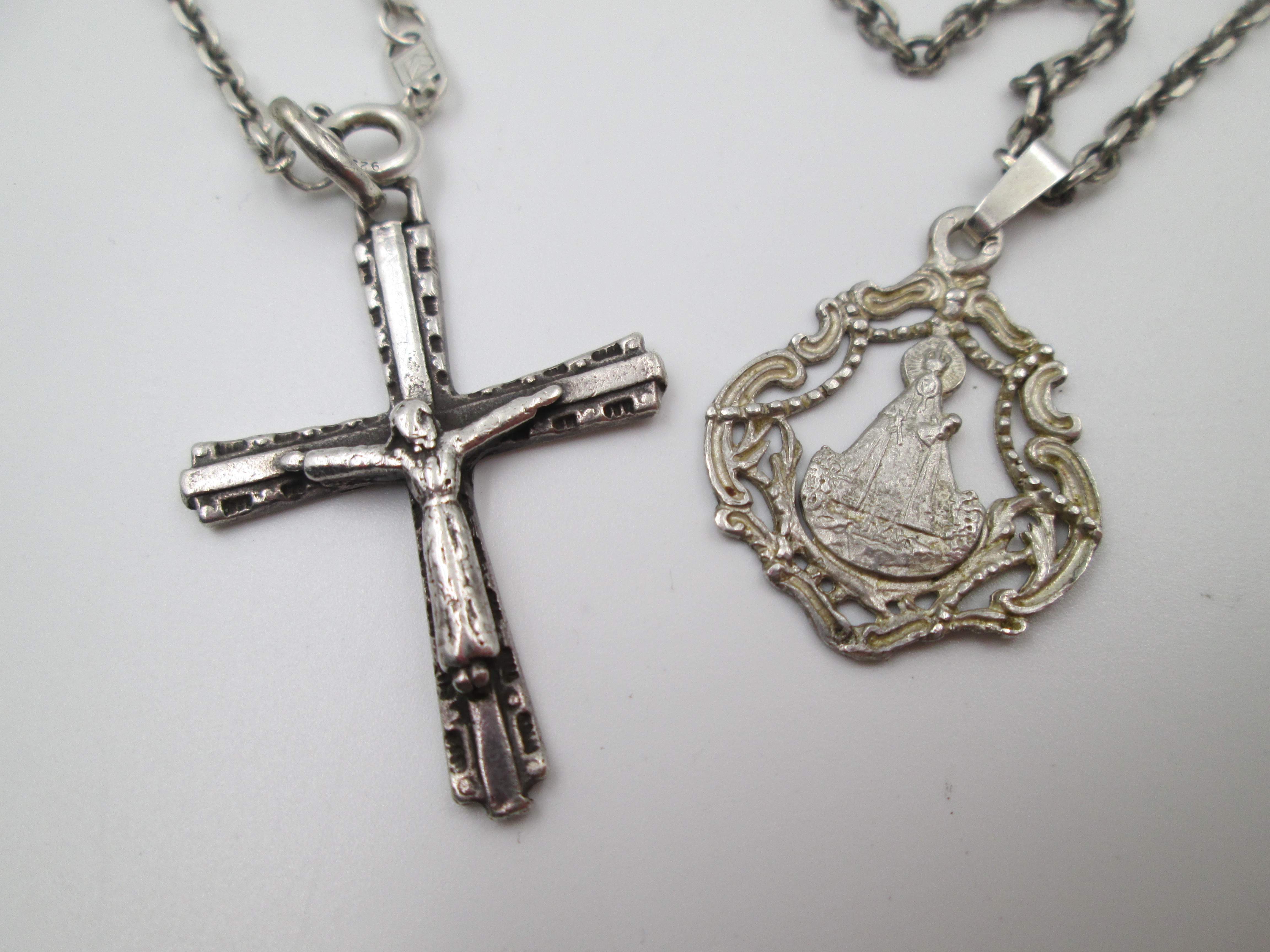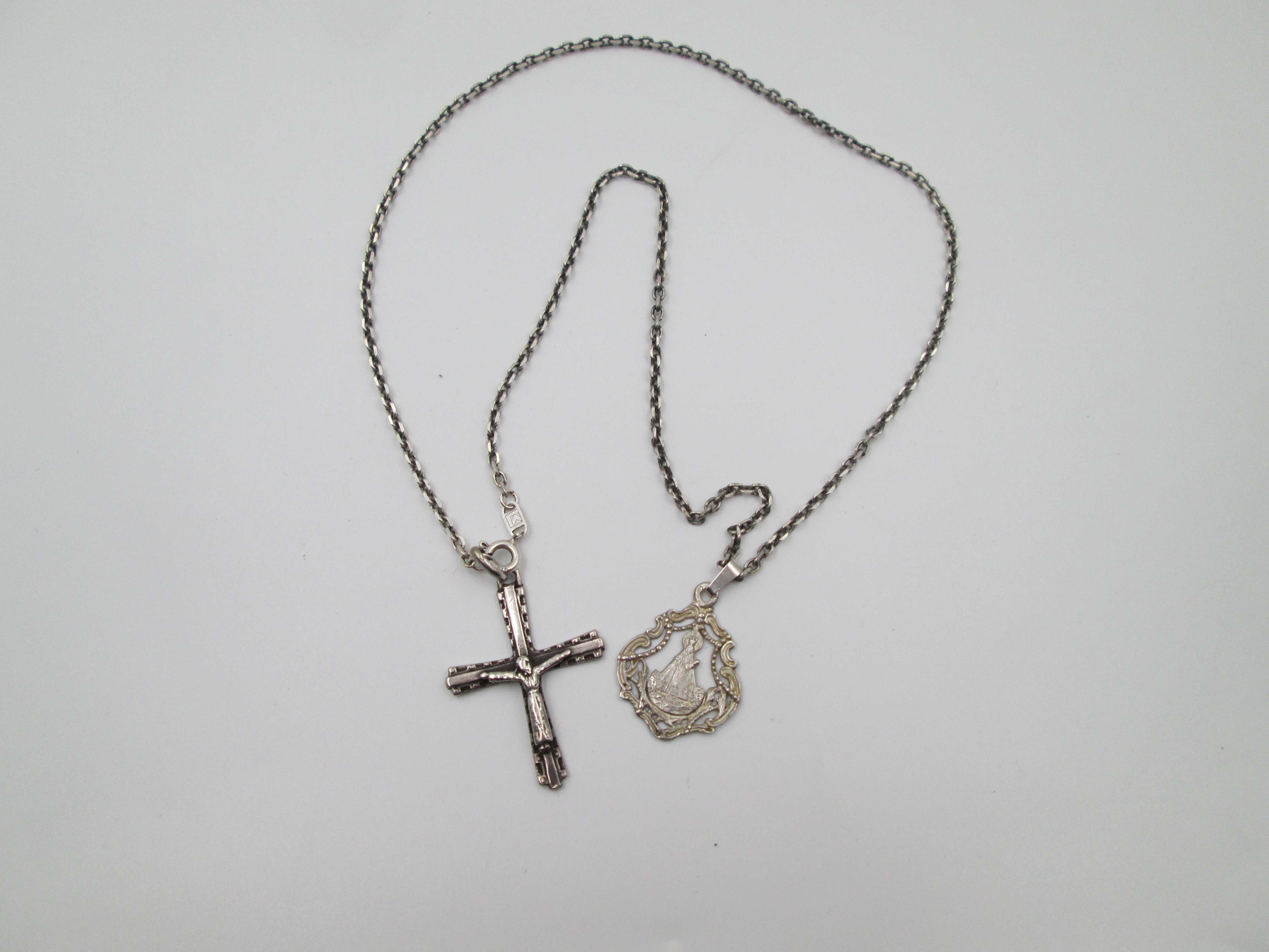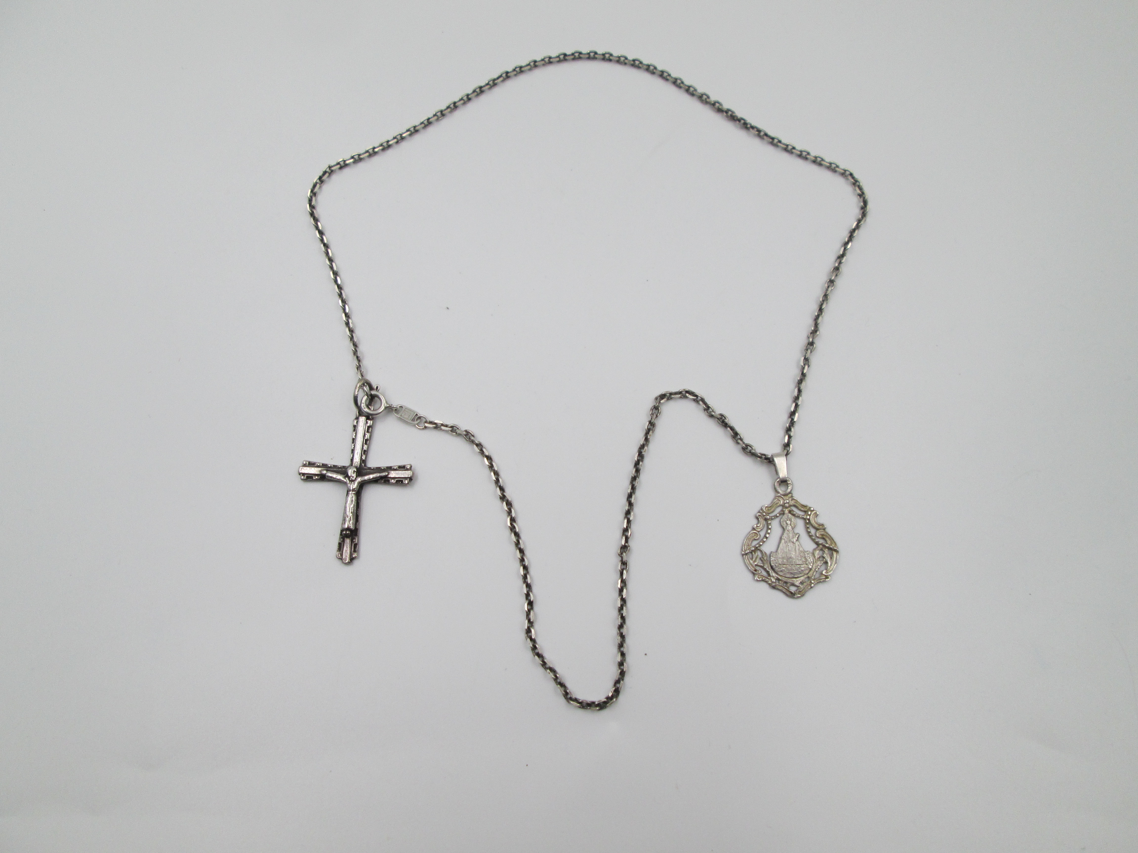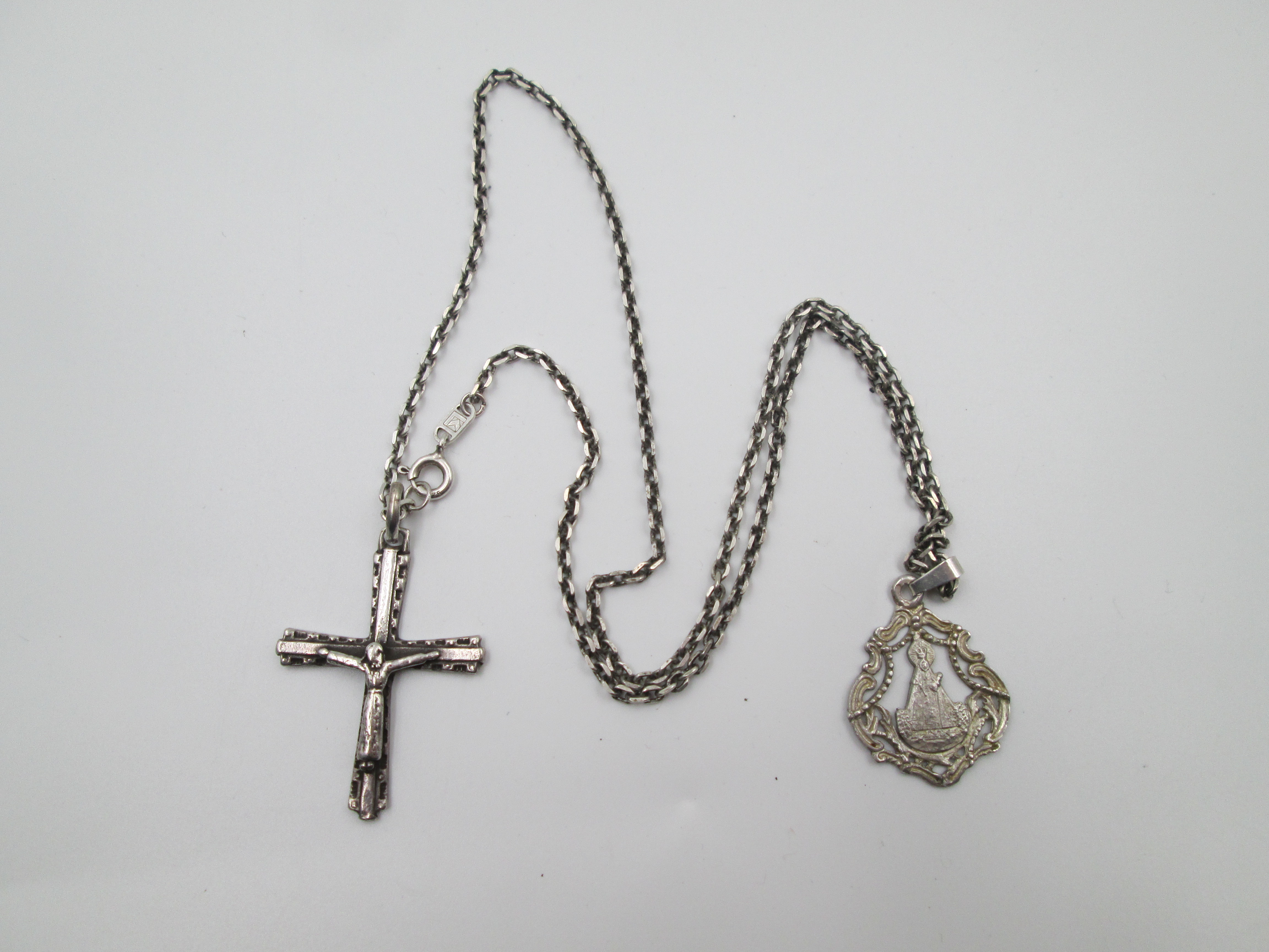 Crucifix pendant and Virgin medal with chain. 925 sterling silver. Spring ring clasp. Spain