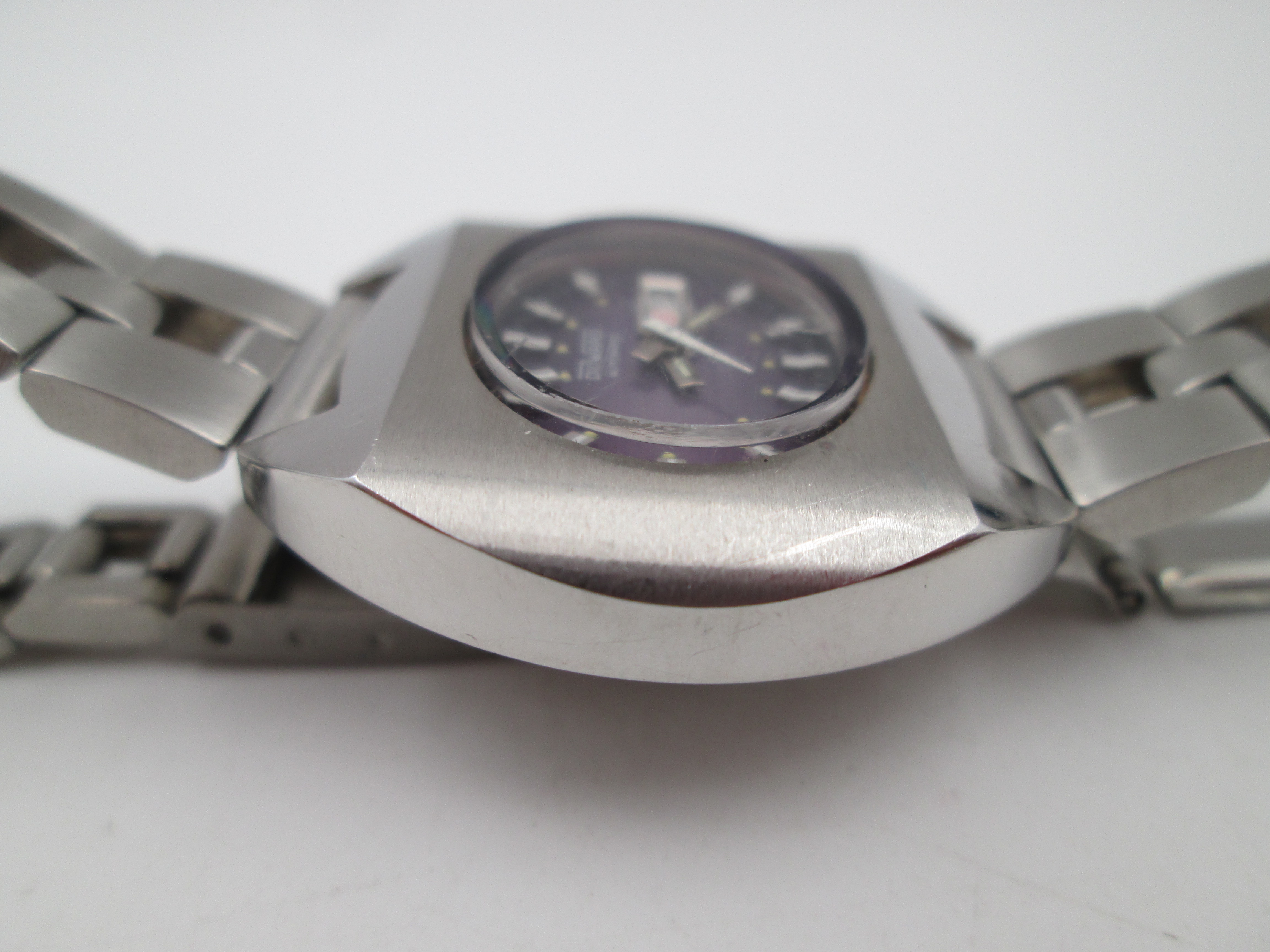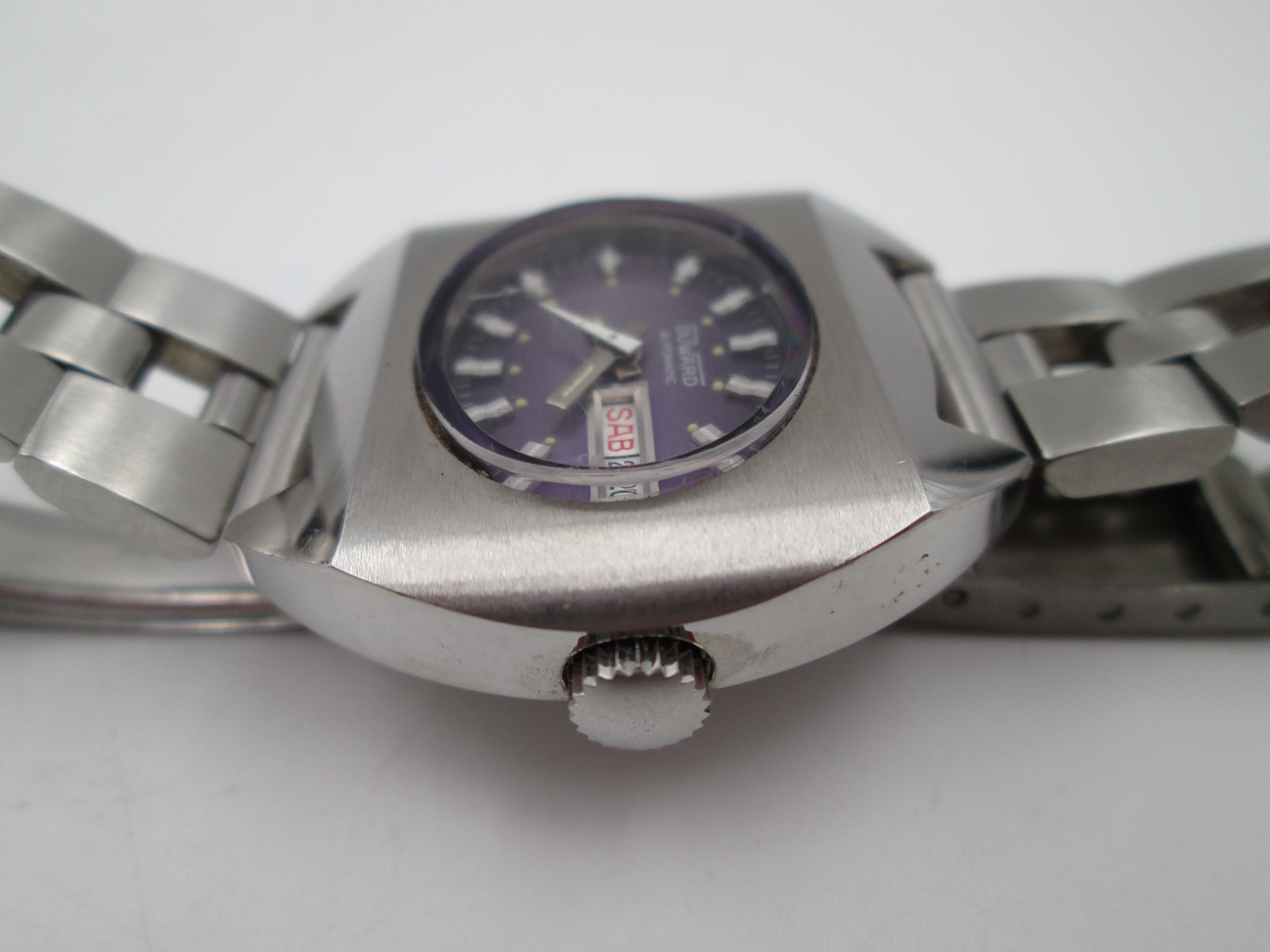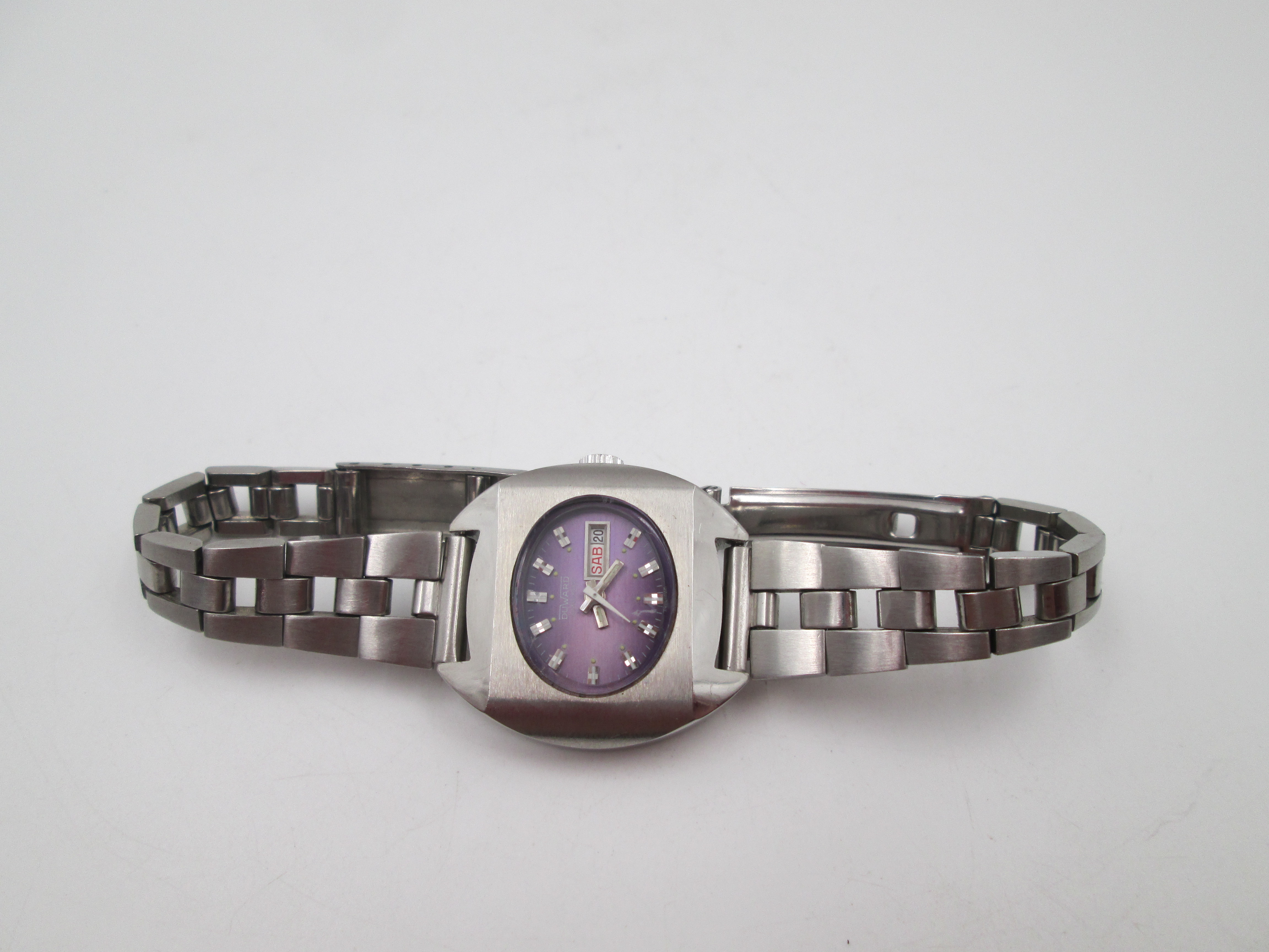 Duward women's automatic watch. Stainless steel. Purple dial. Calendar. Bracelet. 1970's
