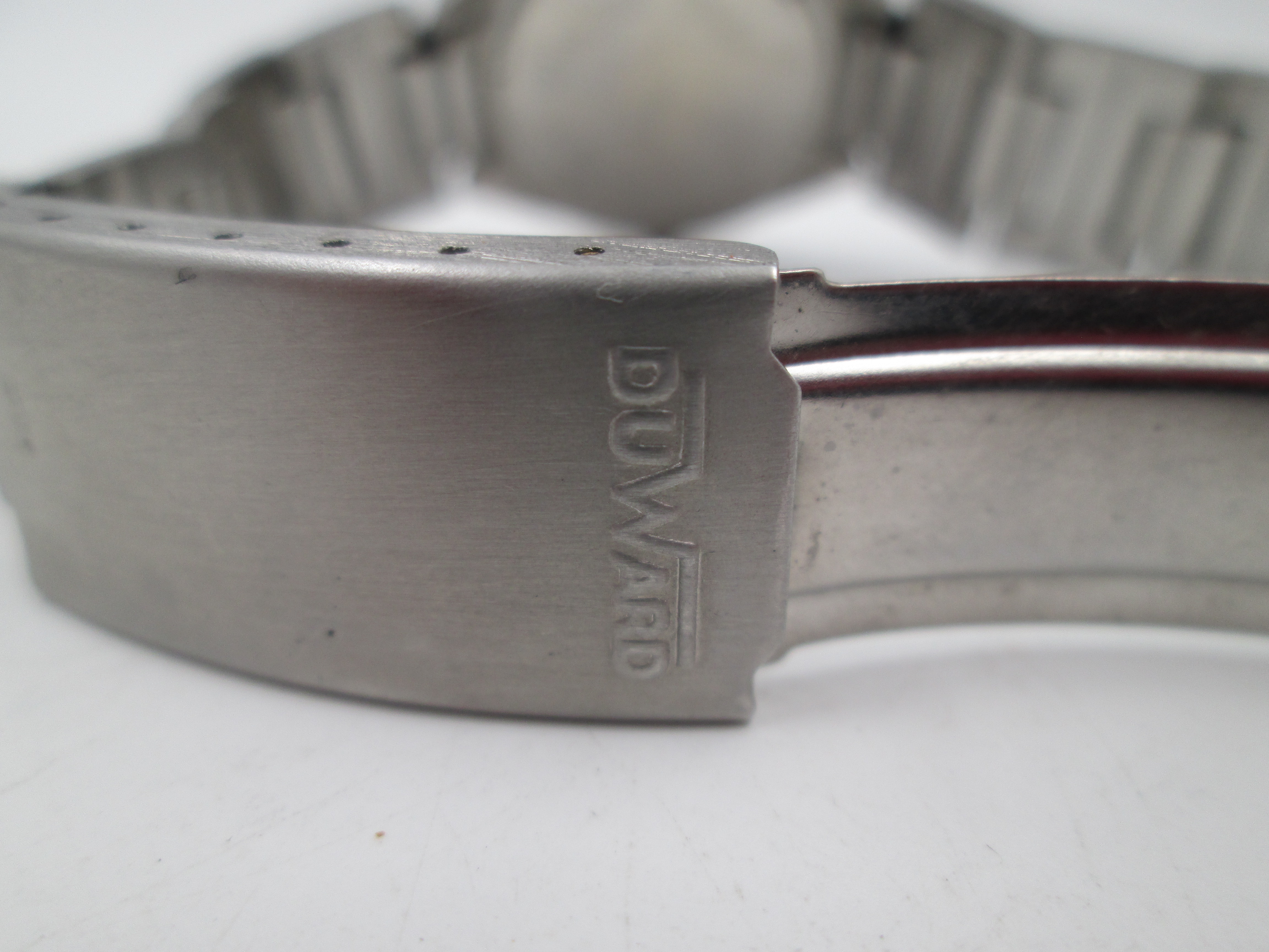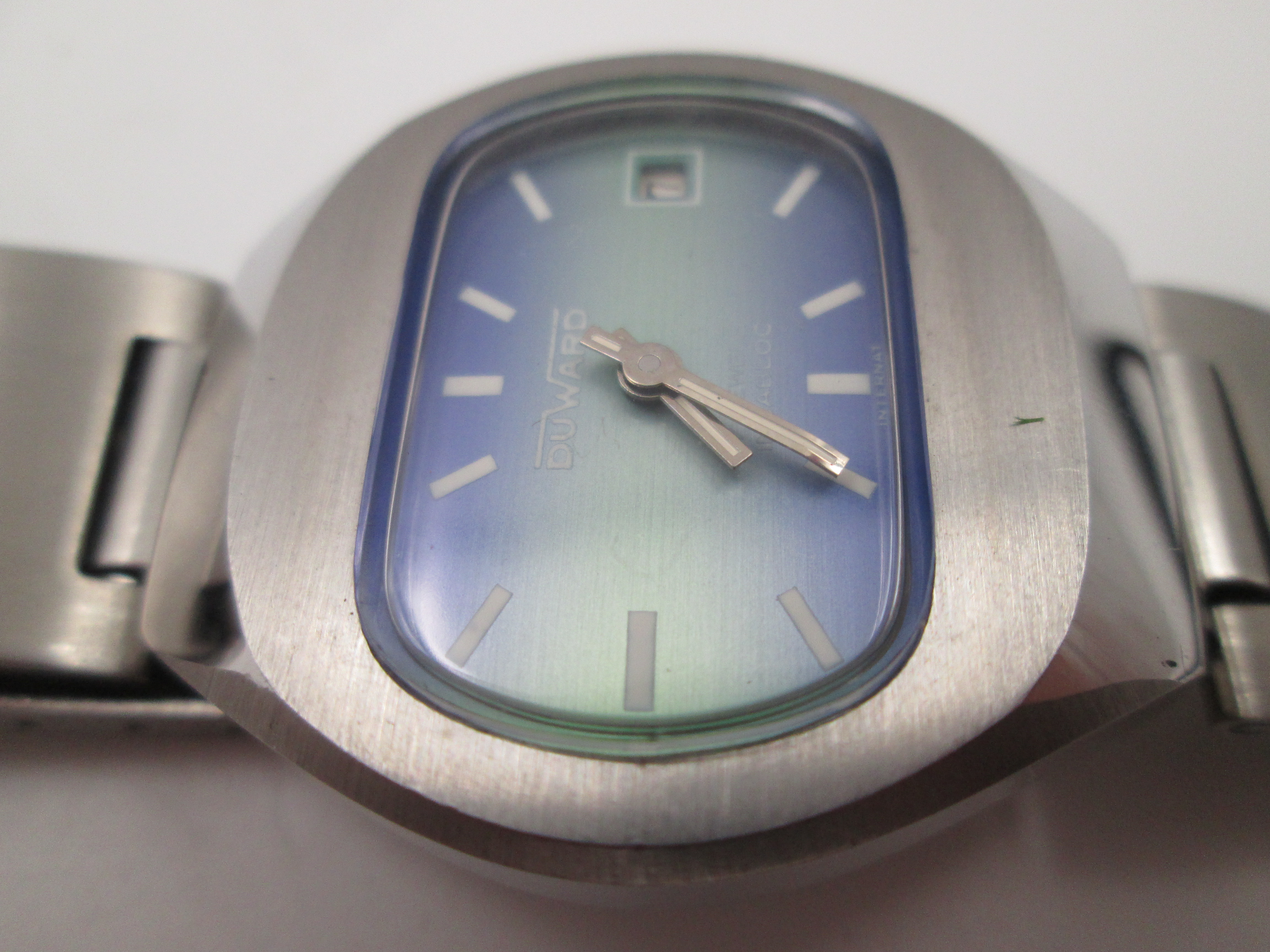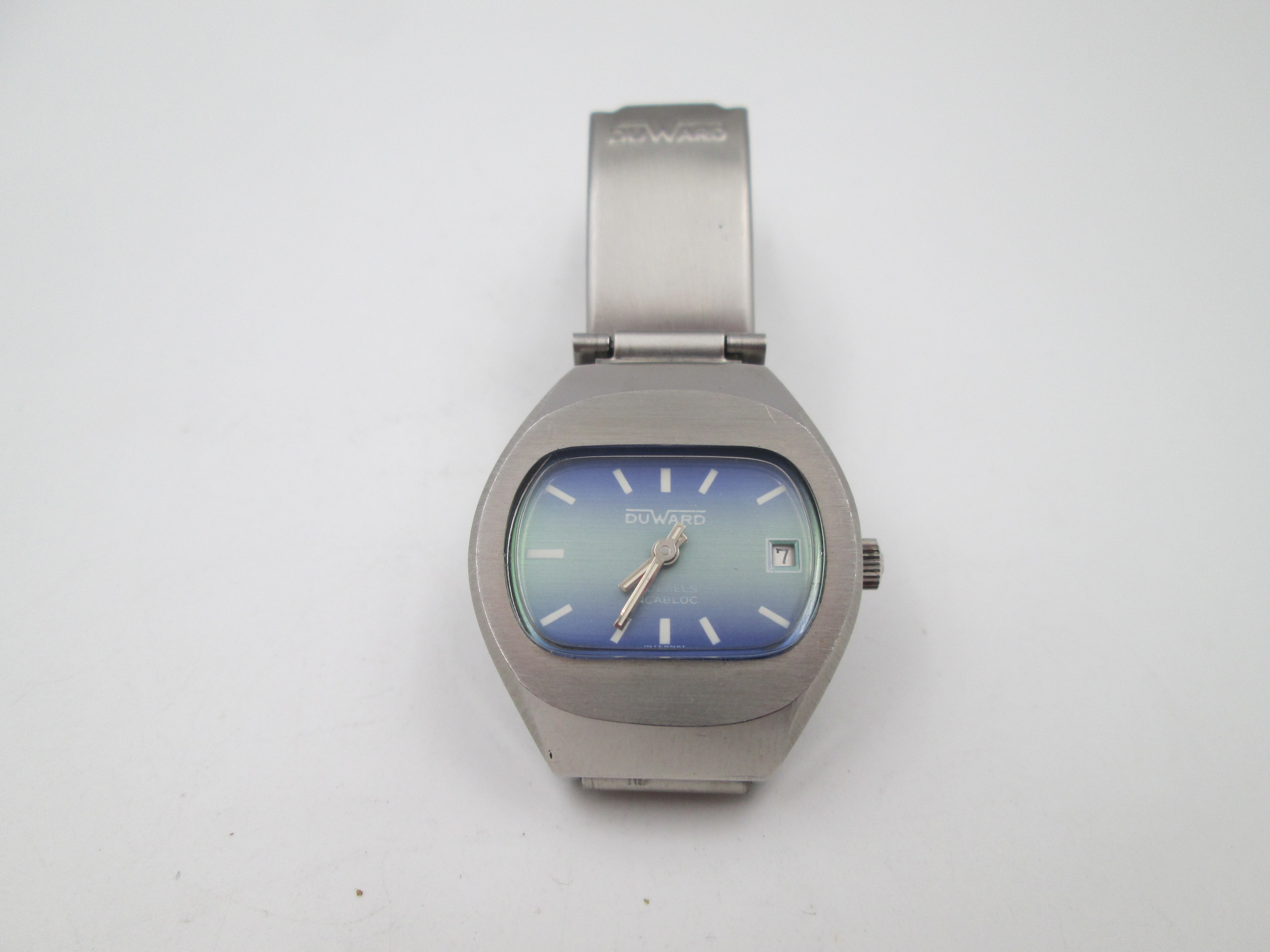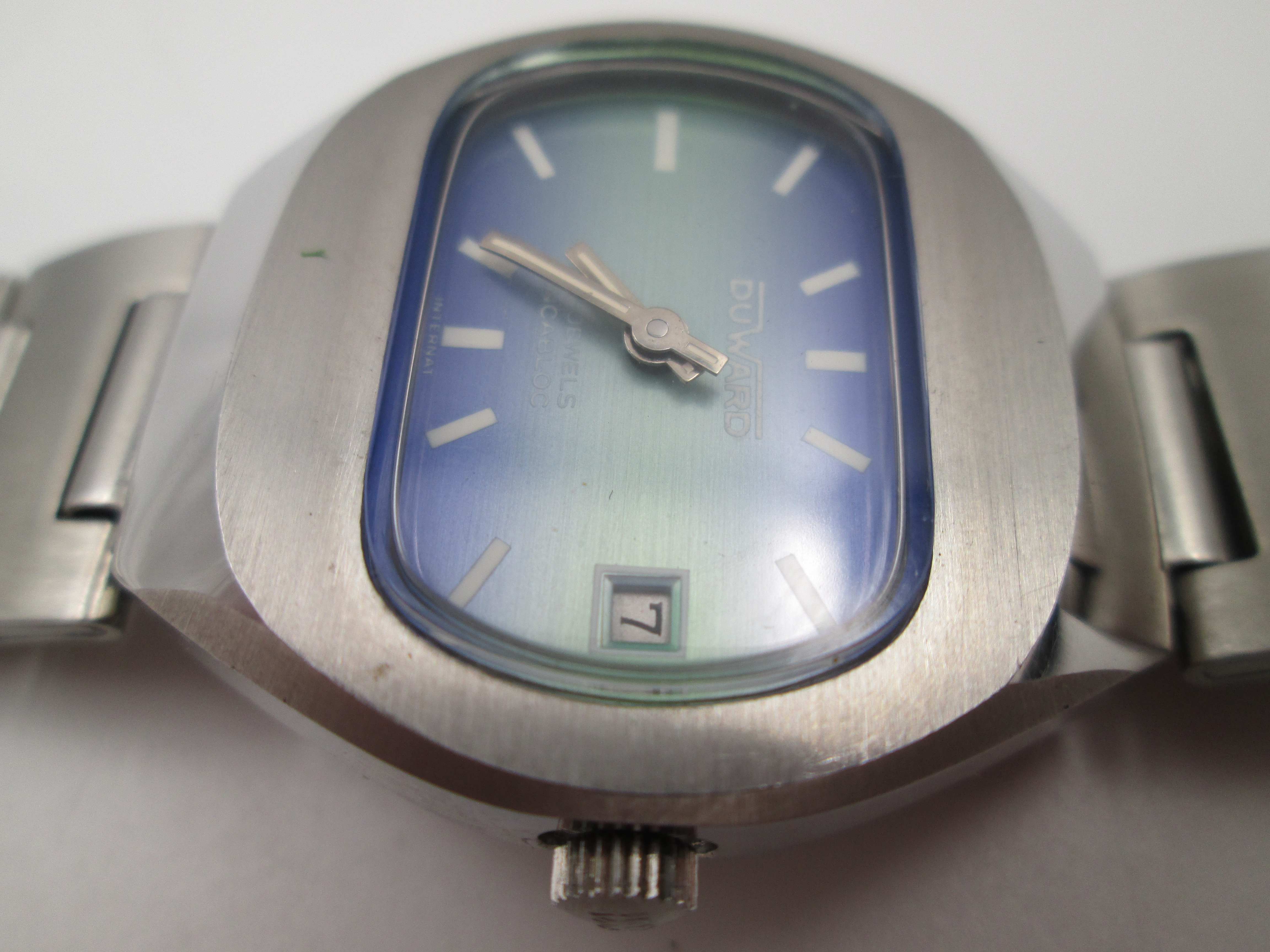 Duward women's watch. Stainless steel. Bitone dial. Calendar. Manual wind. Bracelet. 1970's