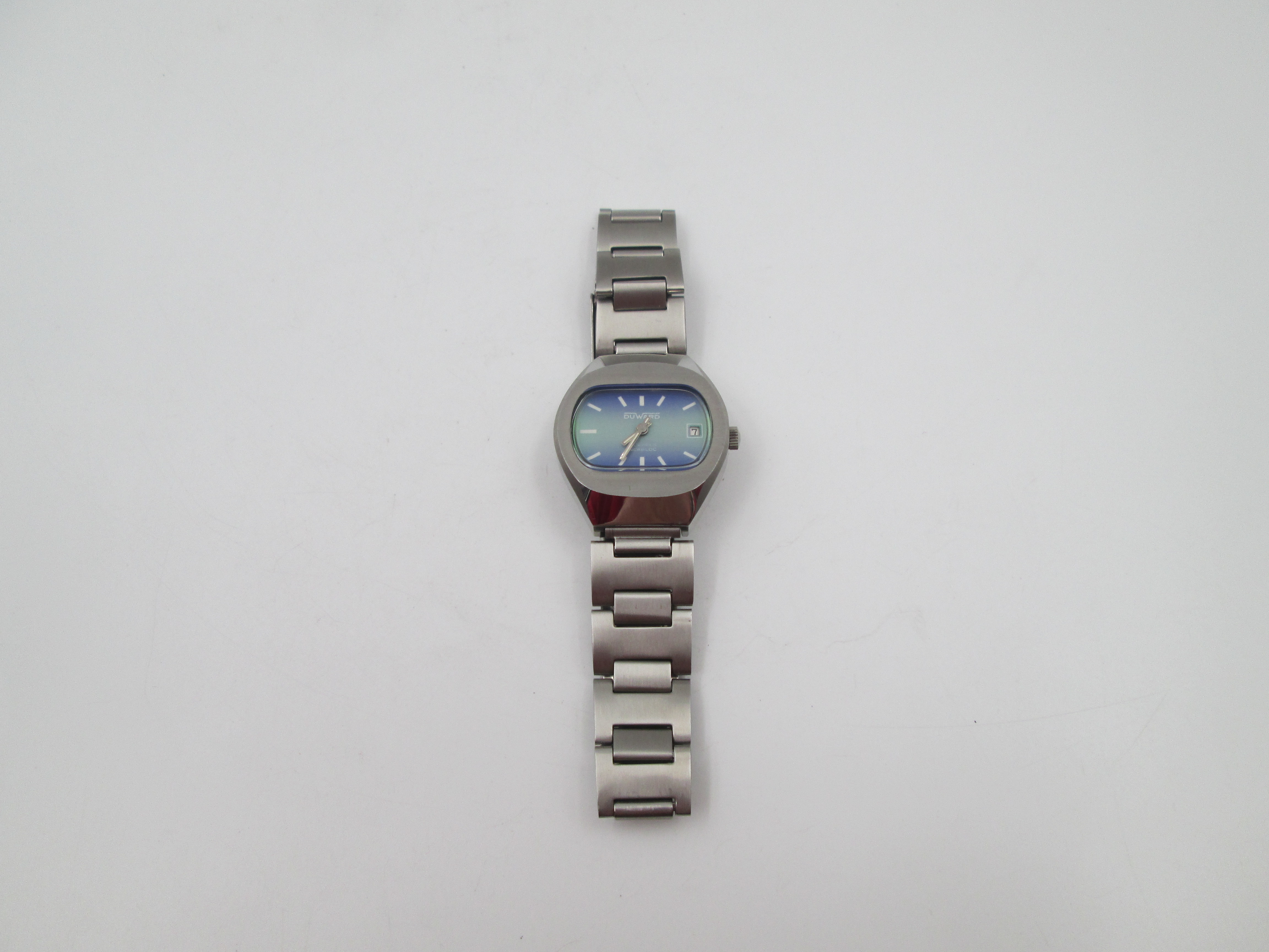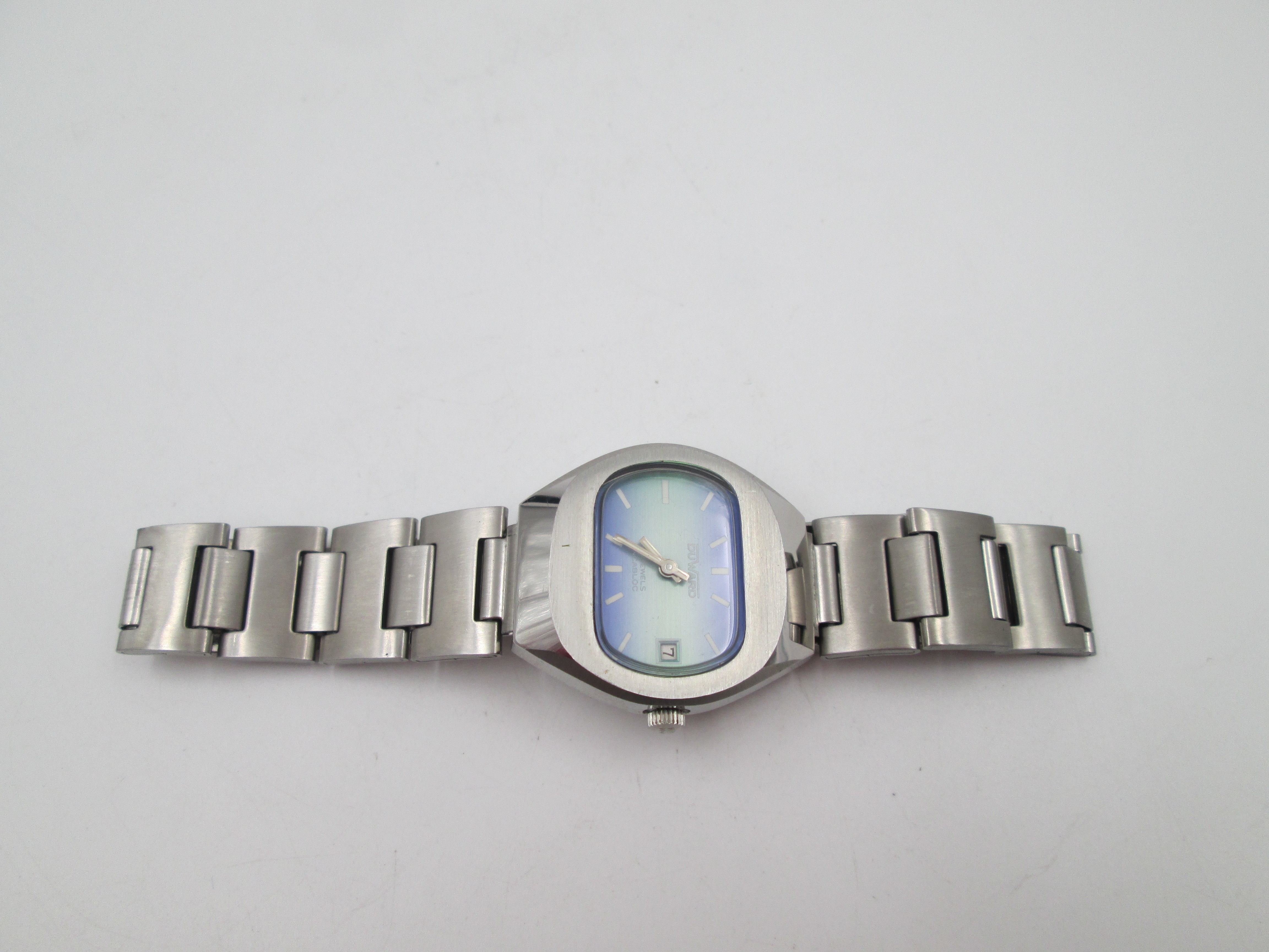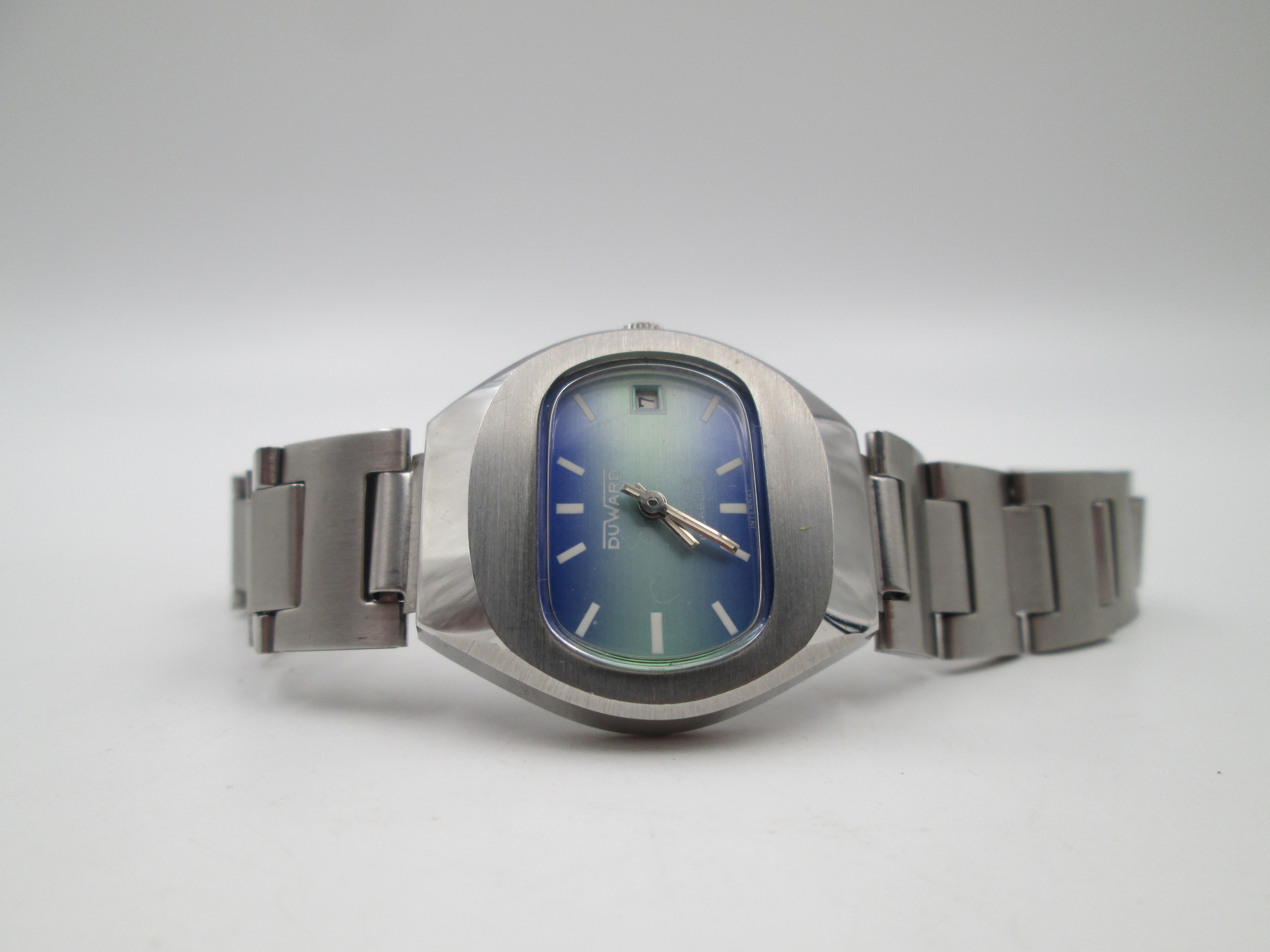 Duward women's watch. Stainless steel. Bitone dial. Calendar. Manual wind. Bracelet. 1970's