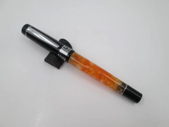 German fountain pen. Orange and black pearl resin. Silver plated details. Golden nib. 2005's