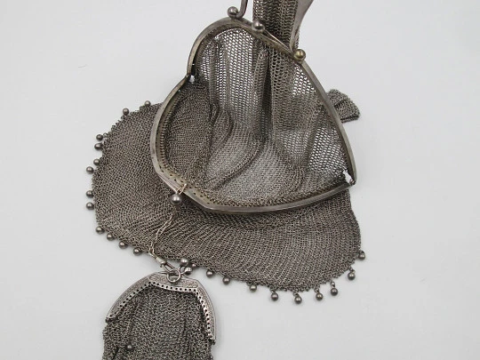 Rare mesh bag with inside purse. Handle and ribbon. 800 sterling silver. Europe. 1920's