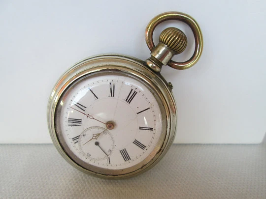 Open face pocket watch. Silver plated metal. Stem-wind. Circa 1910's. Swiss