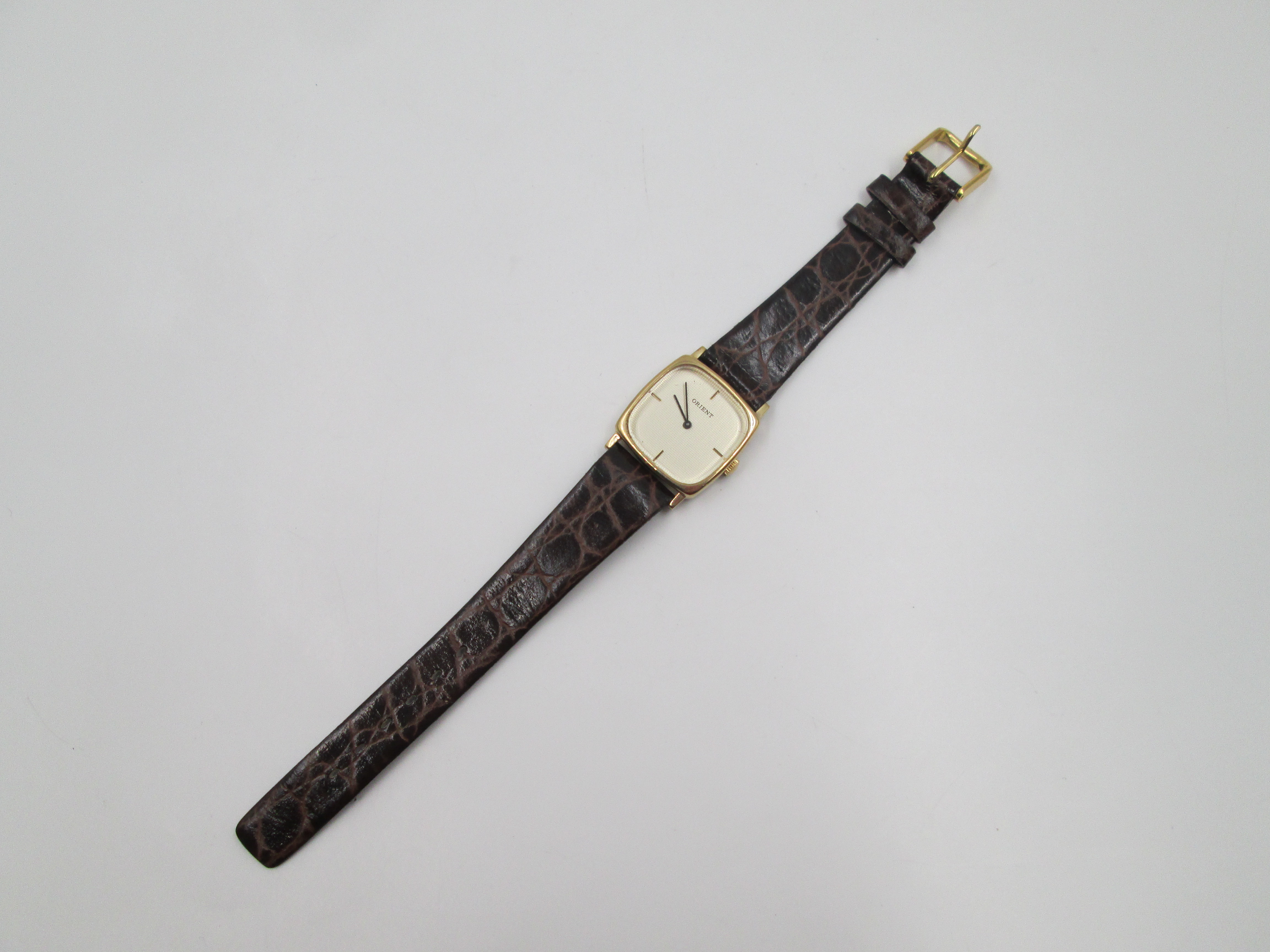 Golden metallic dial with guilloche. Black & gold markers and hands.