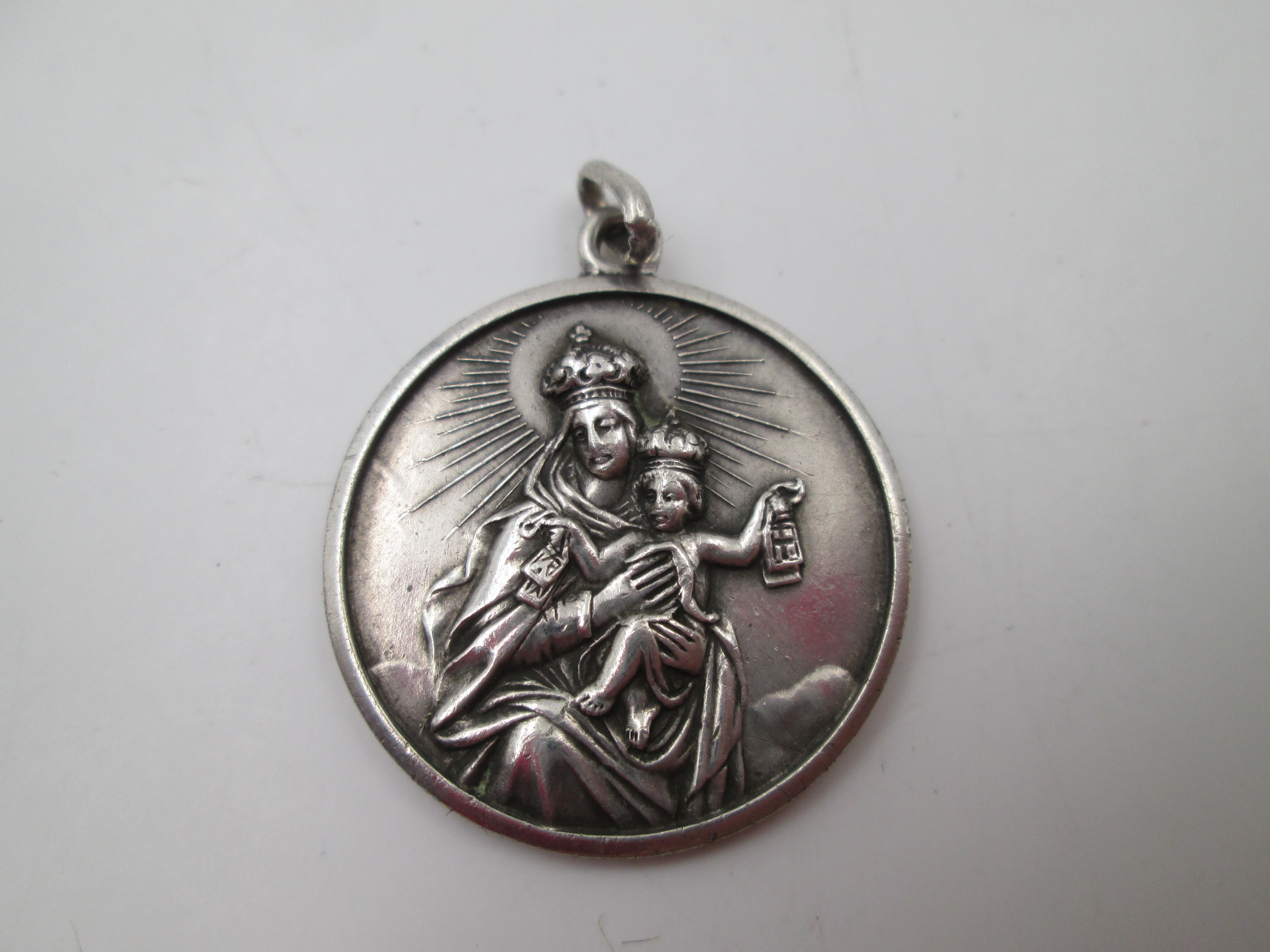 Our Lady of Carmel with Child and scapulars medal. Sterling silver. Europe. 1960's
