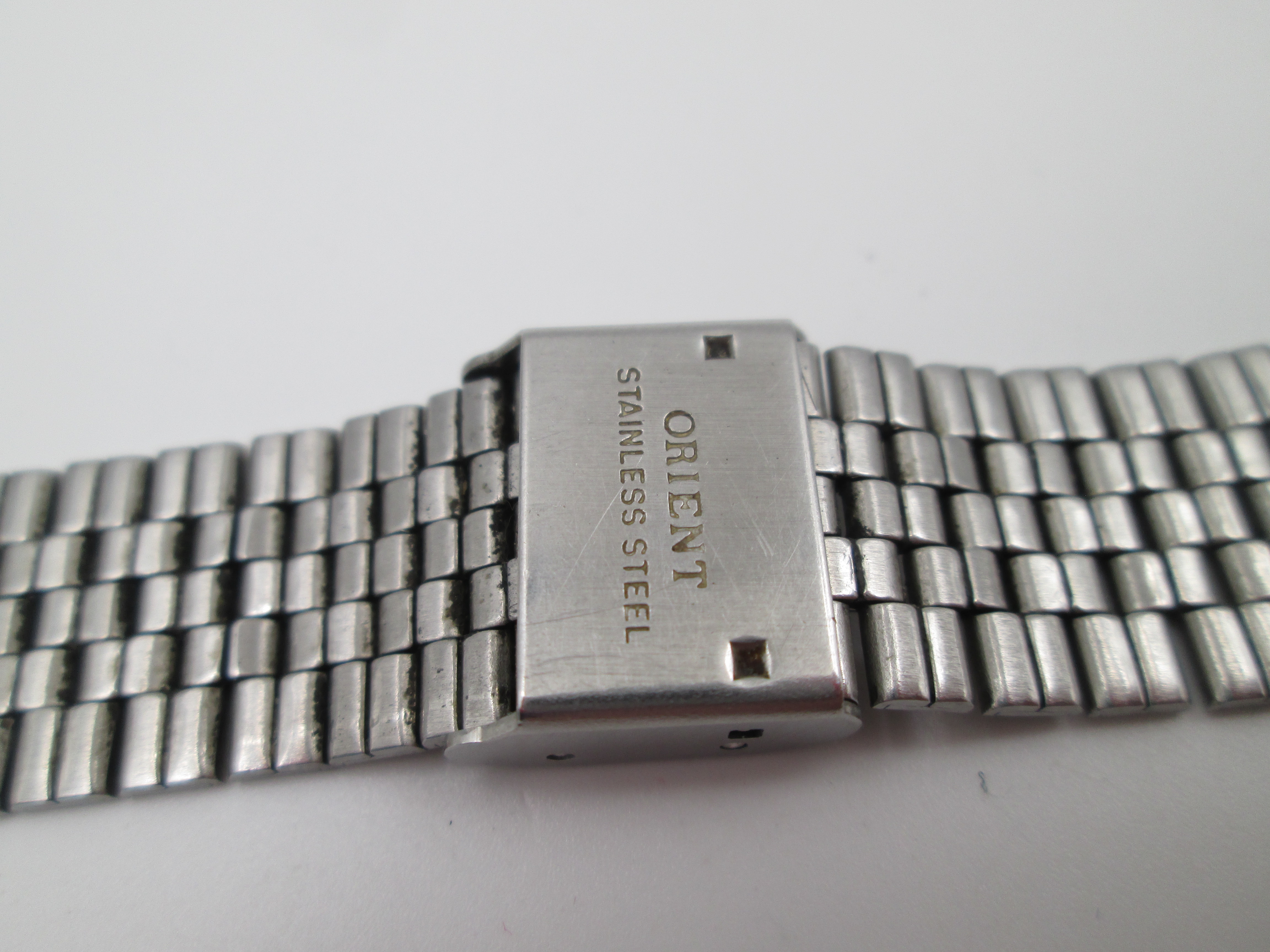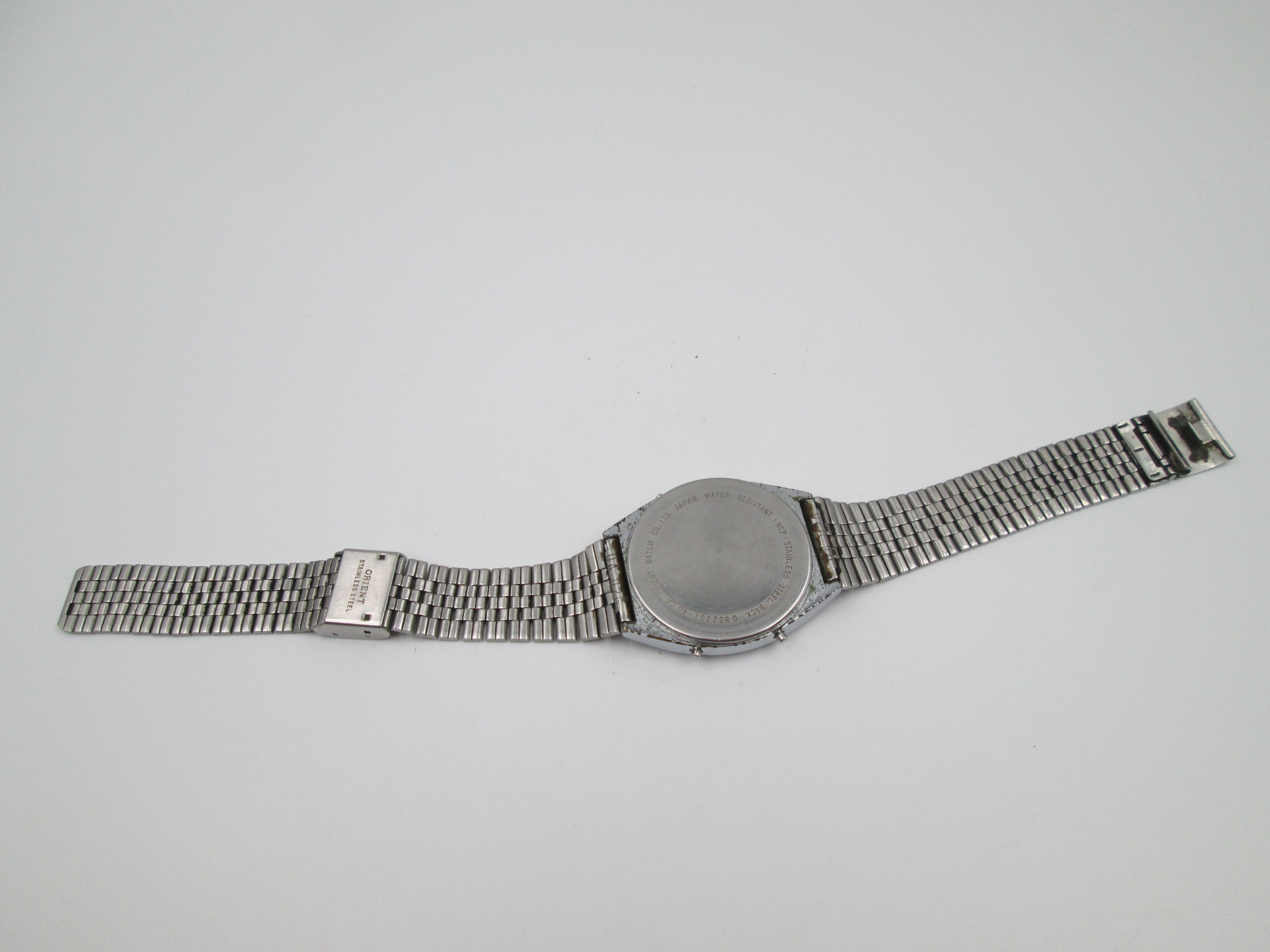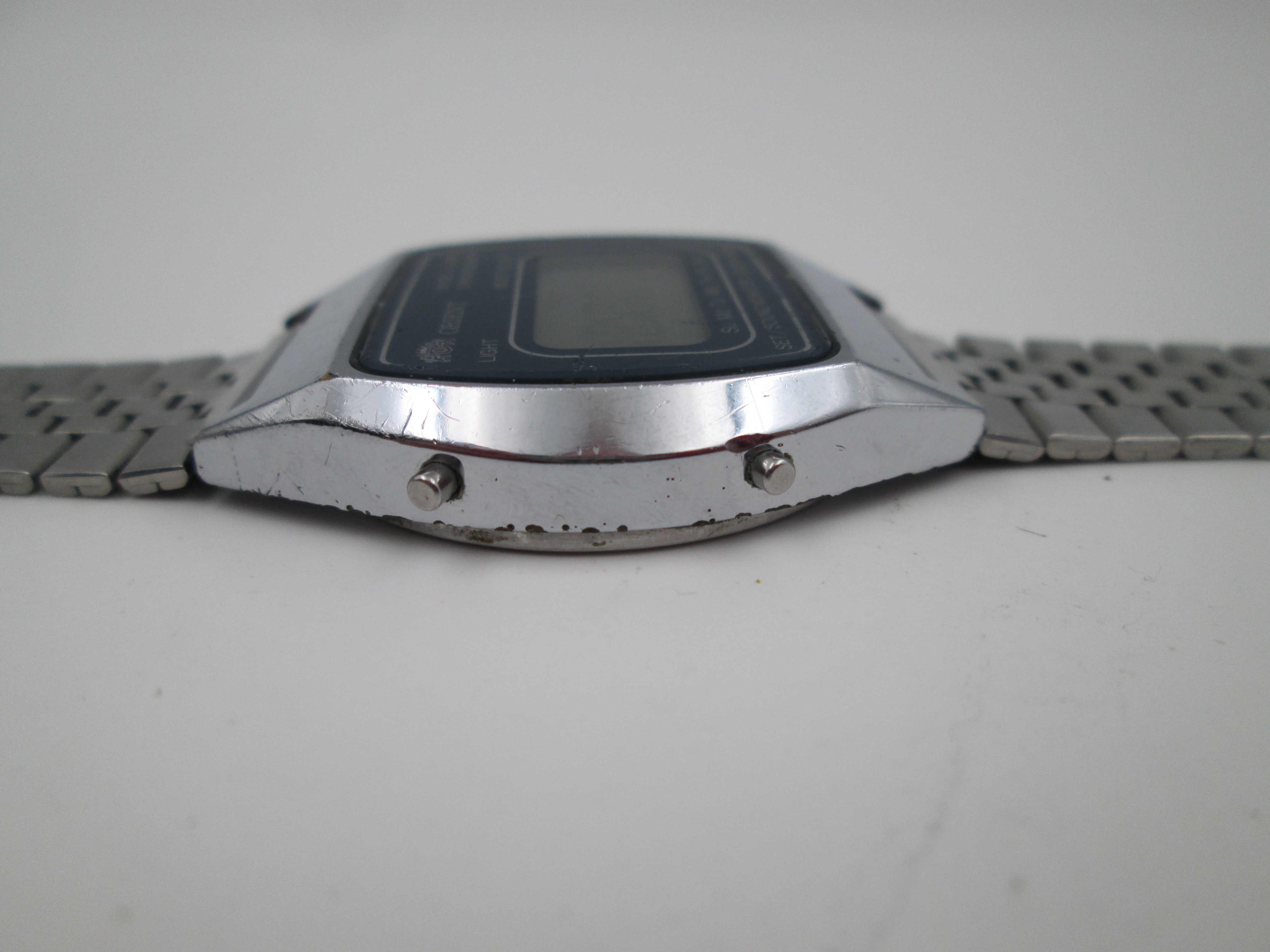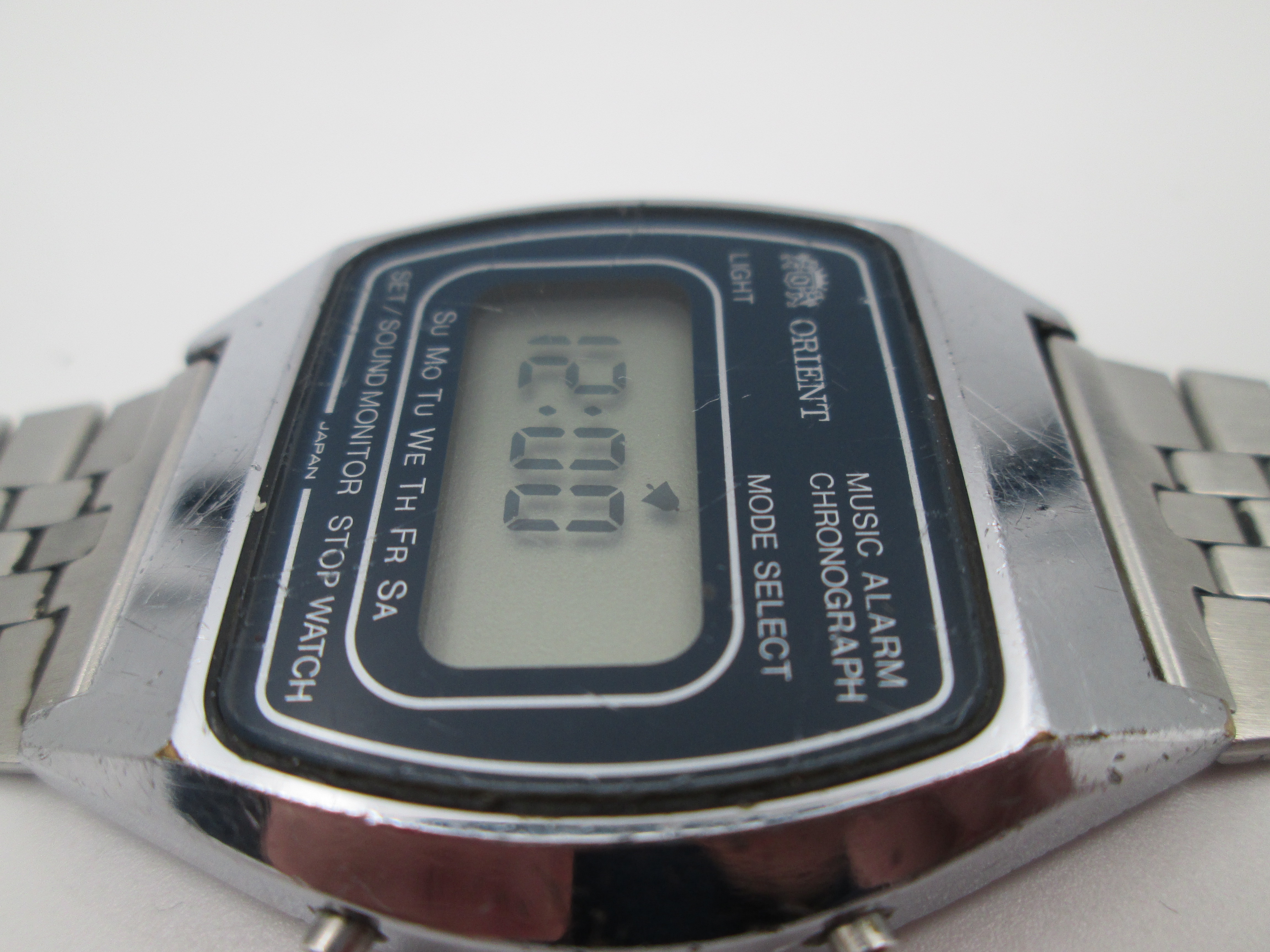 Rare Orient digital chronograph. Chrome-plated metal & stainless steel. Bracelet. 1970