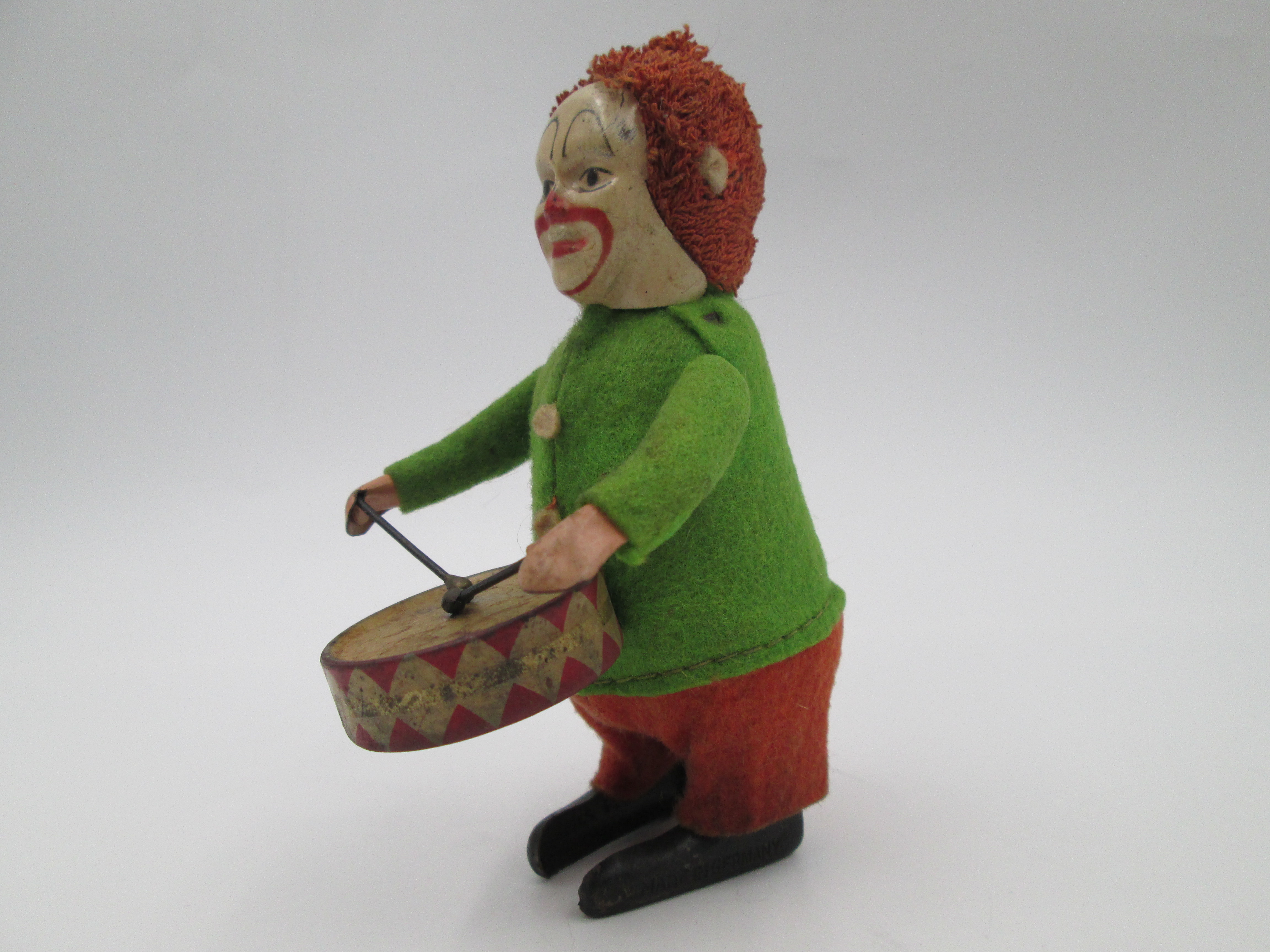 Schuco drummer clown clockwork toy. Tinplate and colours felt. Germany. 1930's
