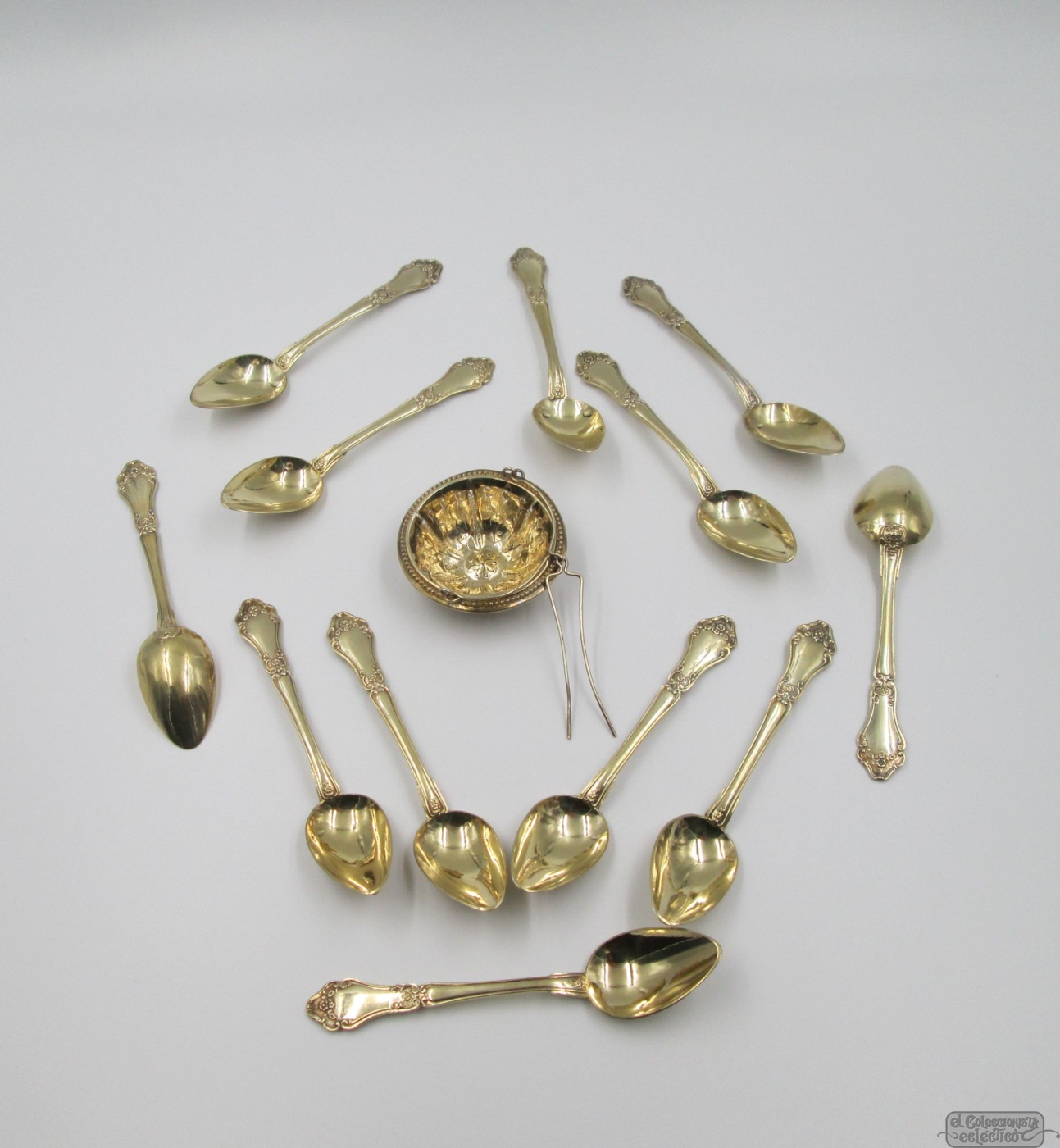 Set twelve dessert spoons & tea strainer. 800 vermeil silver. 1900's