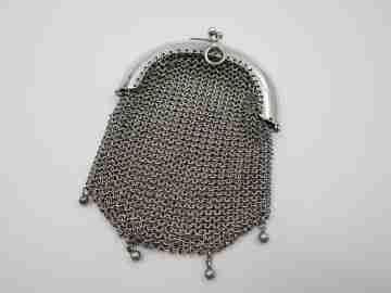 Sterling silver double mesh purse. Half moon clutch frame. Balls clasp. 1920