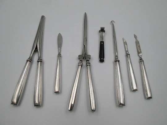 Sterling silver dresser set. Seven tools. Circa 1930's. Spain. Green case