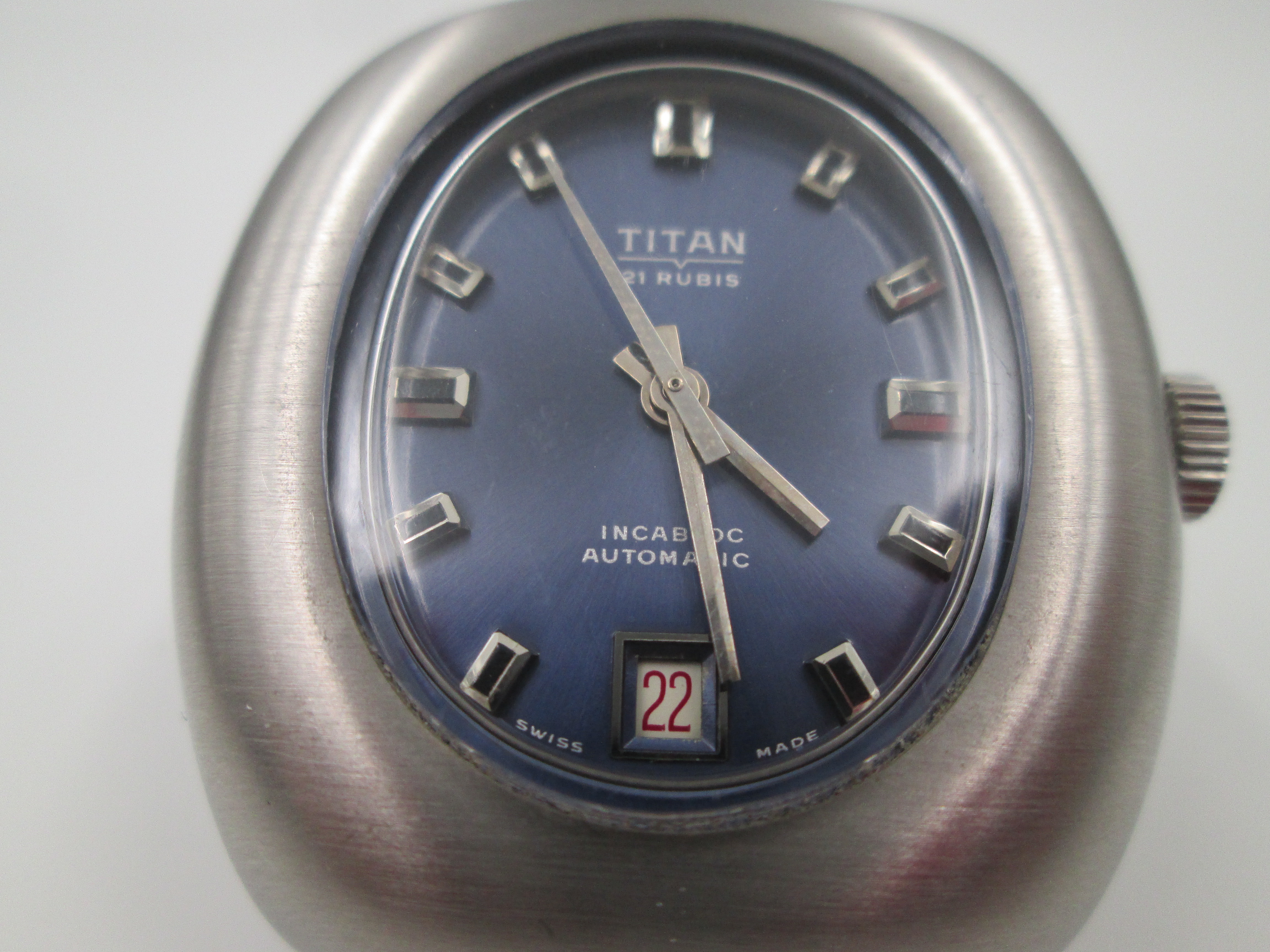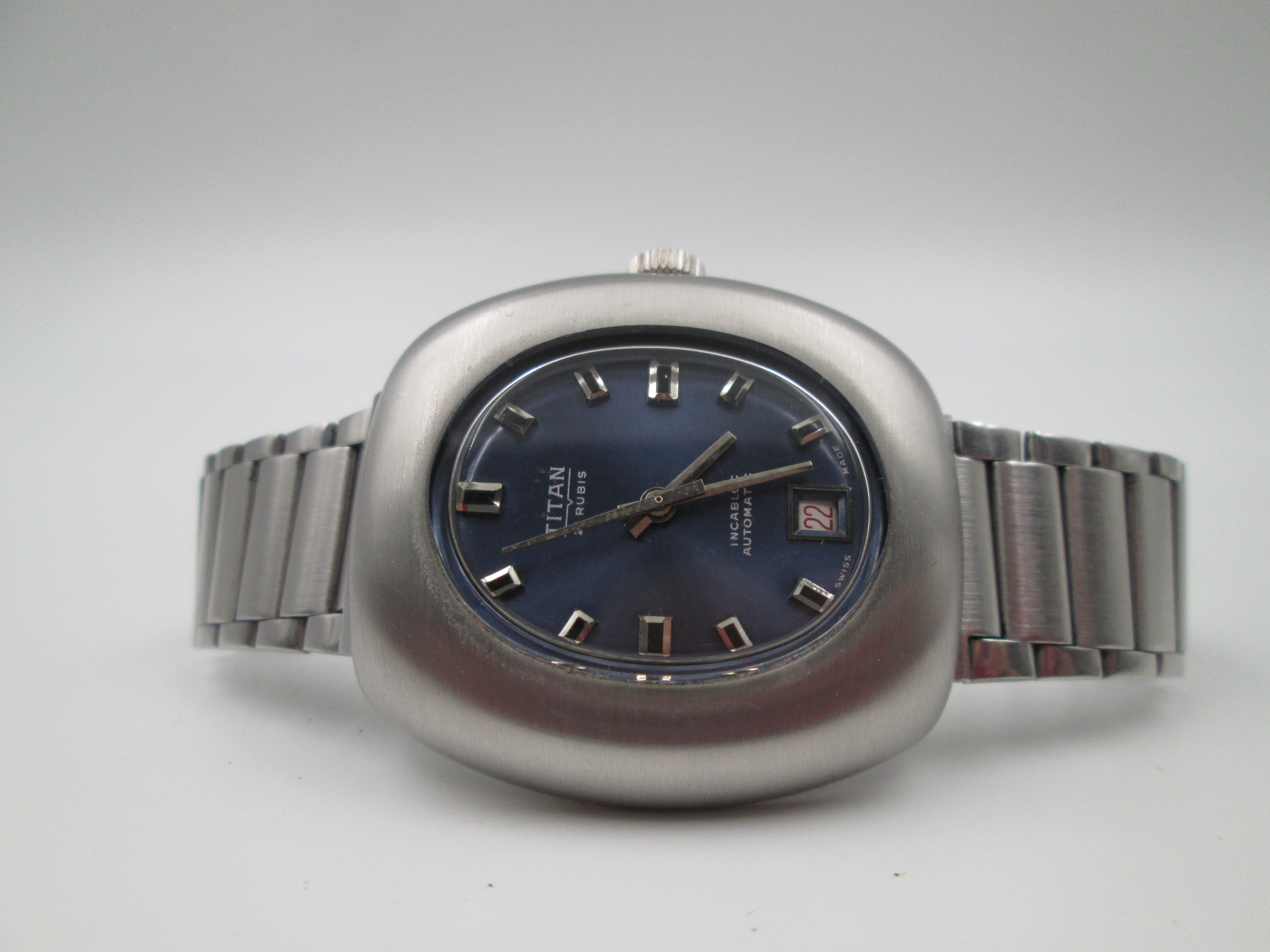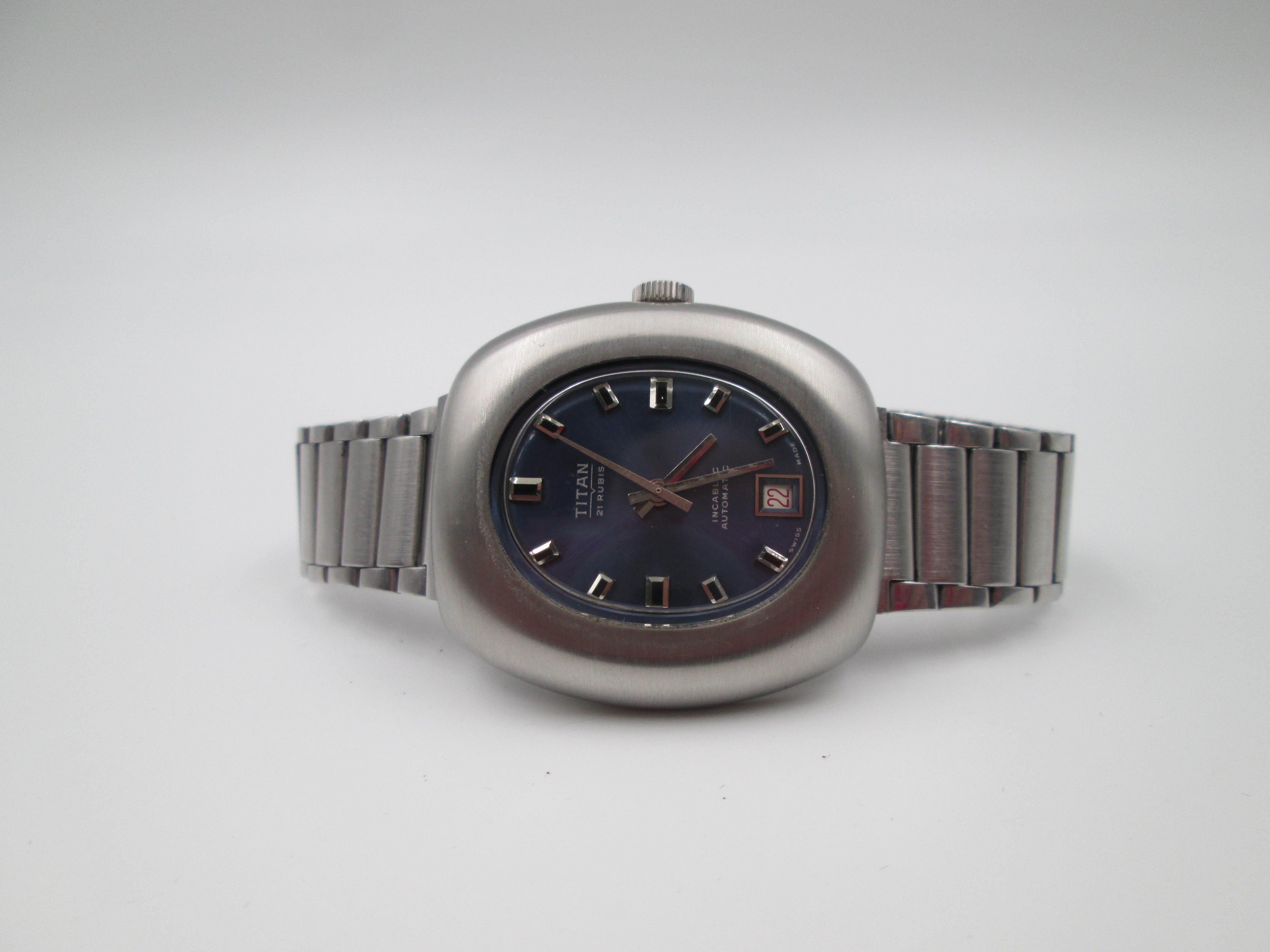 Titan. Stainless steel. Automatic. Bracelet. Blue sphere. Calendar. Box. 1970's. Swiss