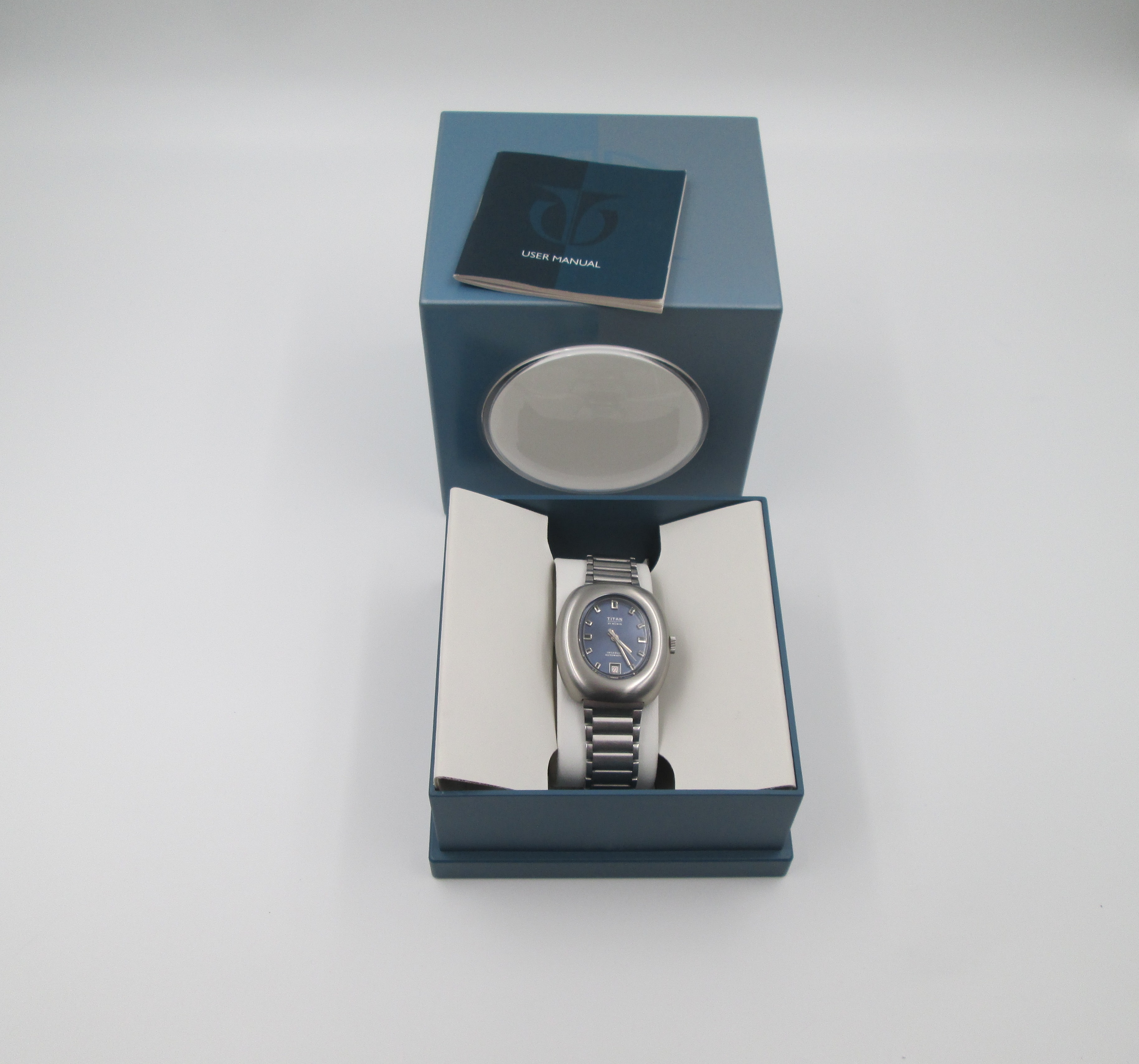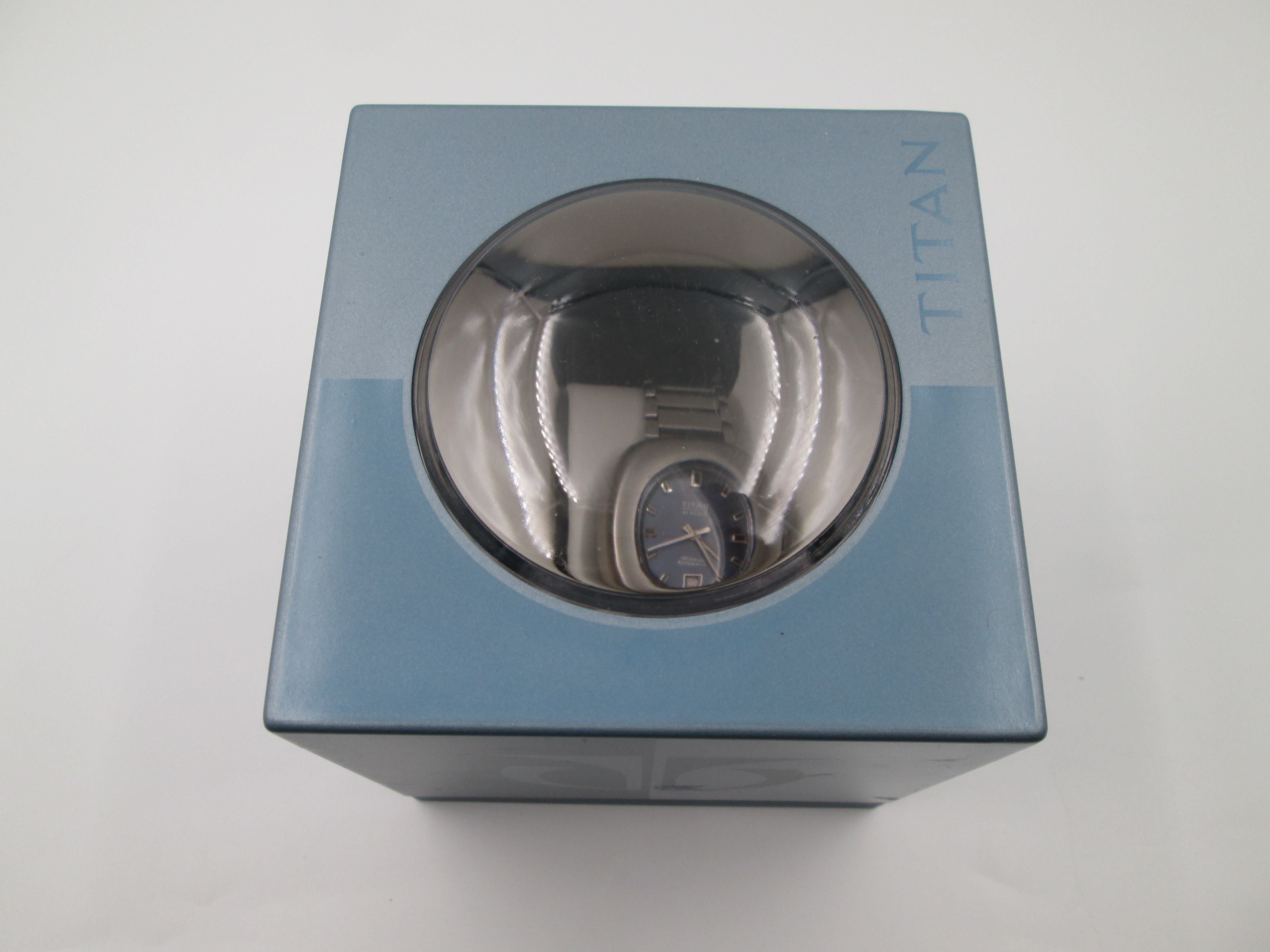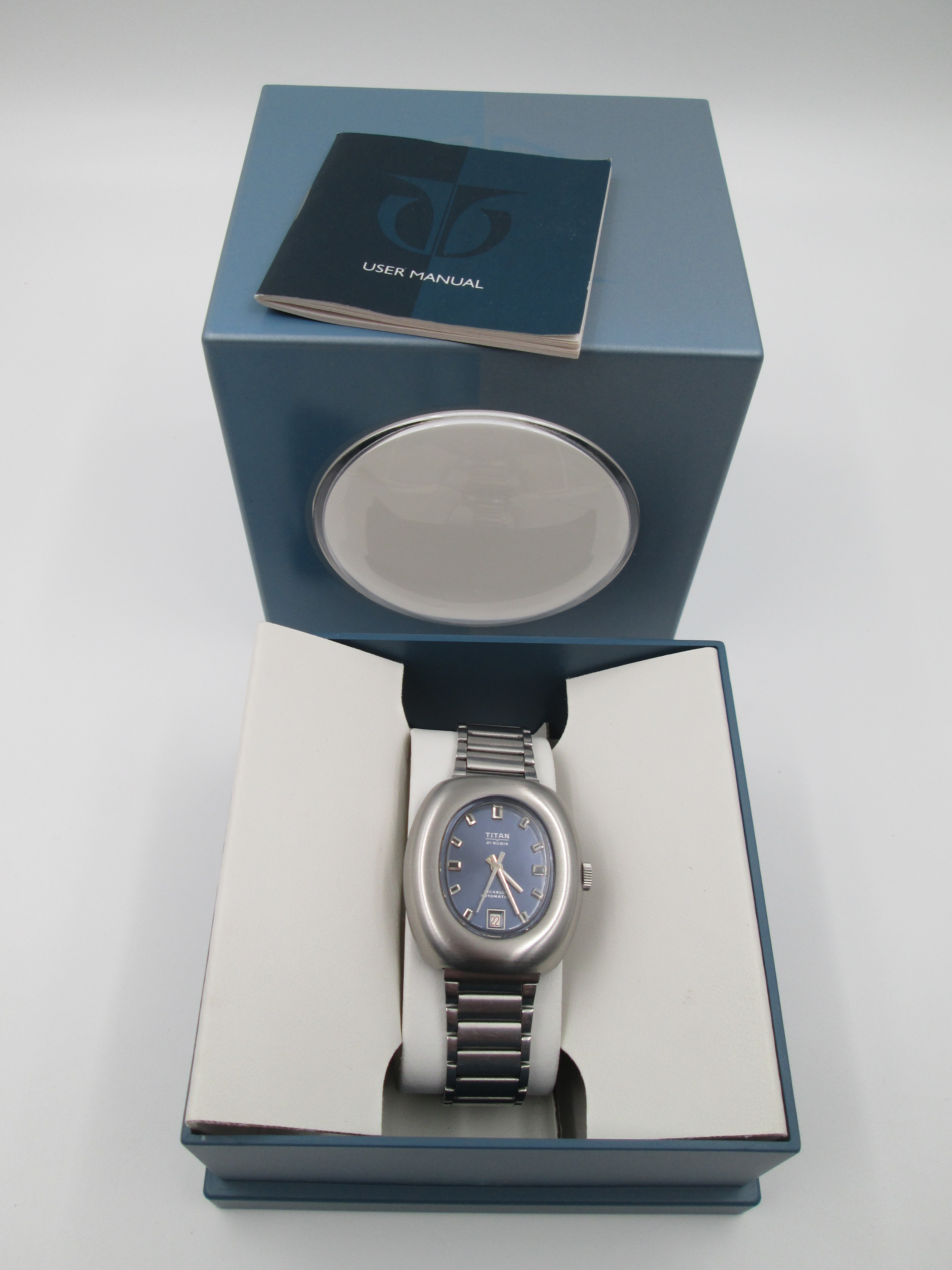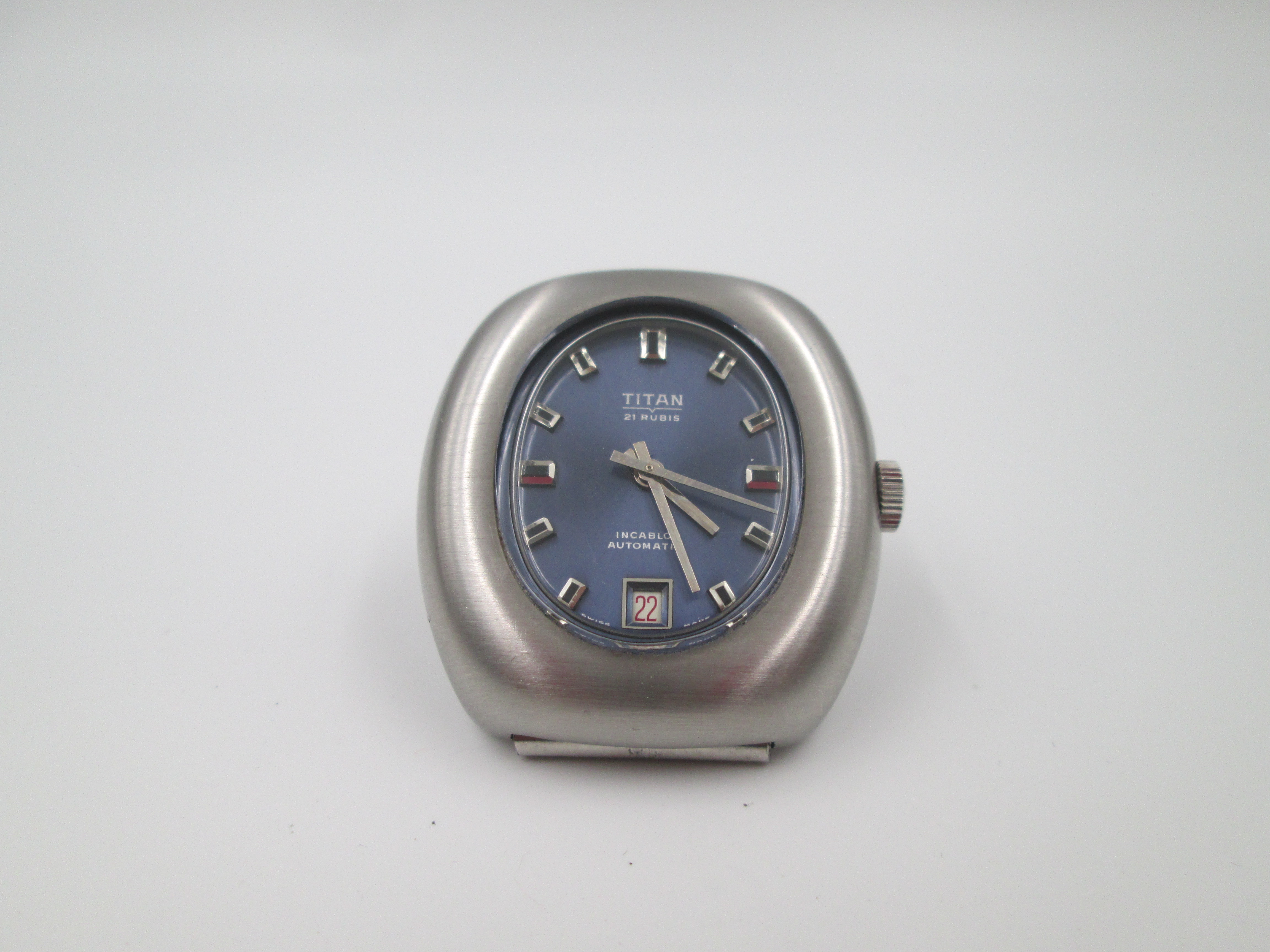 Titan. Stainless steel. Automatic. Bracelet. Blue sphere. Calendar. Box. 1970's. Swiss