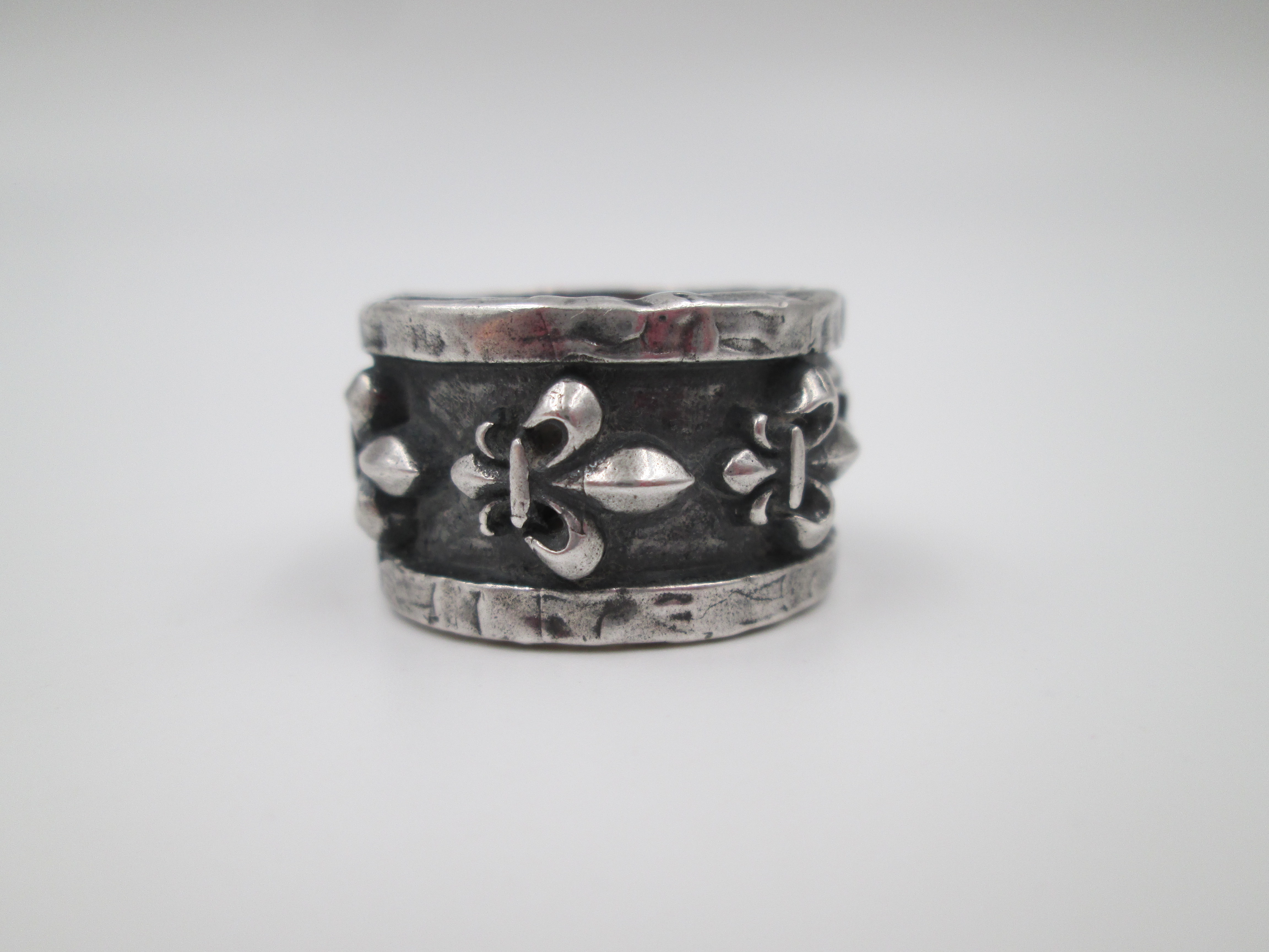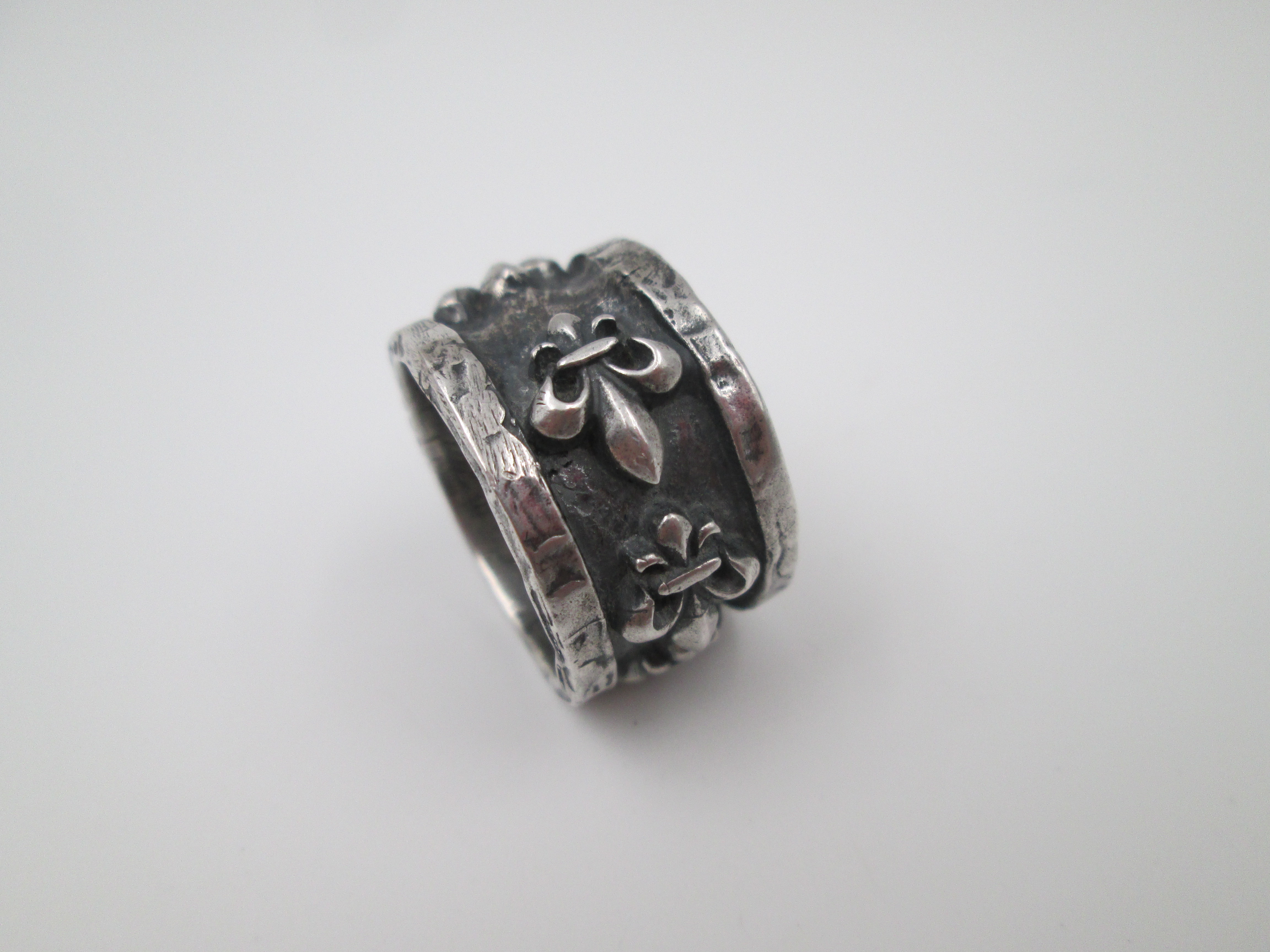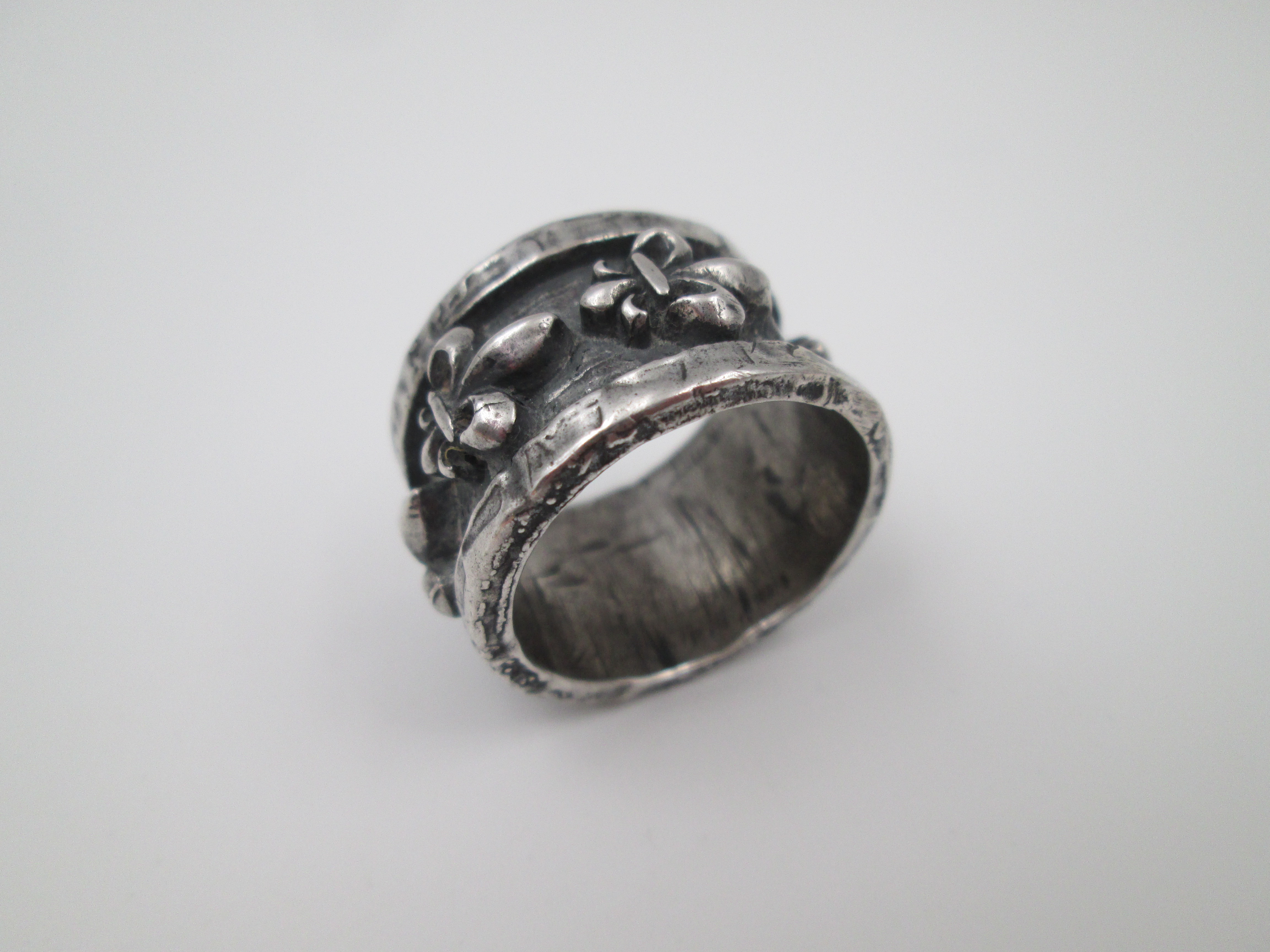 Unisex broad ring. Sterling silver. Fleur-de-lis relief ornaments. Europe. 1990's