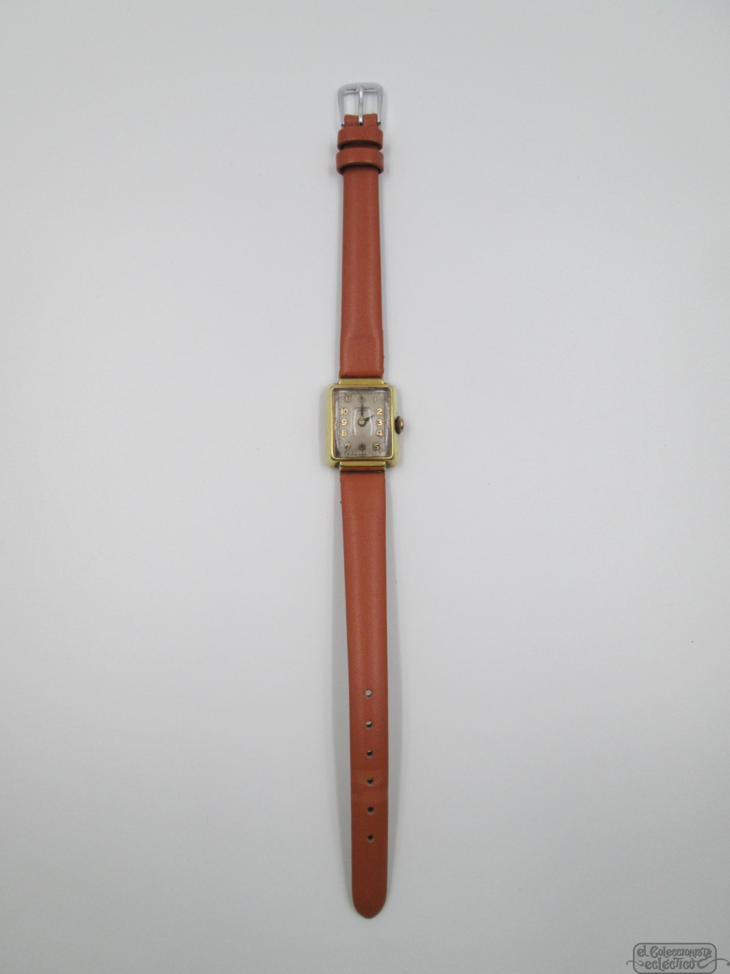 Gold plated rectangular case and steel back.