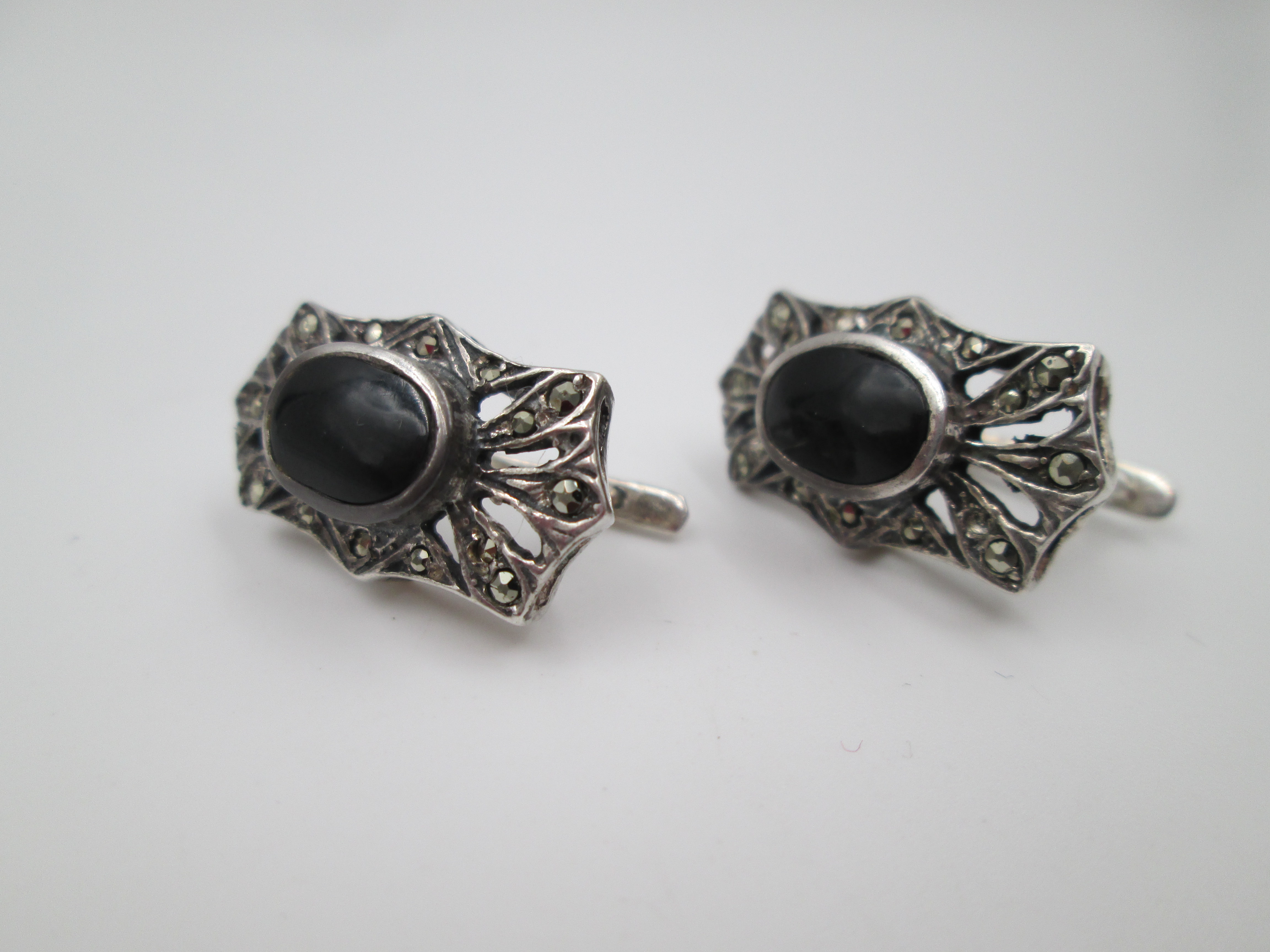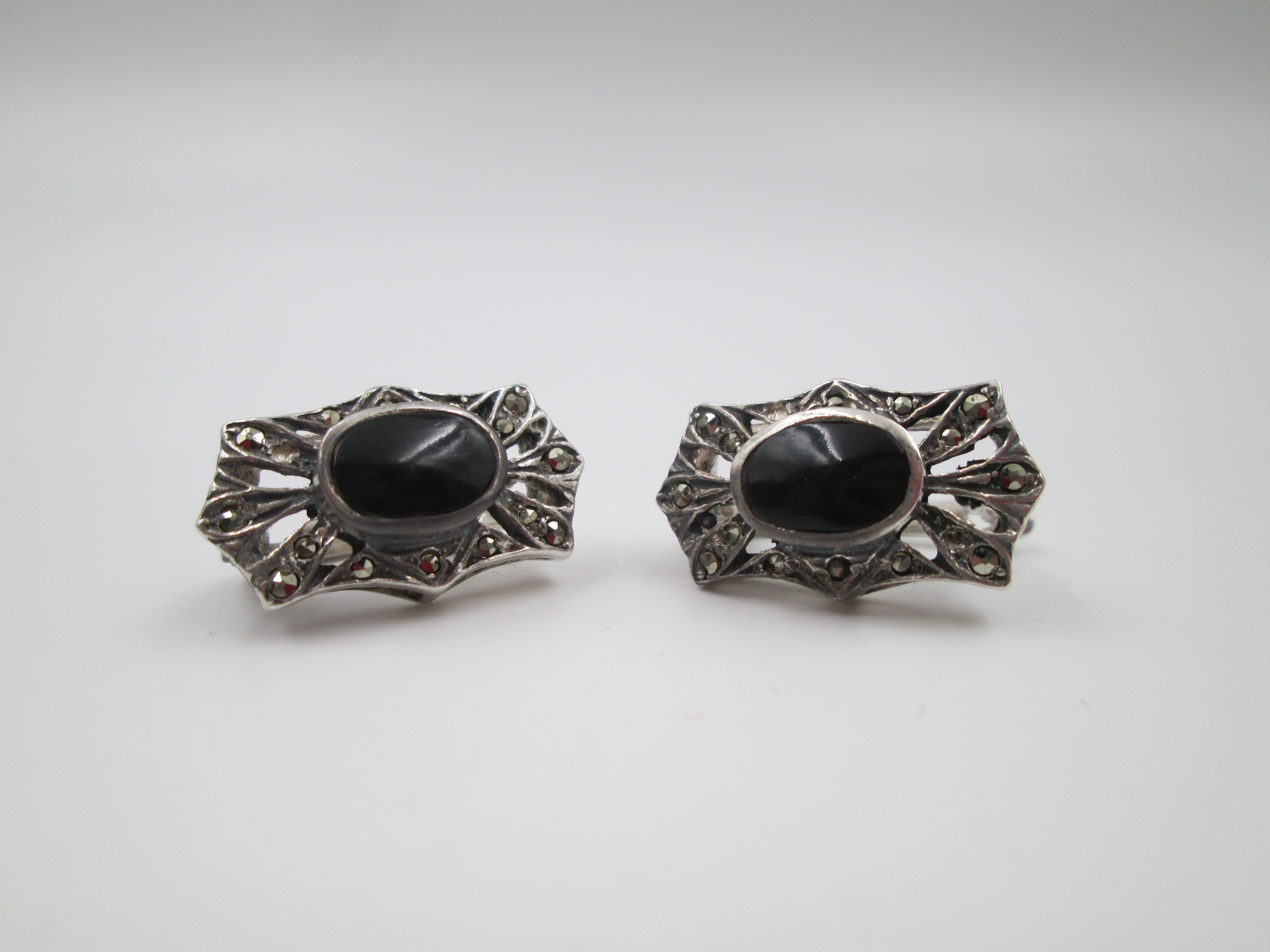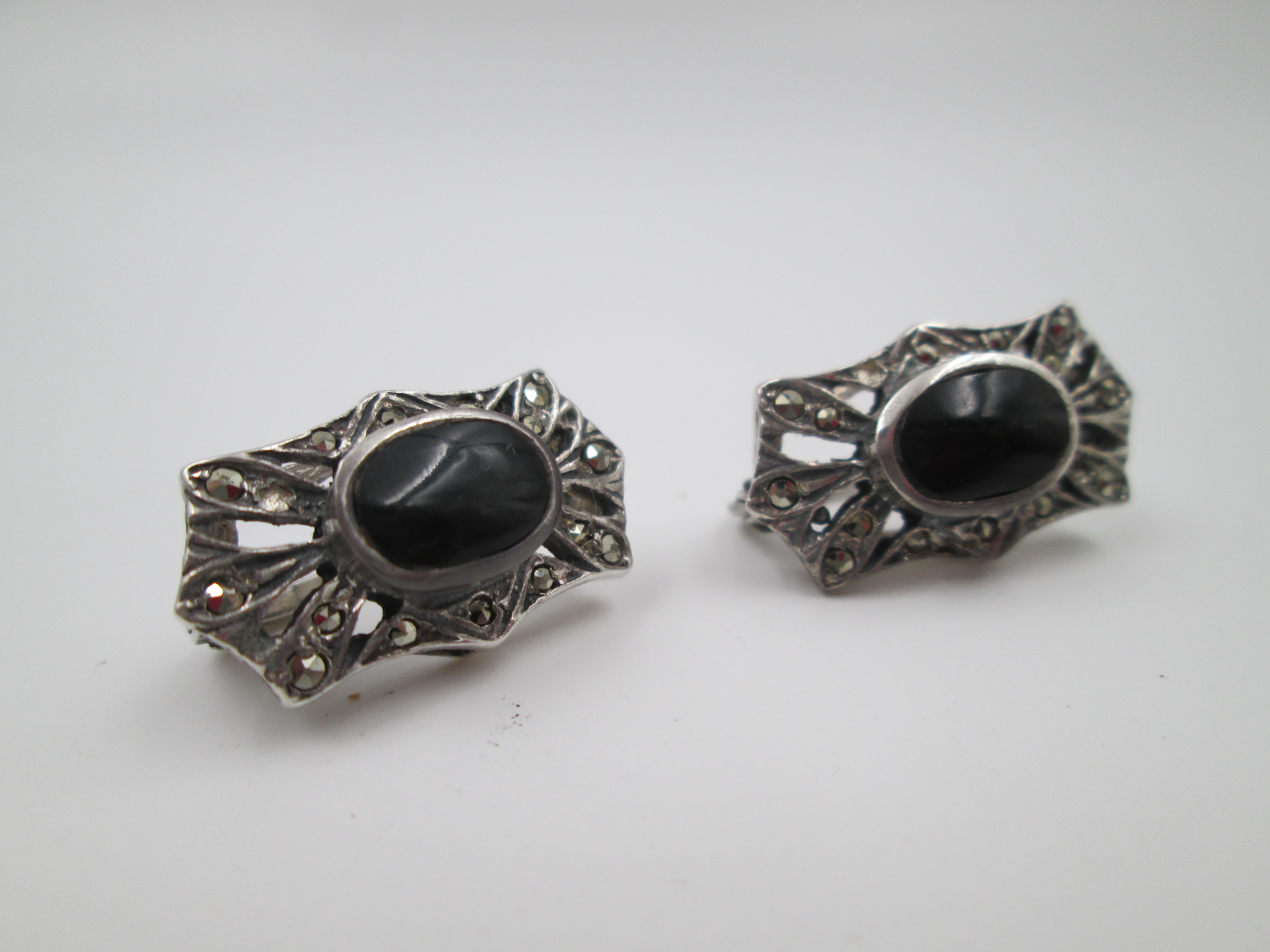 Women's art deco style earrings. Sterling silver. Marcasite and black stones. 1970's