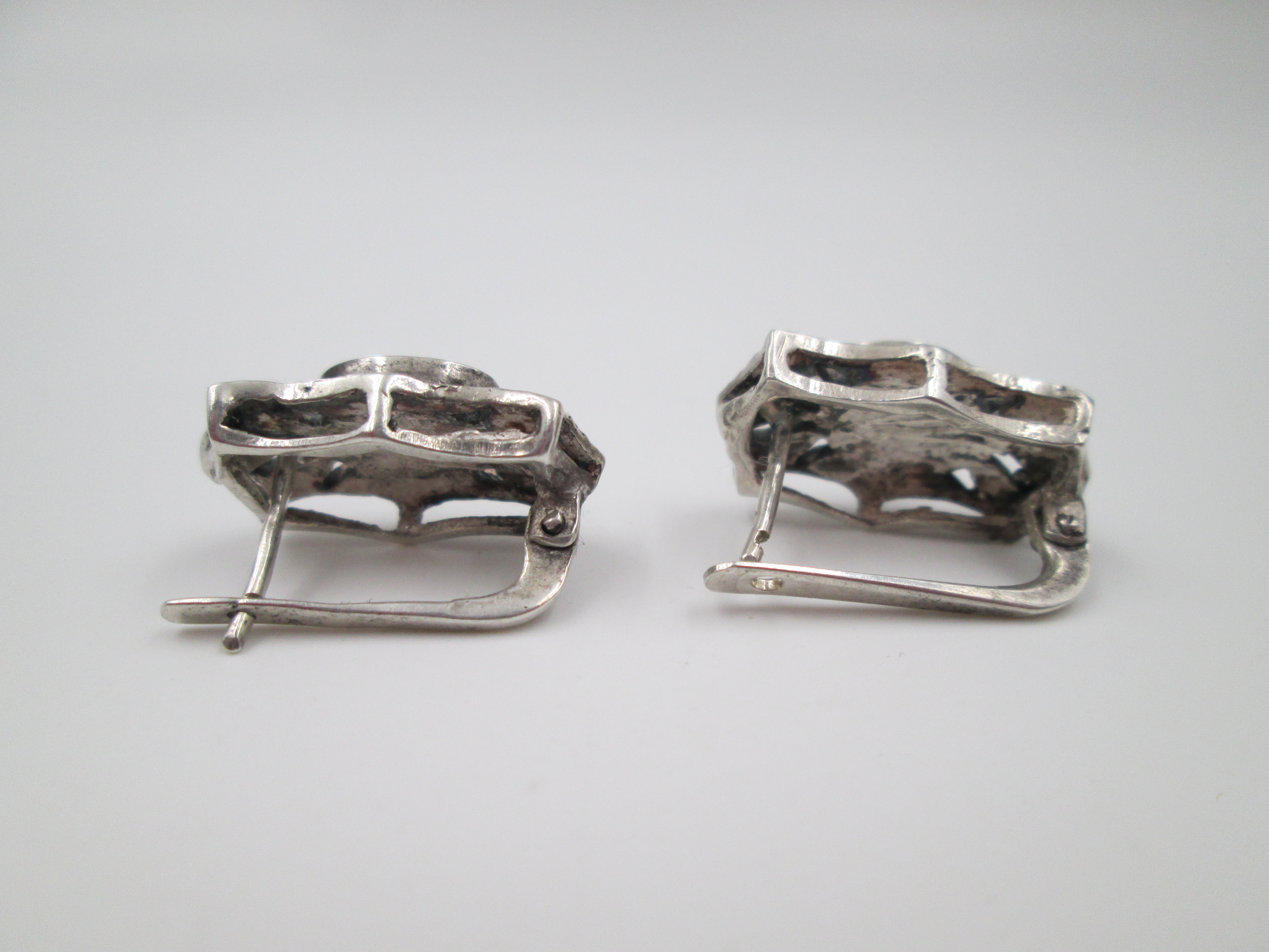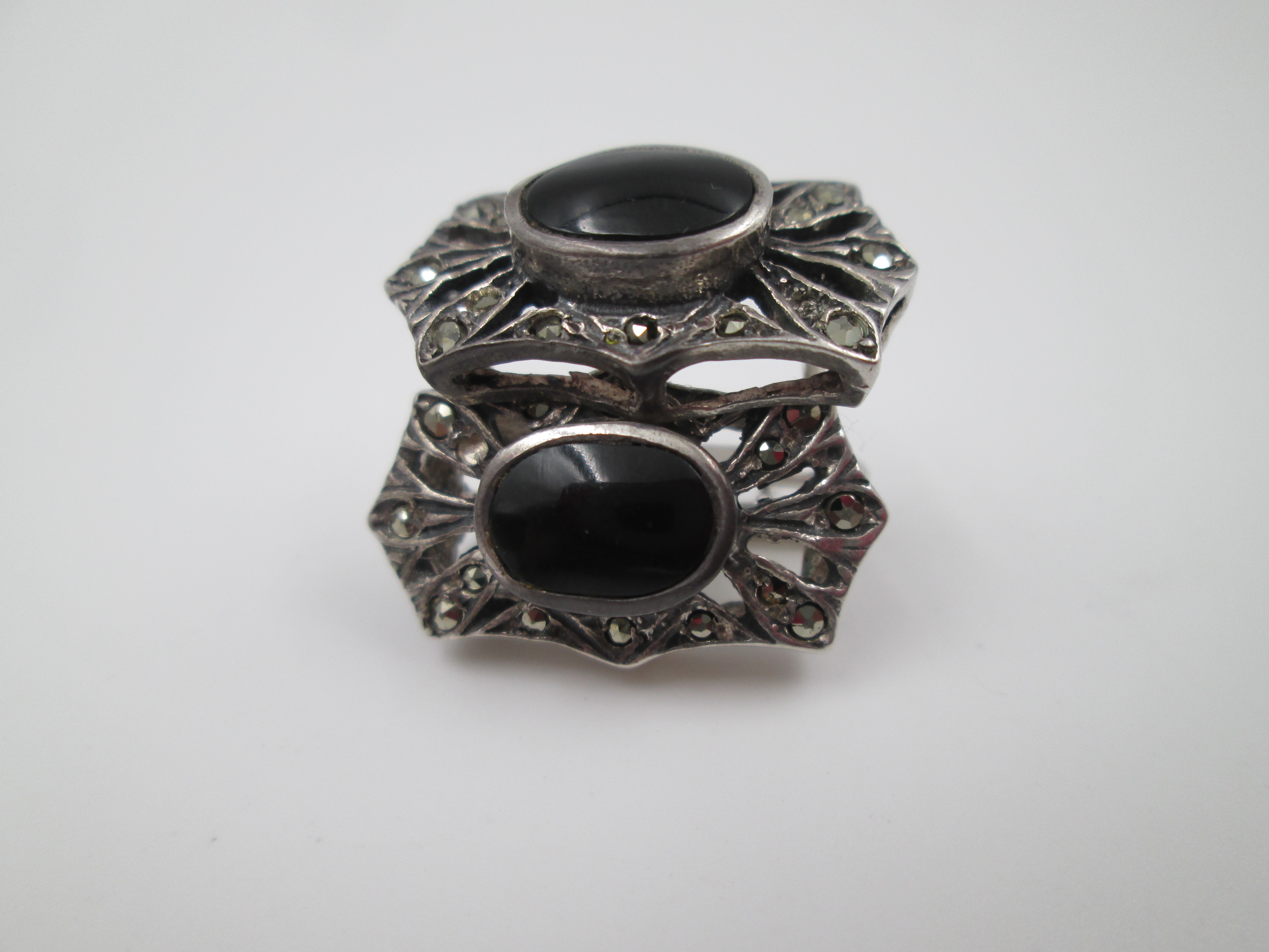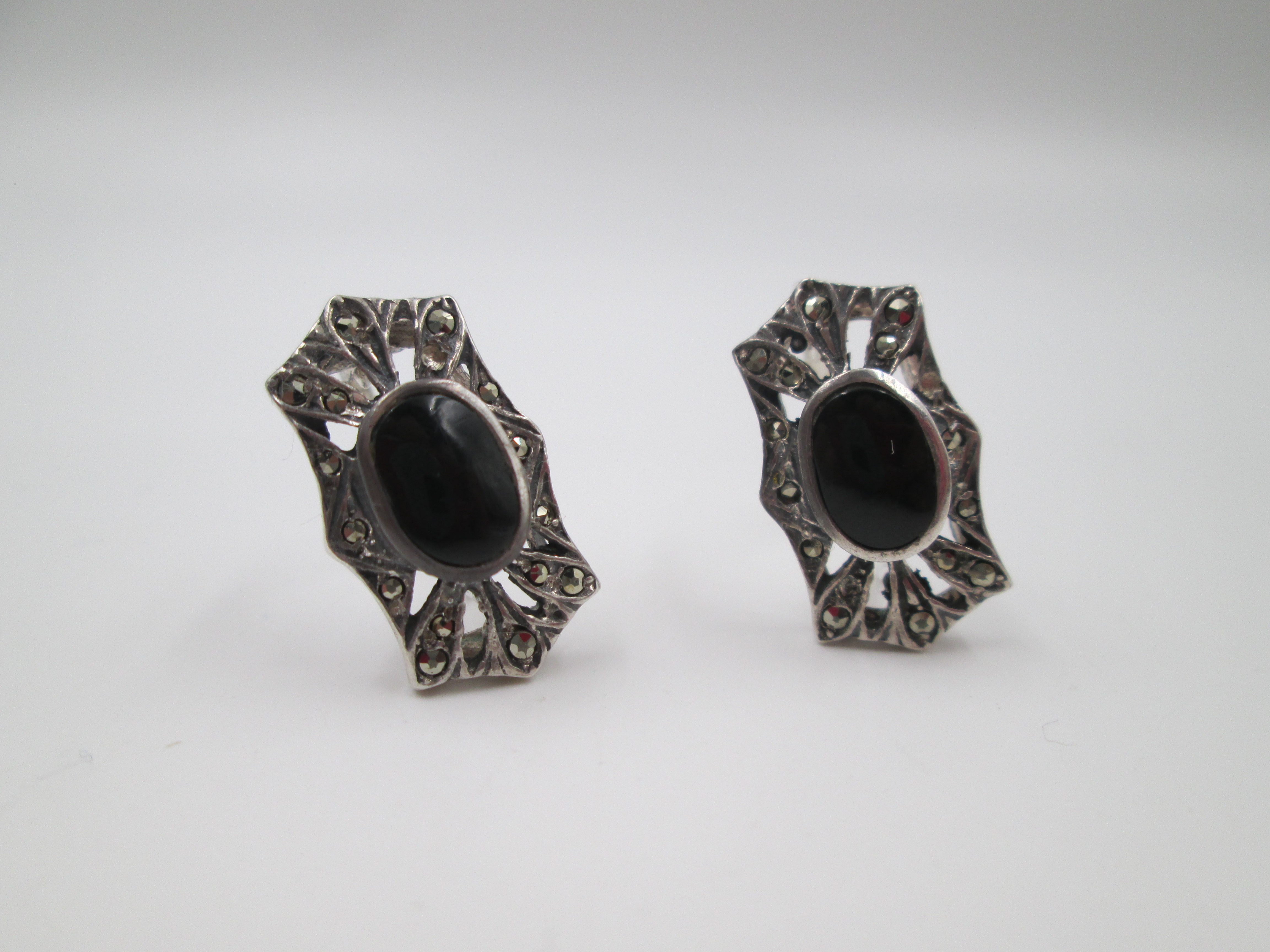 Women's art deco style earrings. Sterling silver. Marcasite and black stones. 1970's