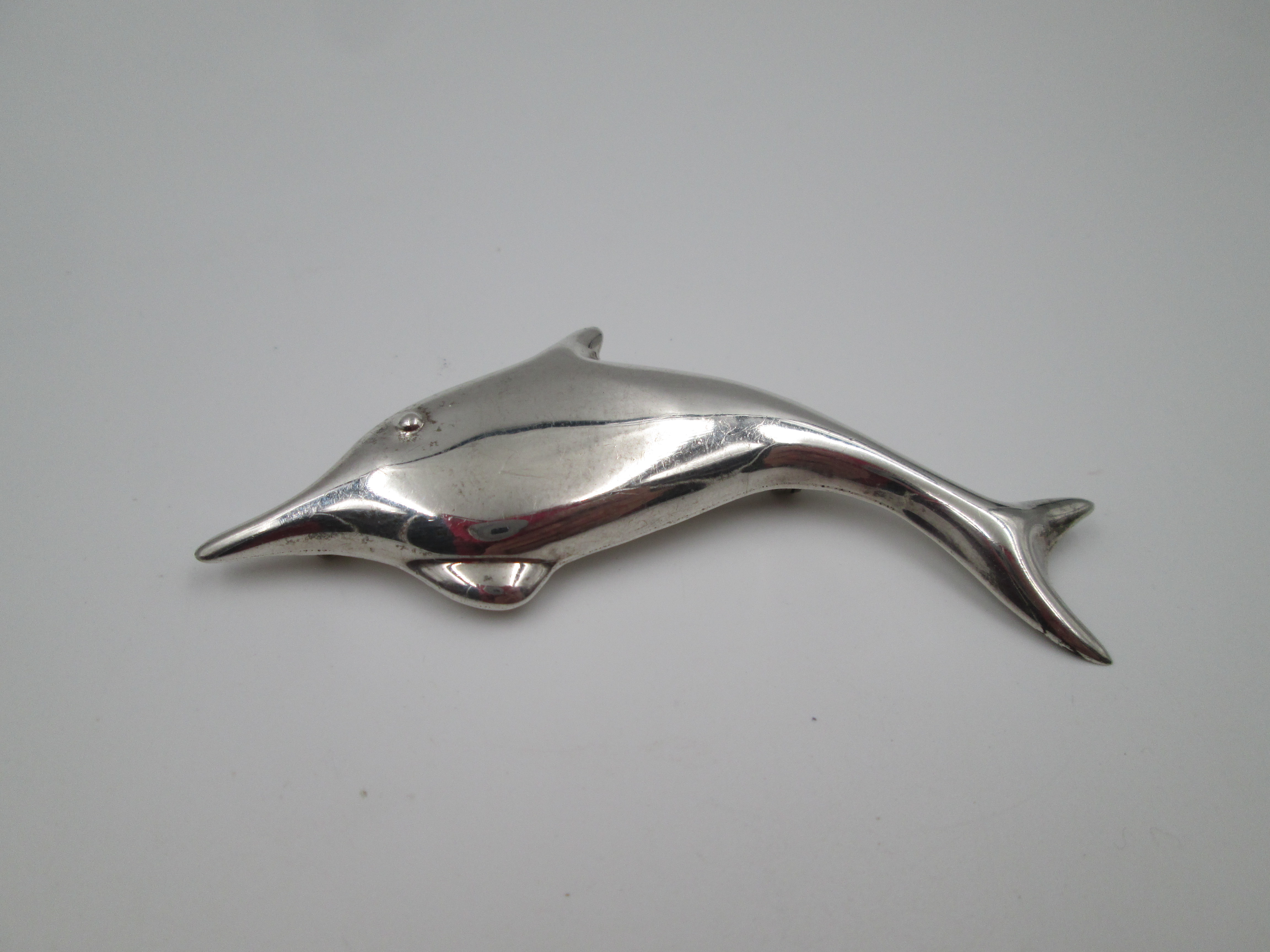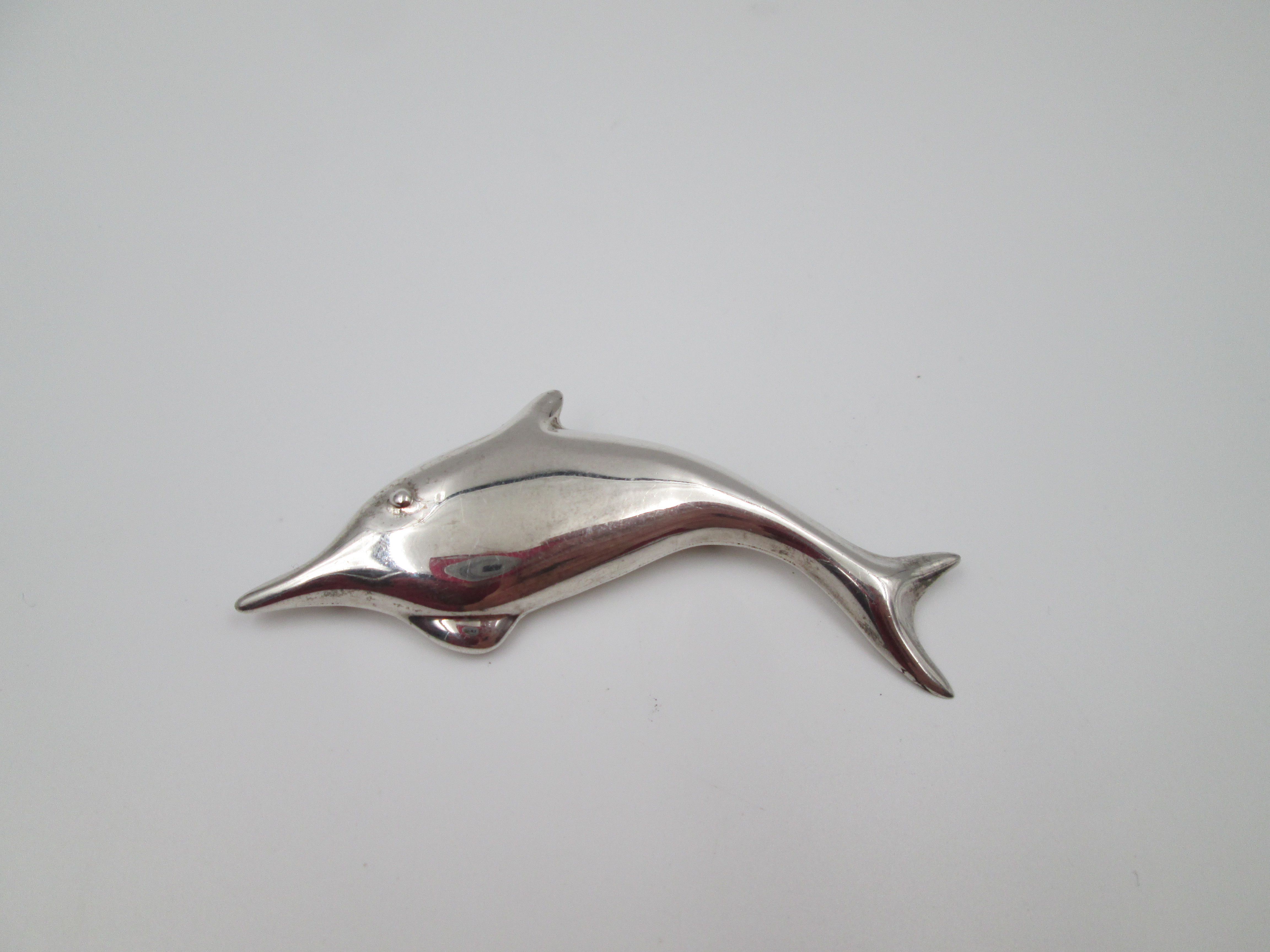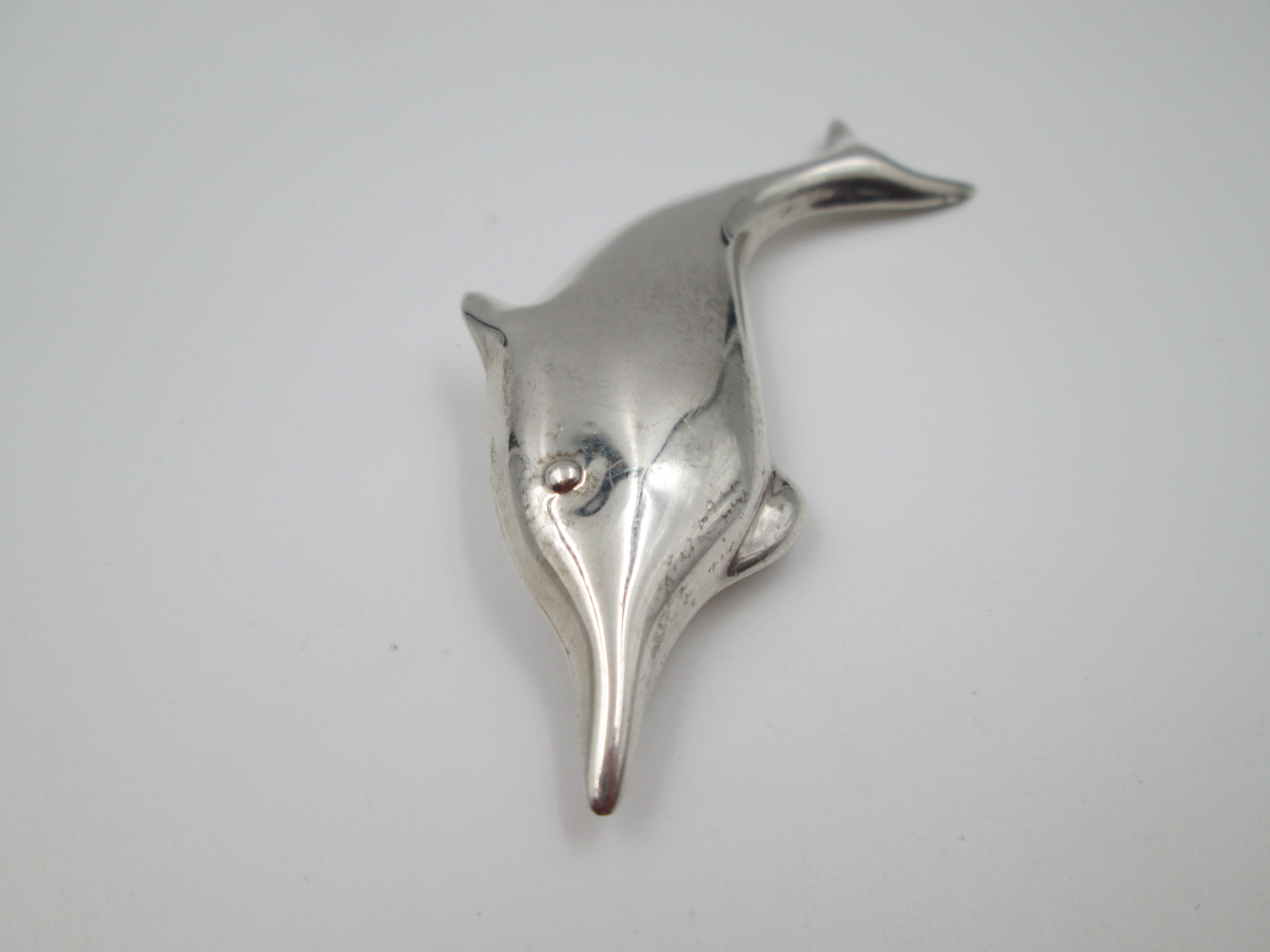 Women's brooch. 925 sterling silver. Swimming dolphin figure. Pin on back. Mexico. 1960's