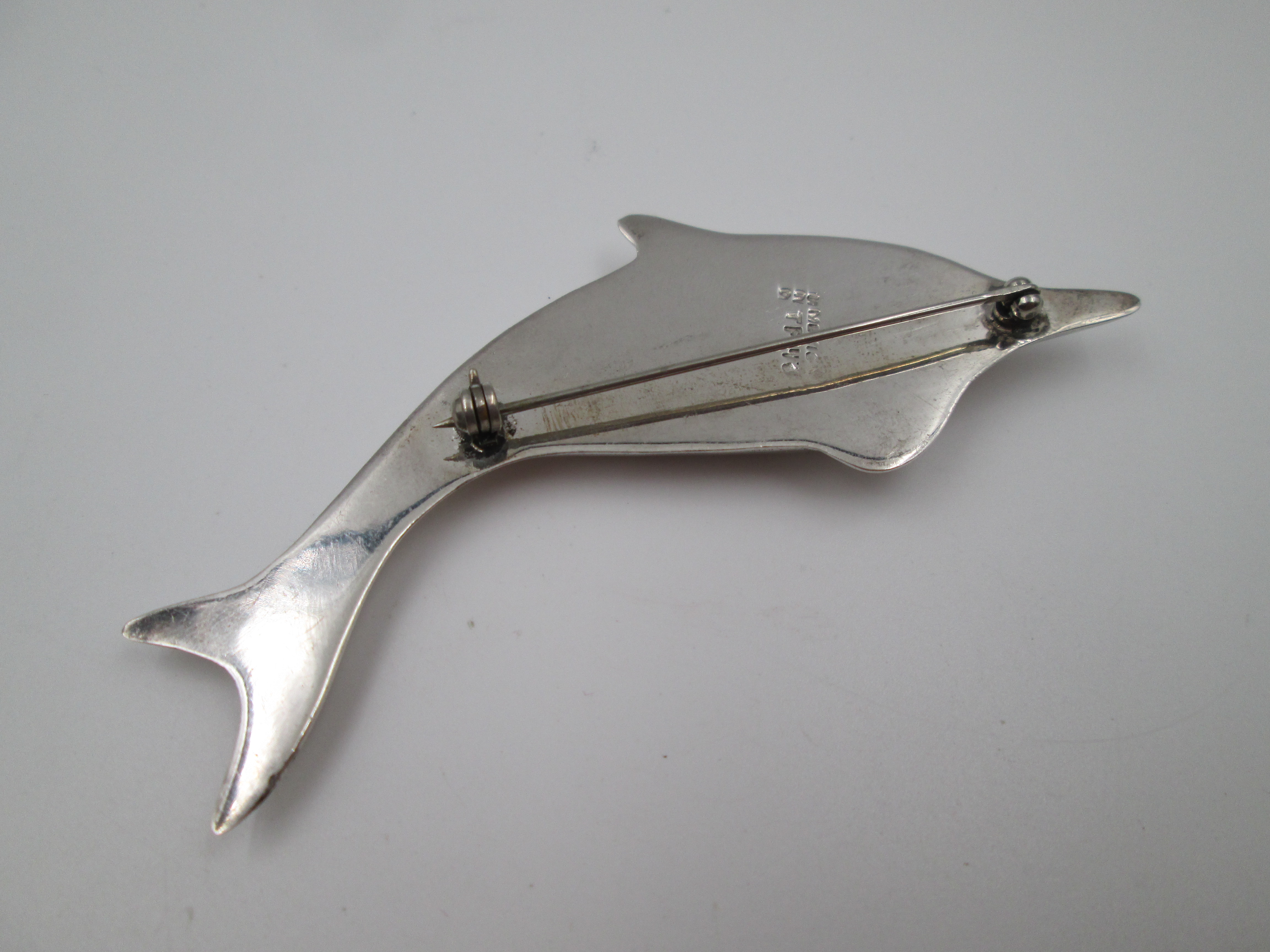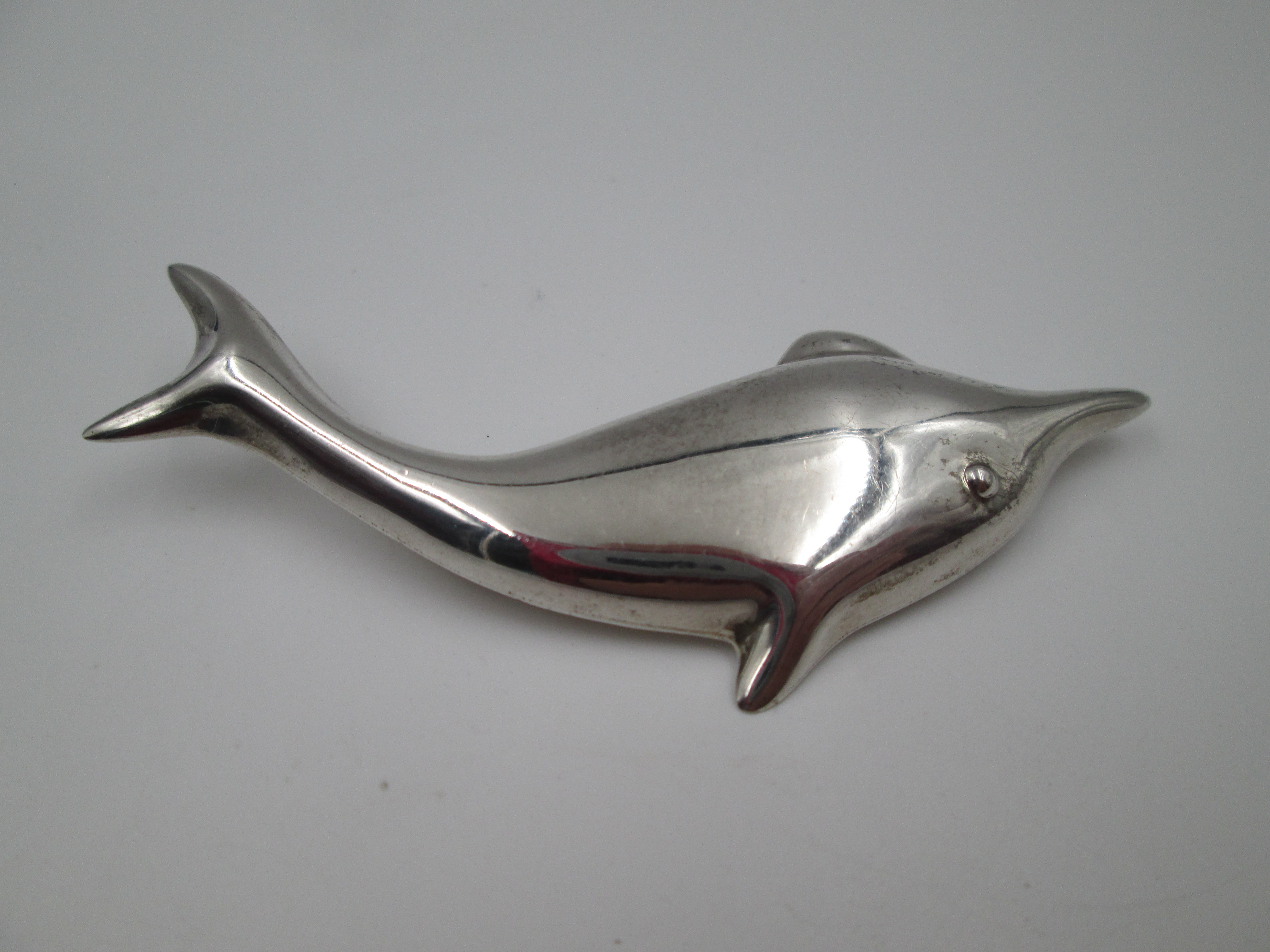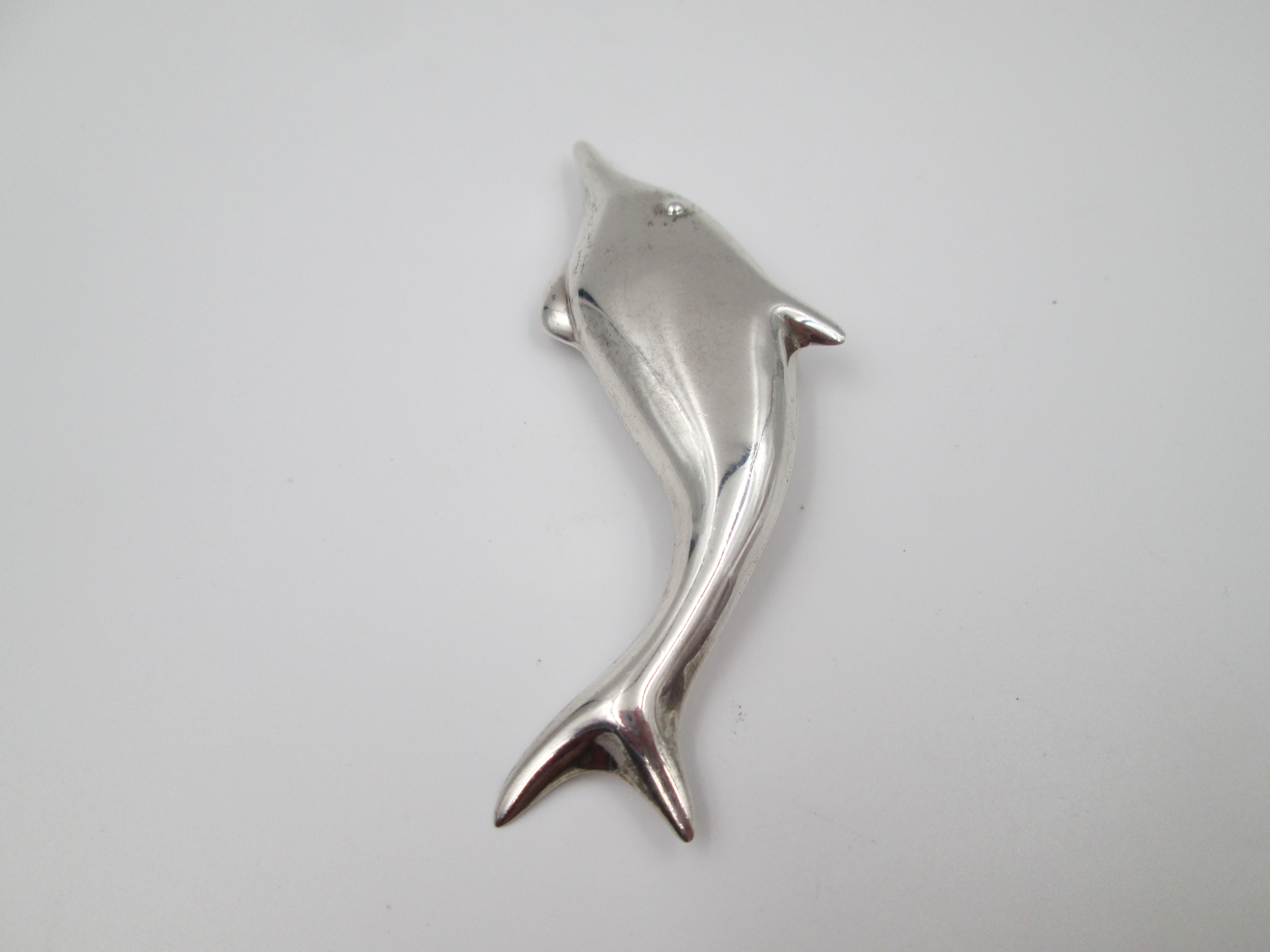 Women's brooch. 925 sterling silver. Swimming dolphin figure. Pin on back. Mexico. 1960's
