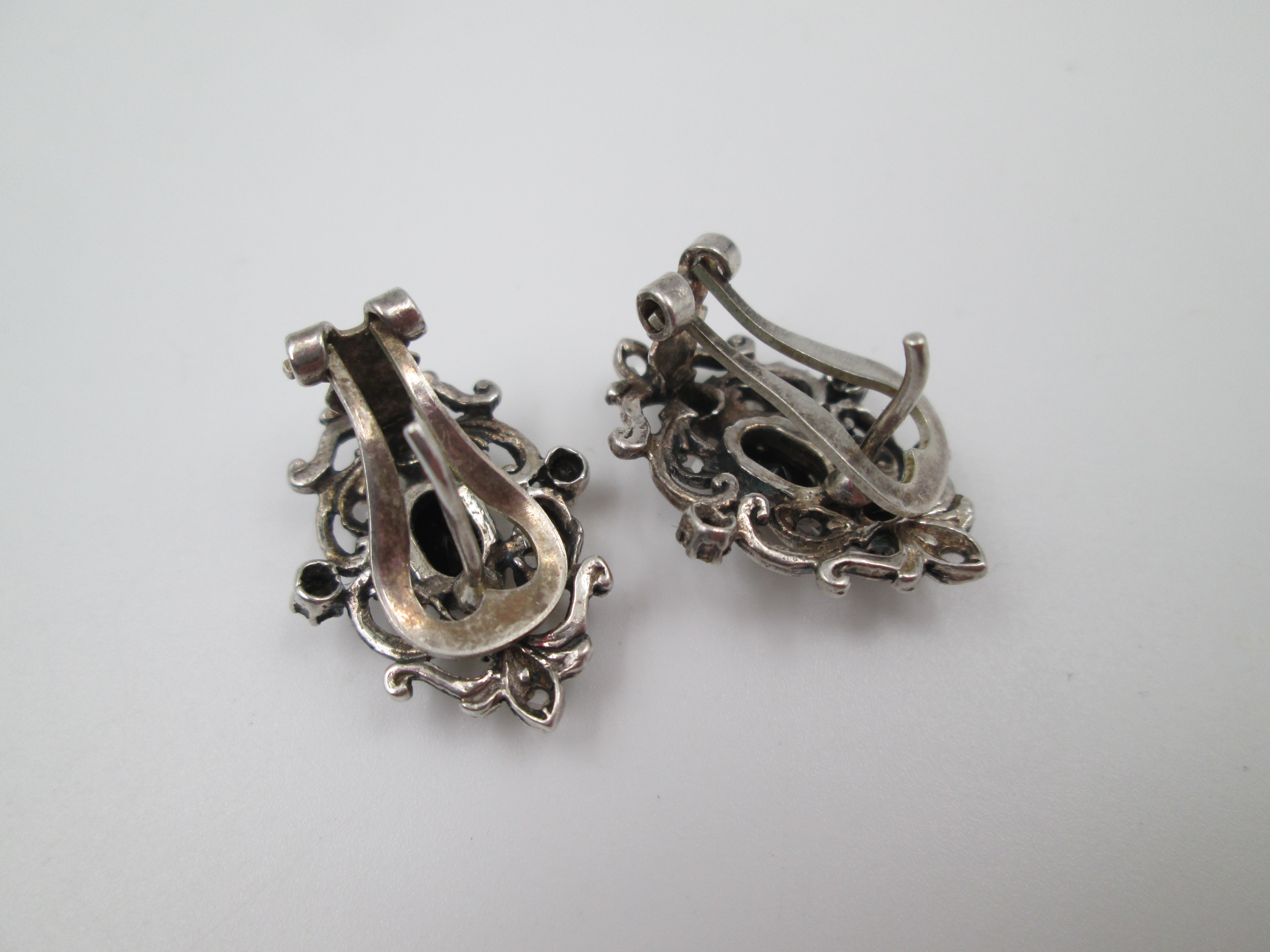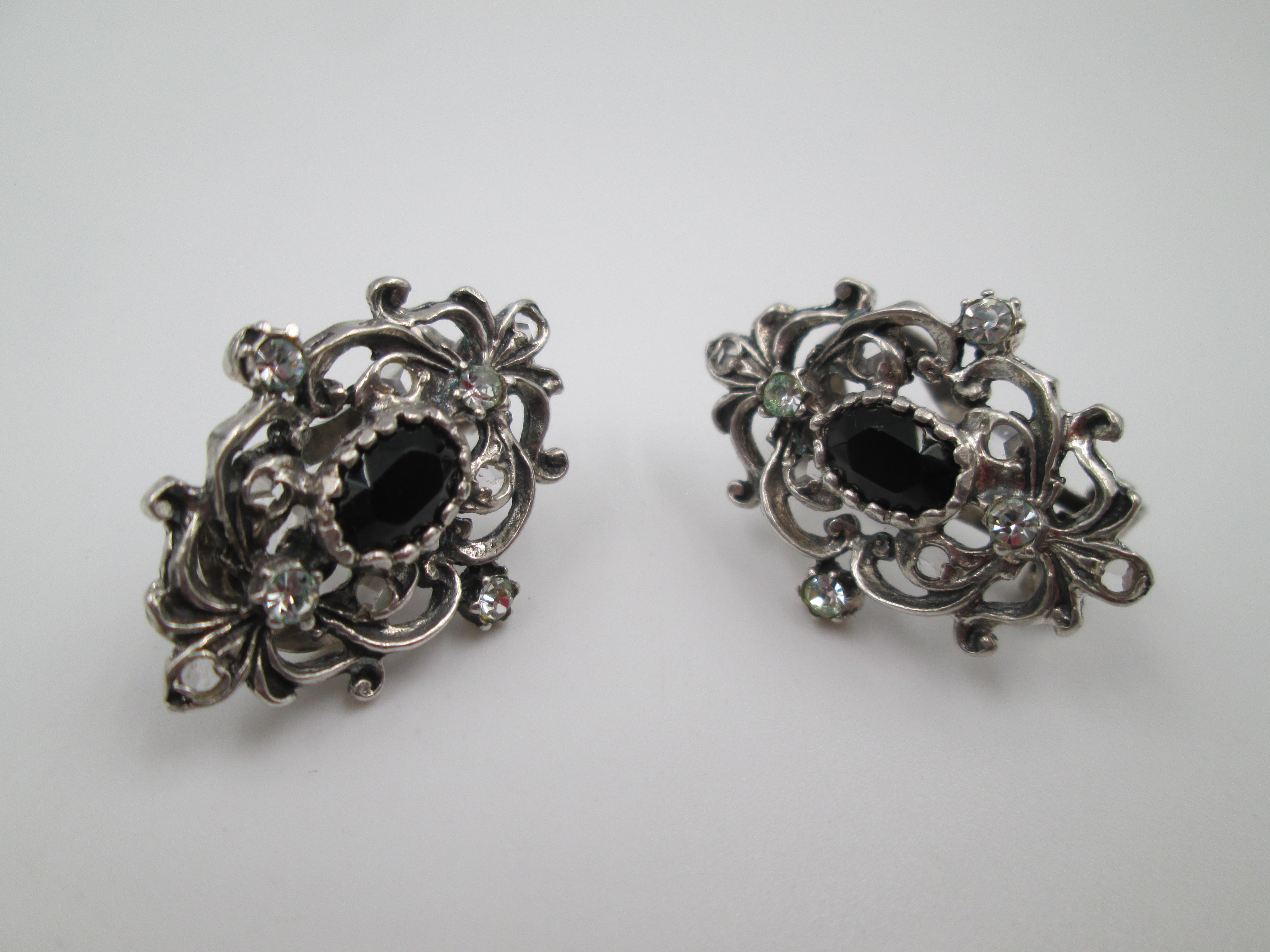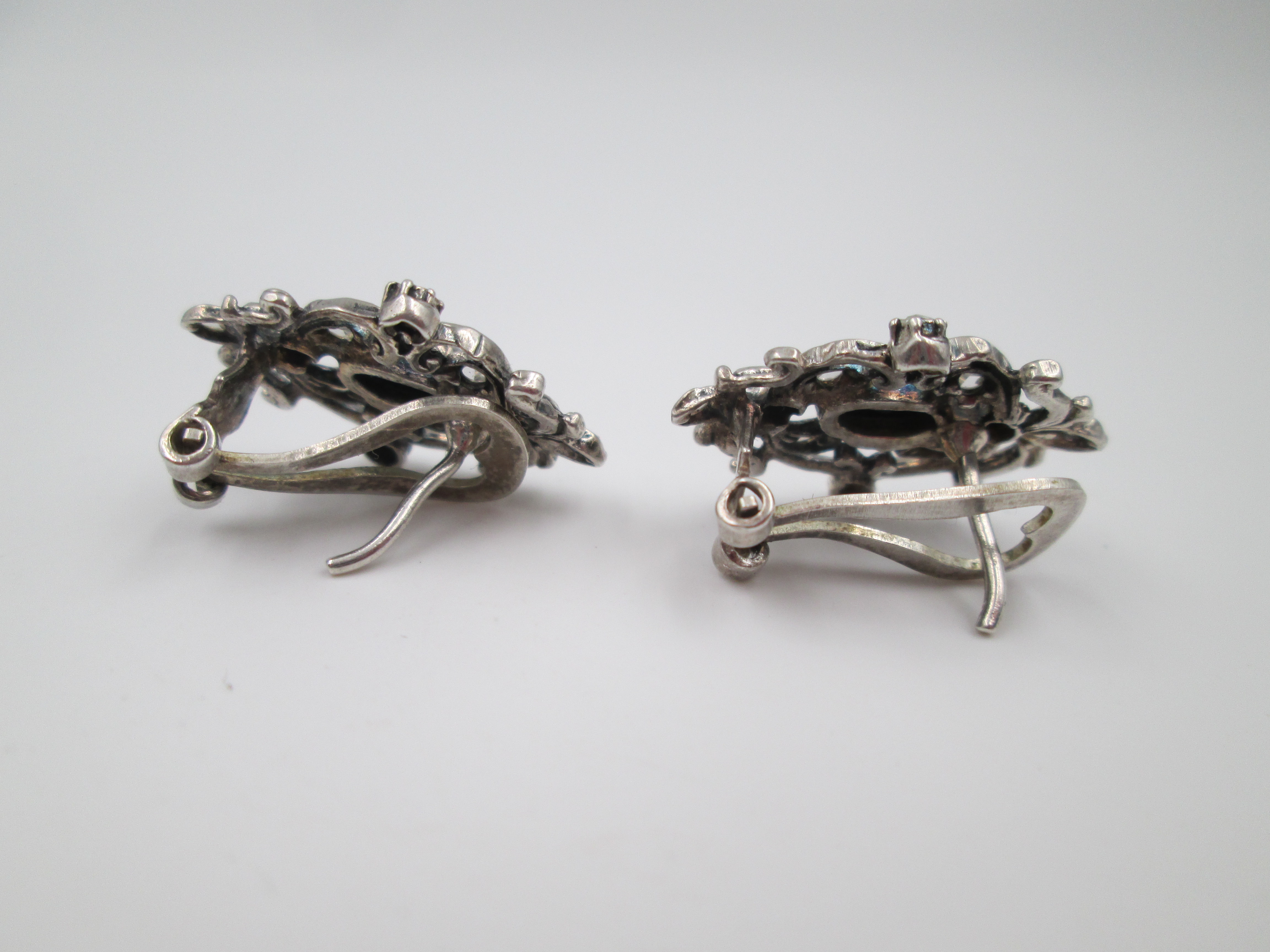 Women's earrings. 925 sterling silver. White and black gems. Clip clasp. Spain. 1980's