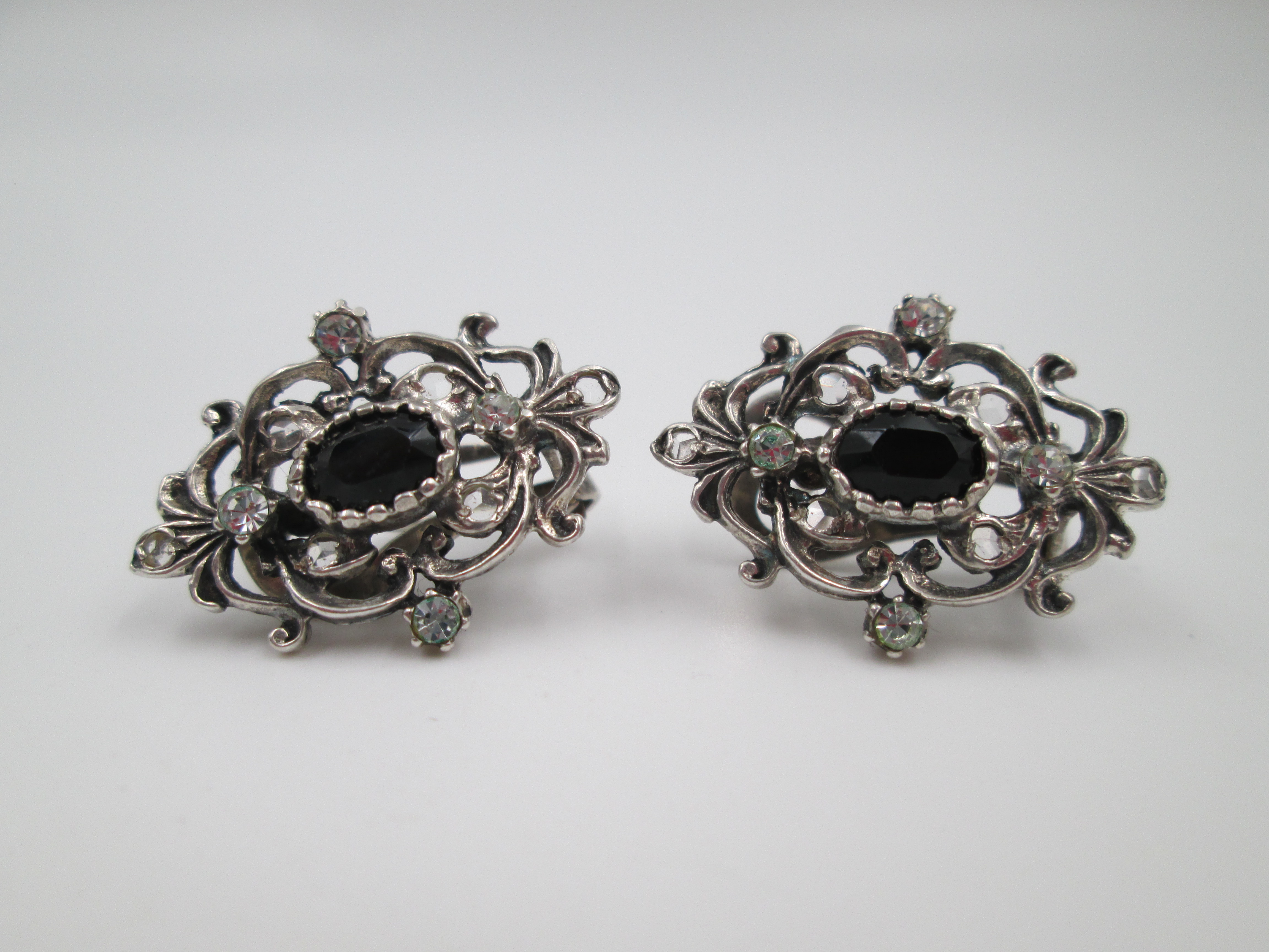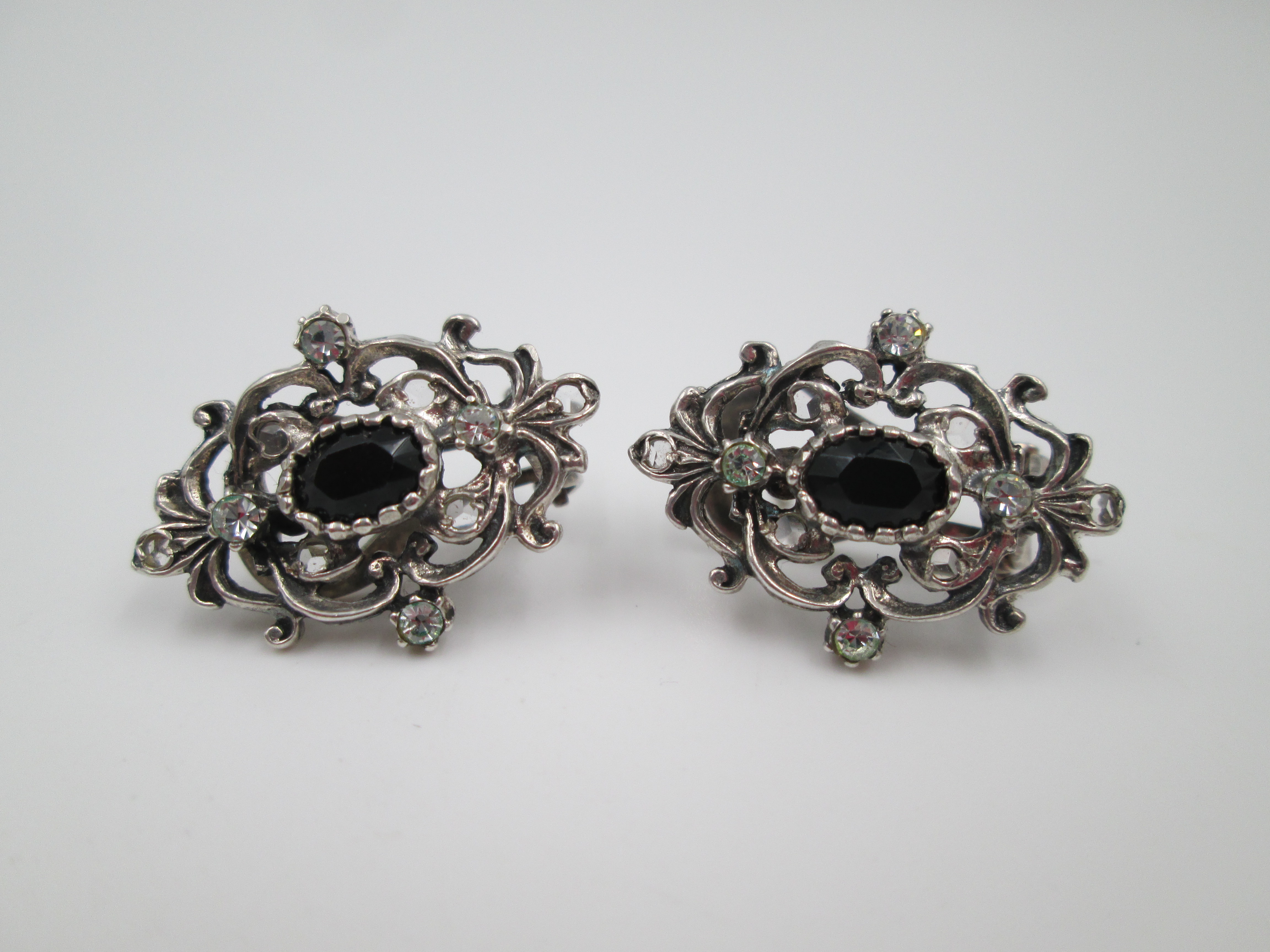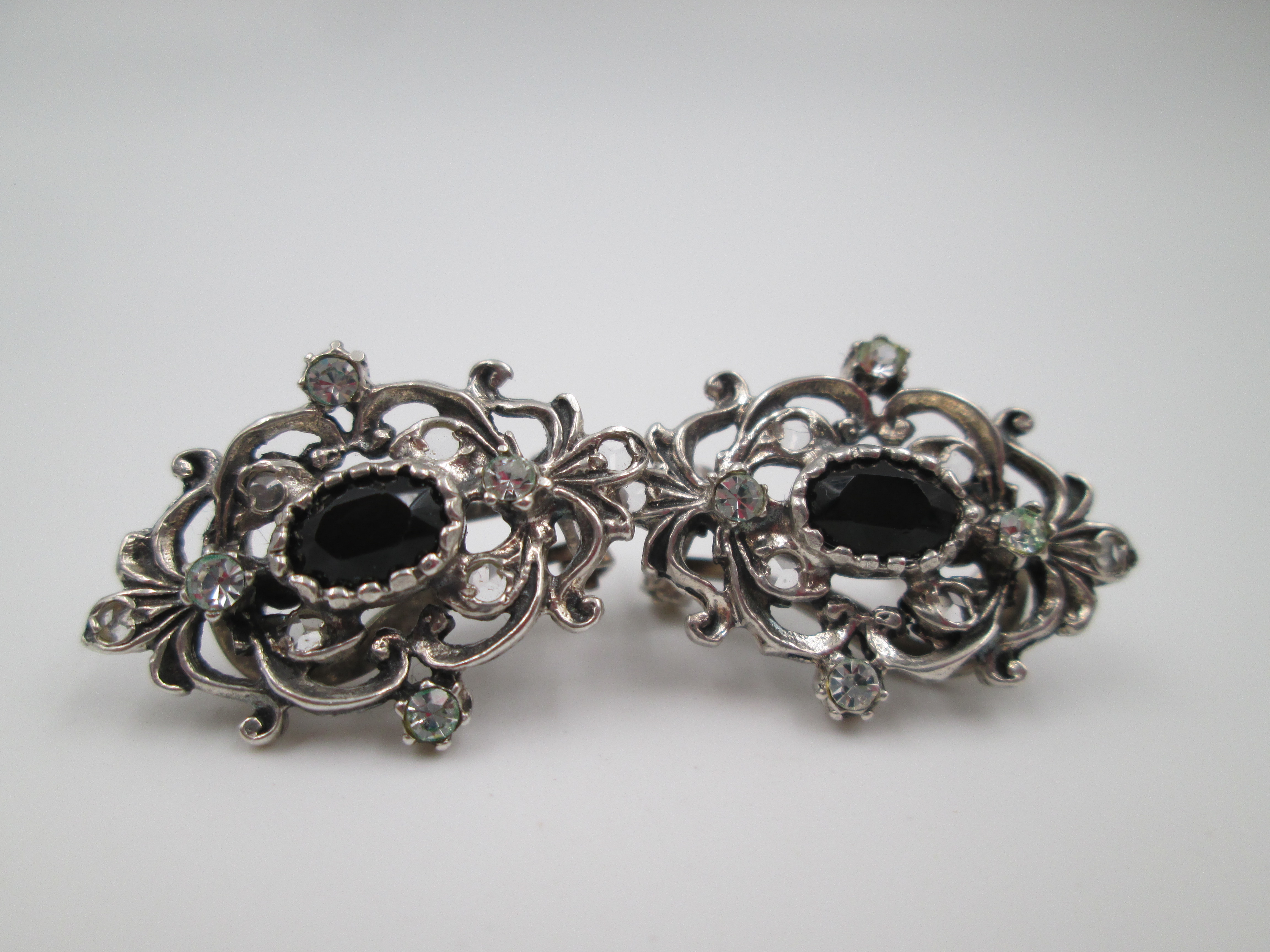 Women's earrings. 925 sterling silver. White and black gems. Clip clasp. Spain. 1980's
