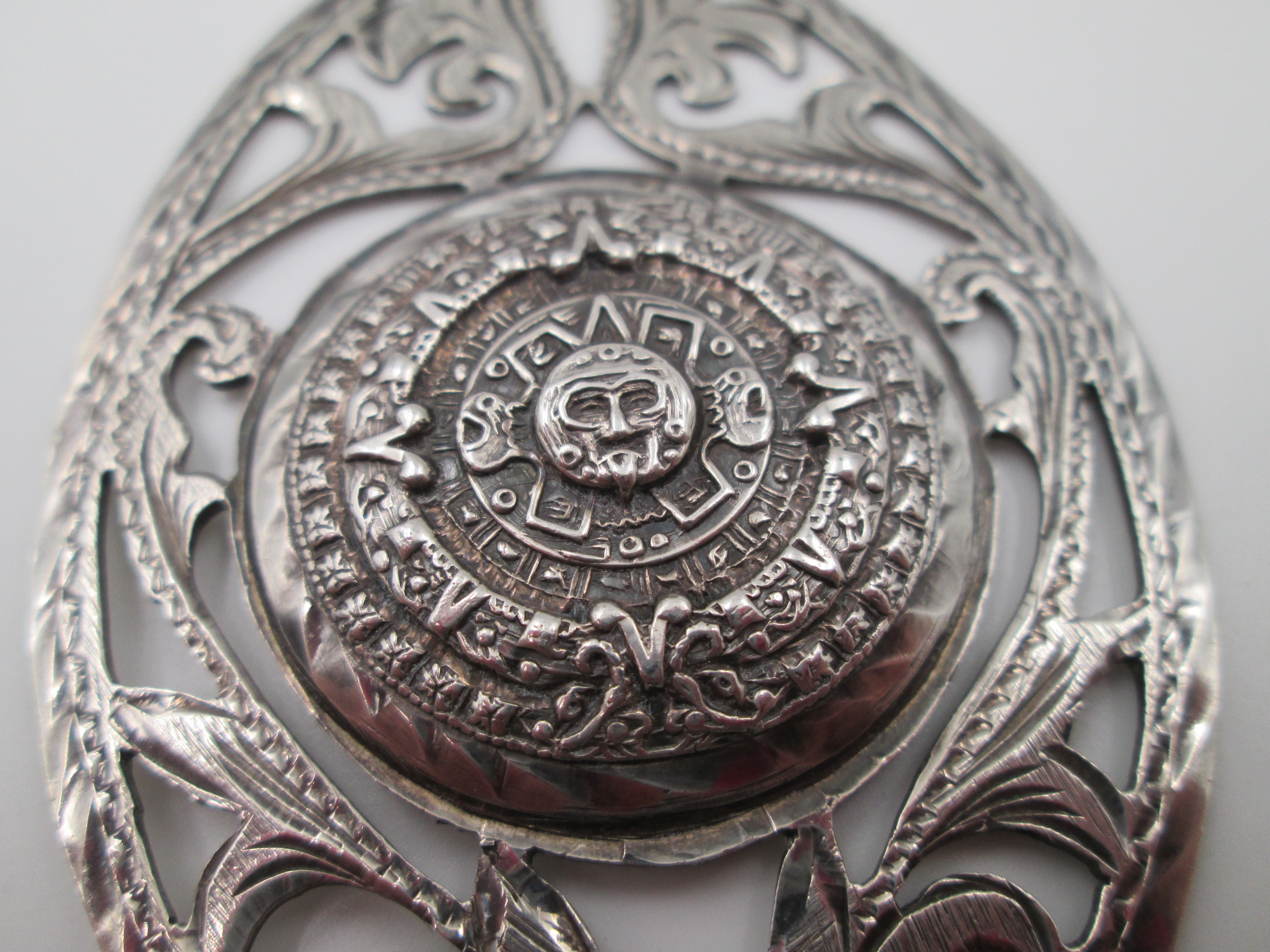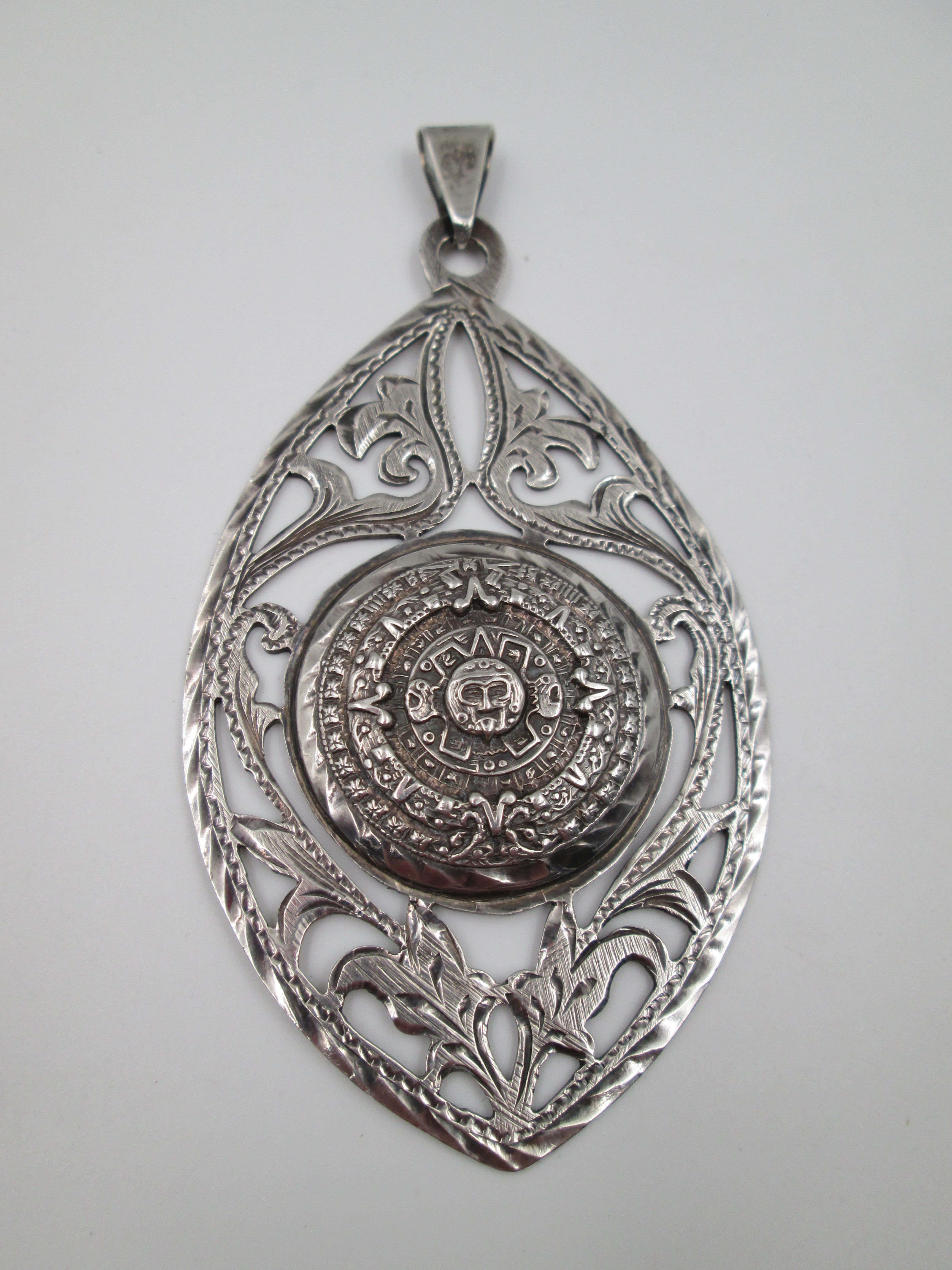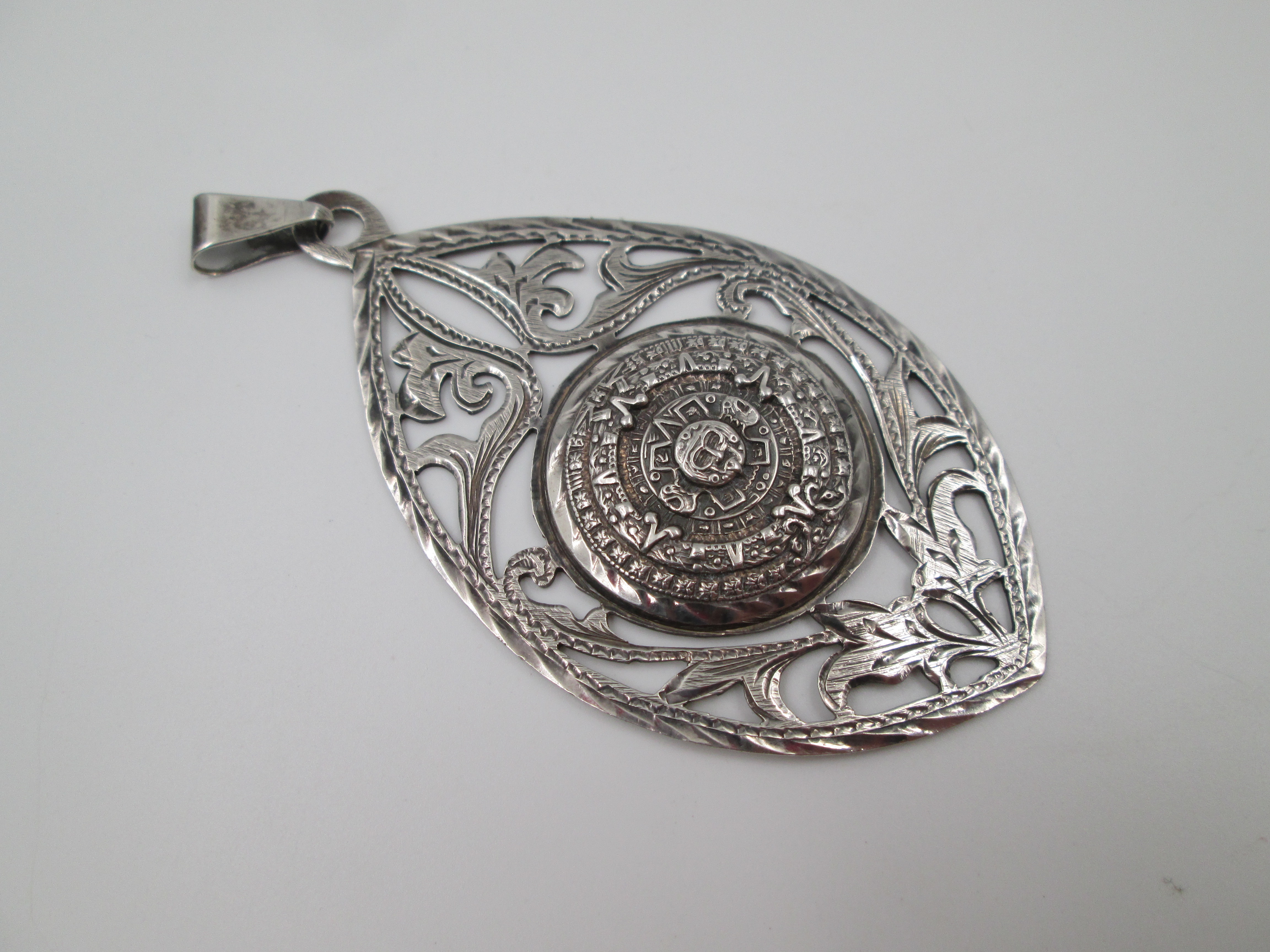 Women's pendant. Aztec calendar. Sterling silver. Ring on top. Mexico. 1980's