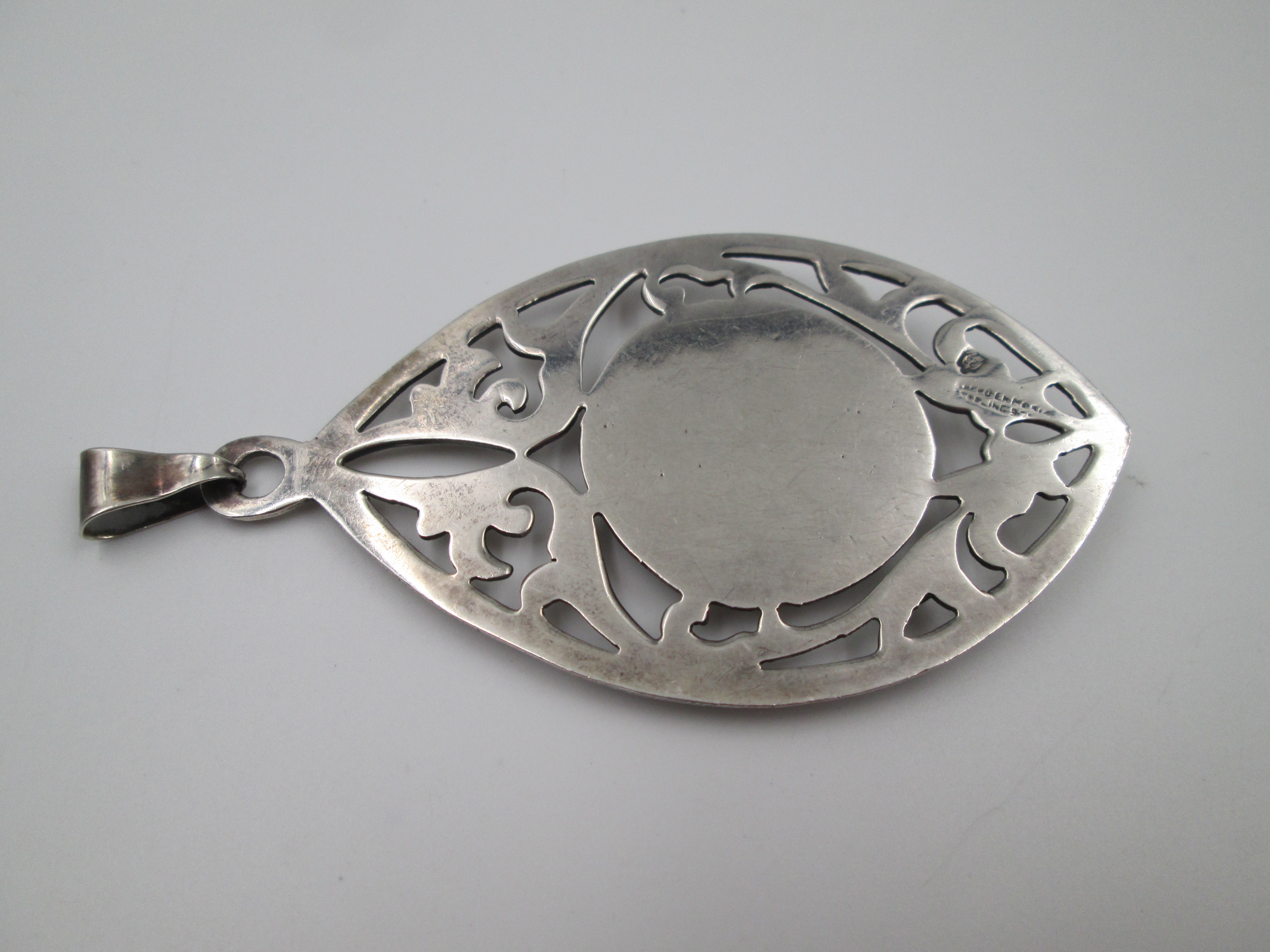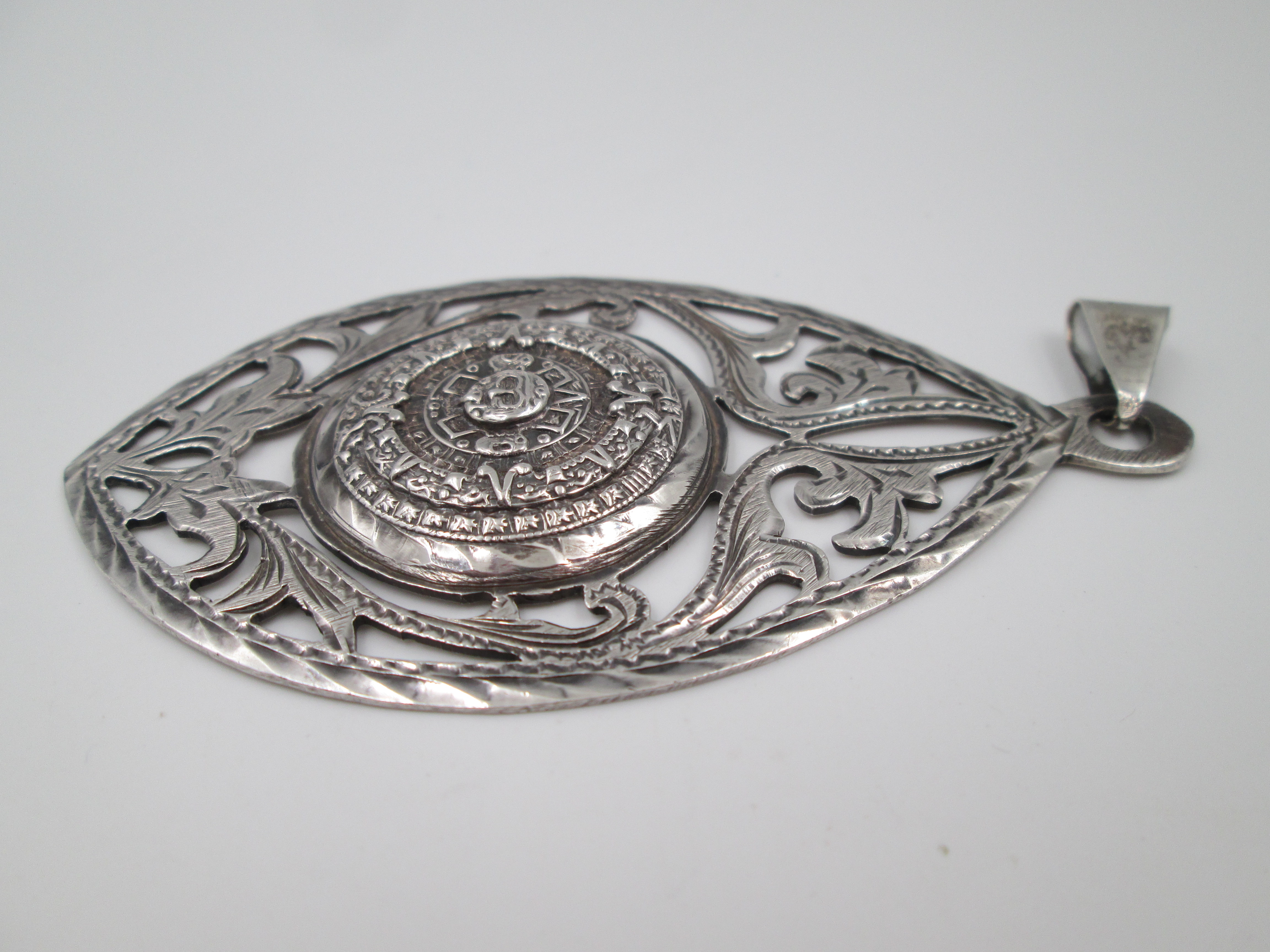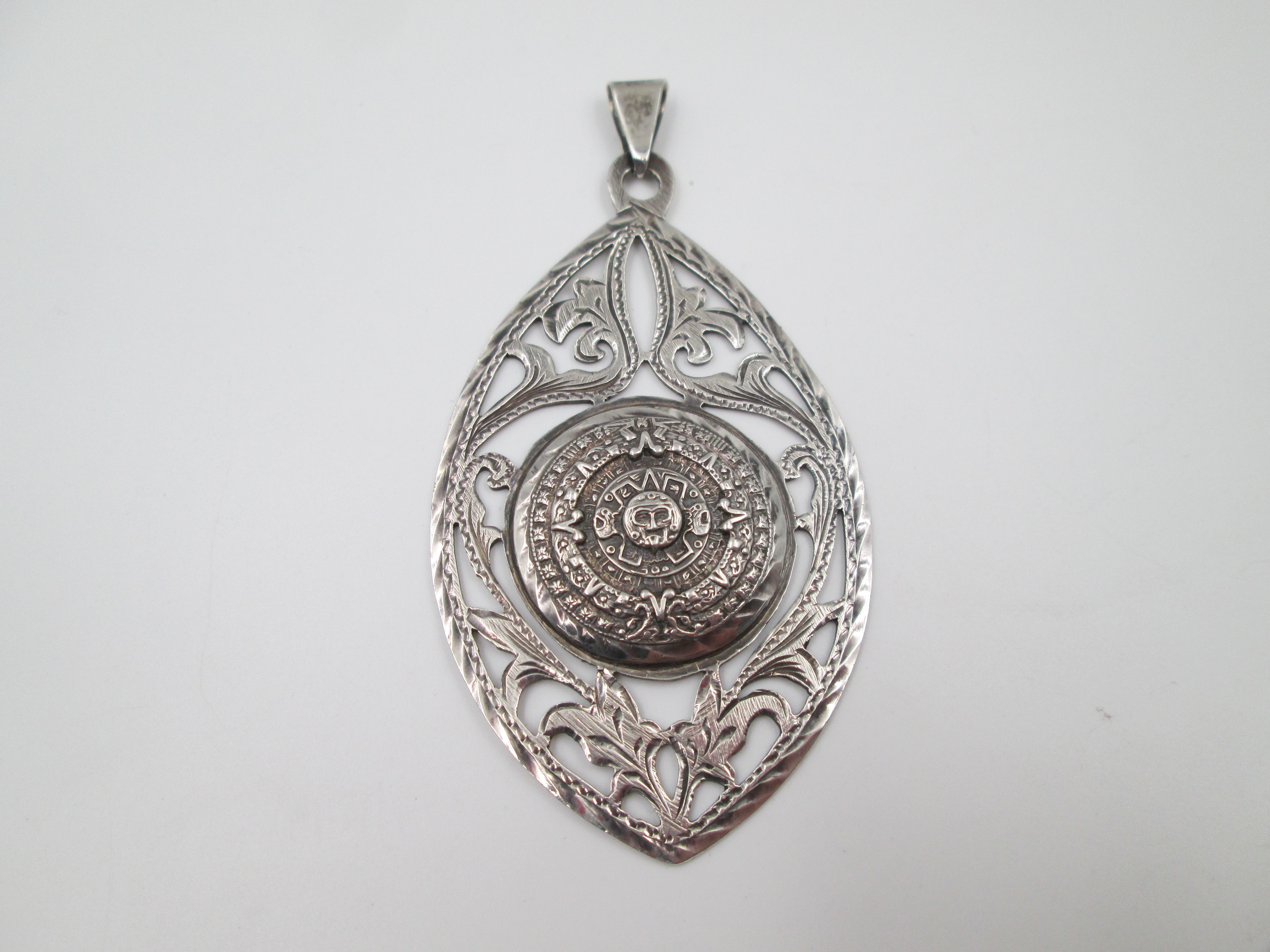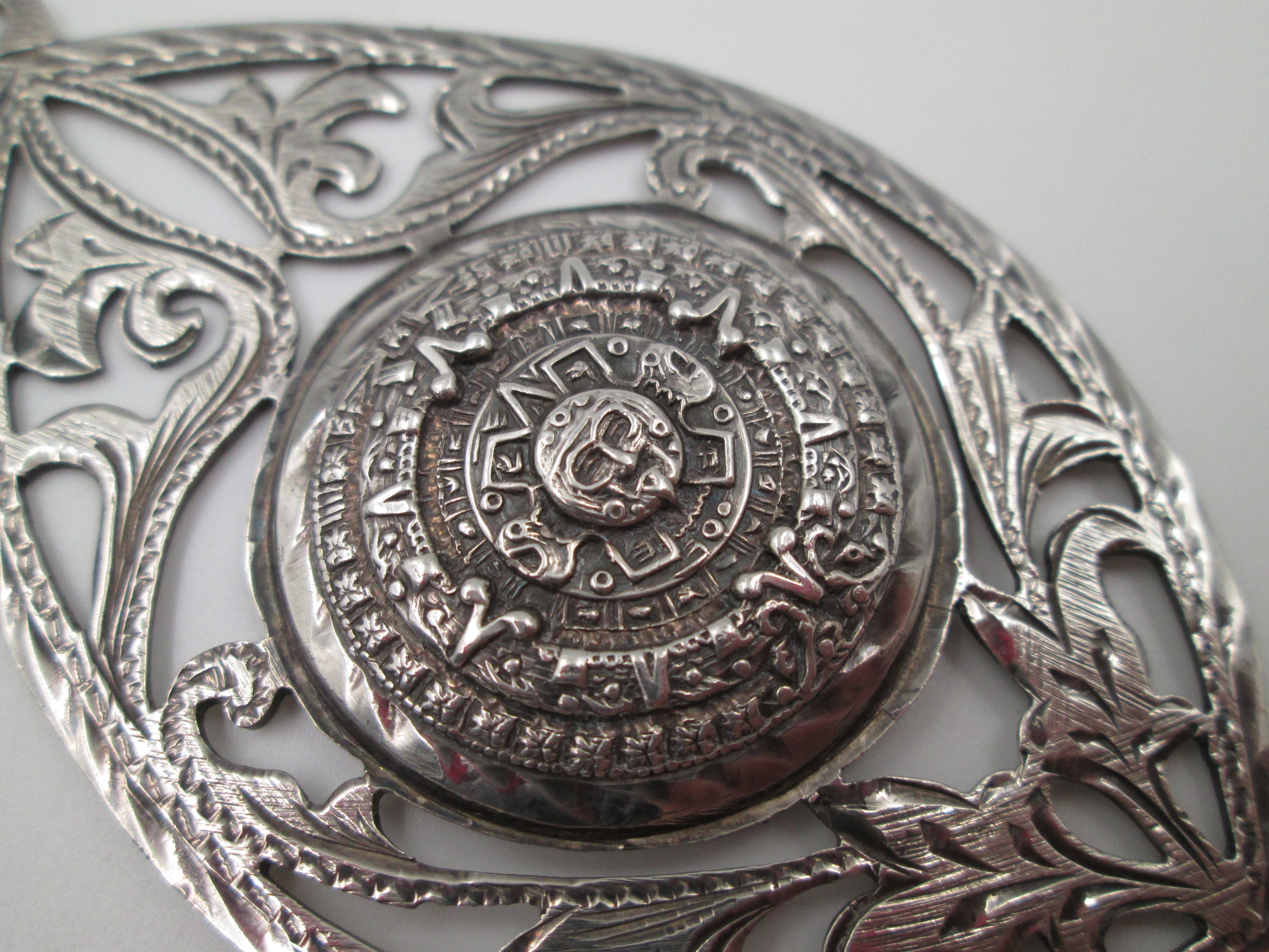 Women's pendant. Aztec calendar. Sterling silver. Ring on top. Mexico. 1980's