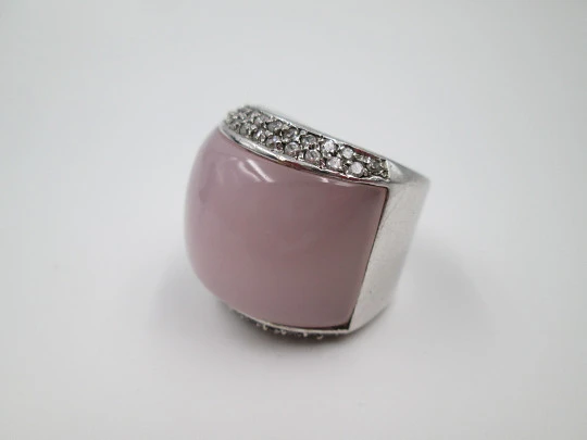 Women's wide ring. 925 sterling silver. Pink stone and rhinestones stripes. 1990's