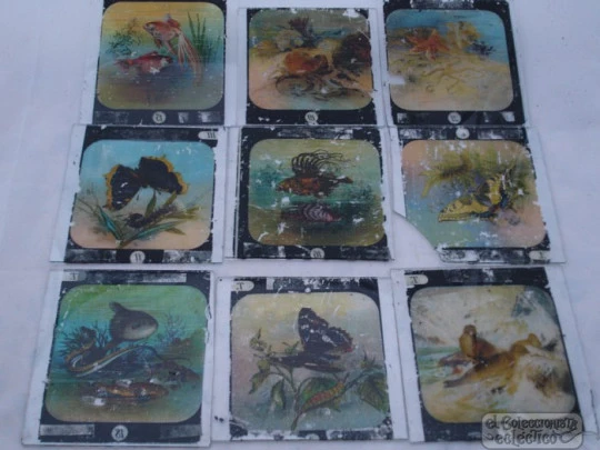 El aparato óptico, con una puerta lateral con cierre y un patrón decorativo con orificios que actúan de agujeros de ventilación, se suministra con 28 vidrios cuadrados pintados a mano (mariposas, peces, flores, mamíferos marinos...) y un marco doble de madera para deslizarlos.