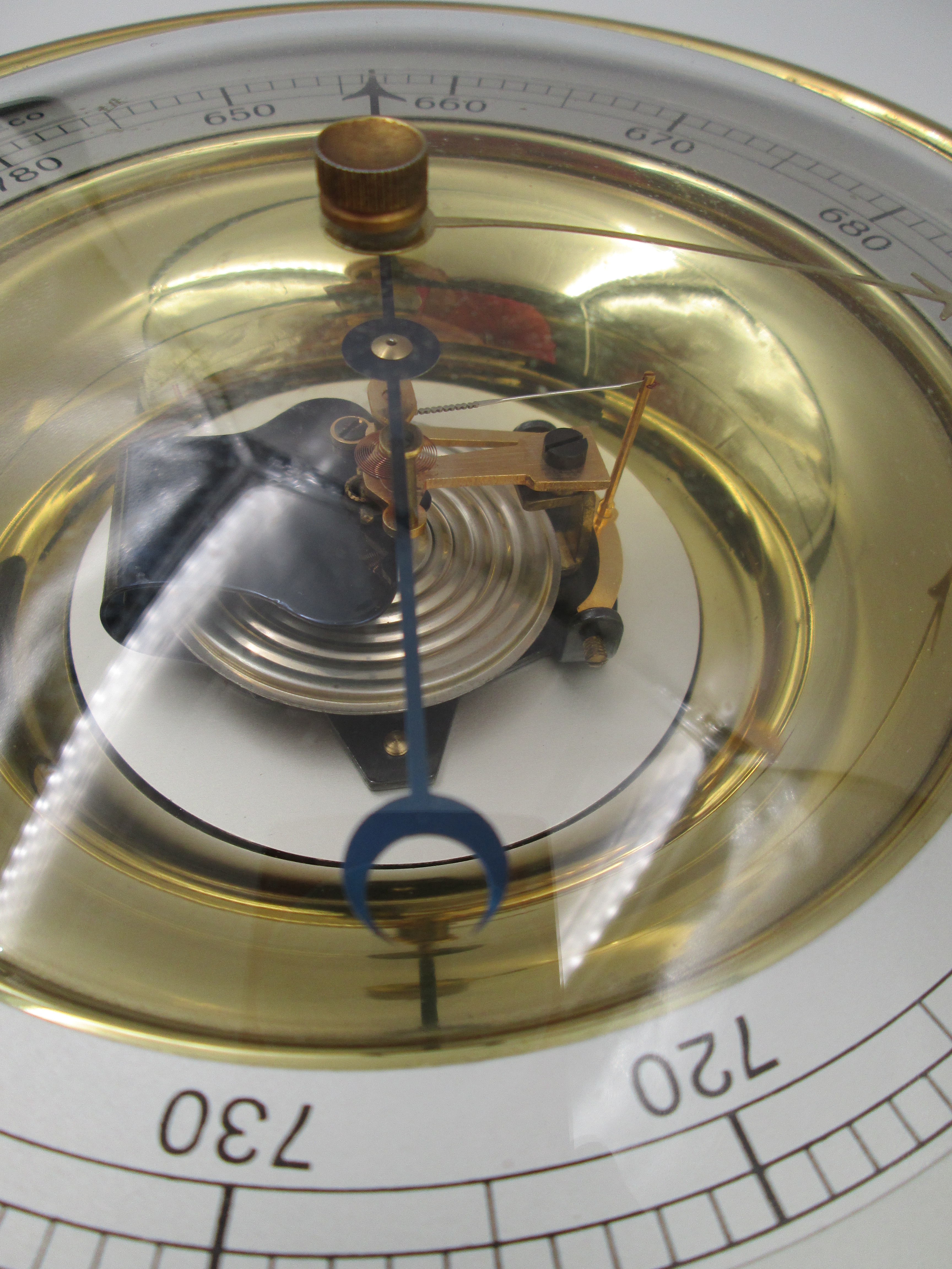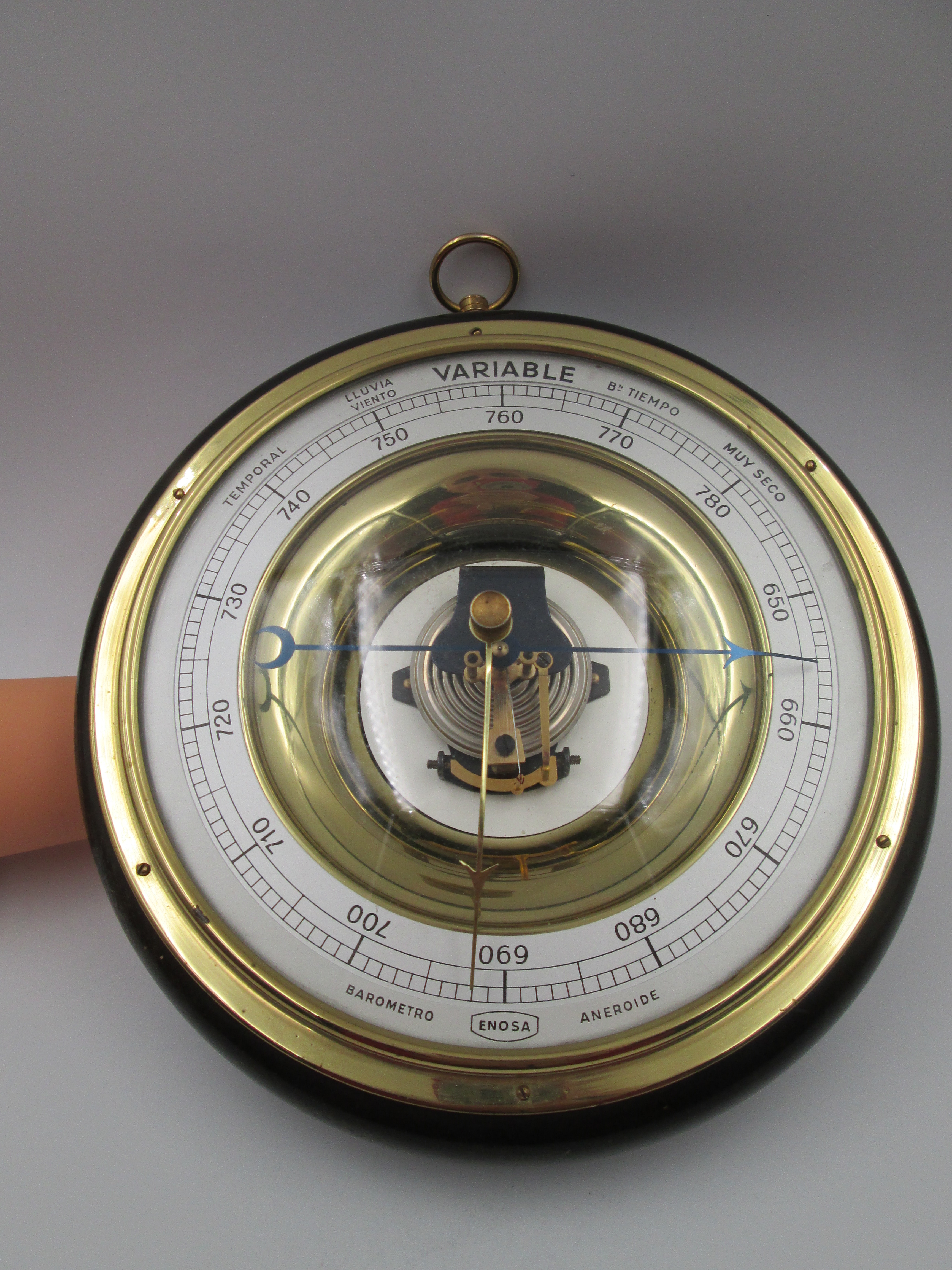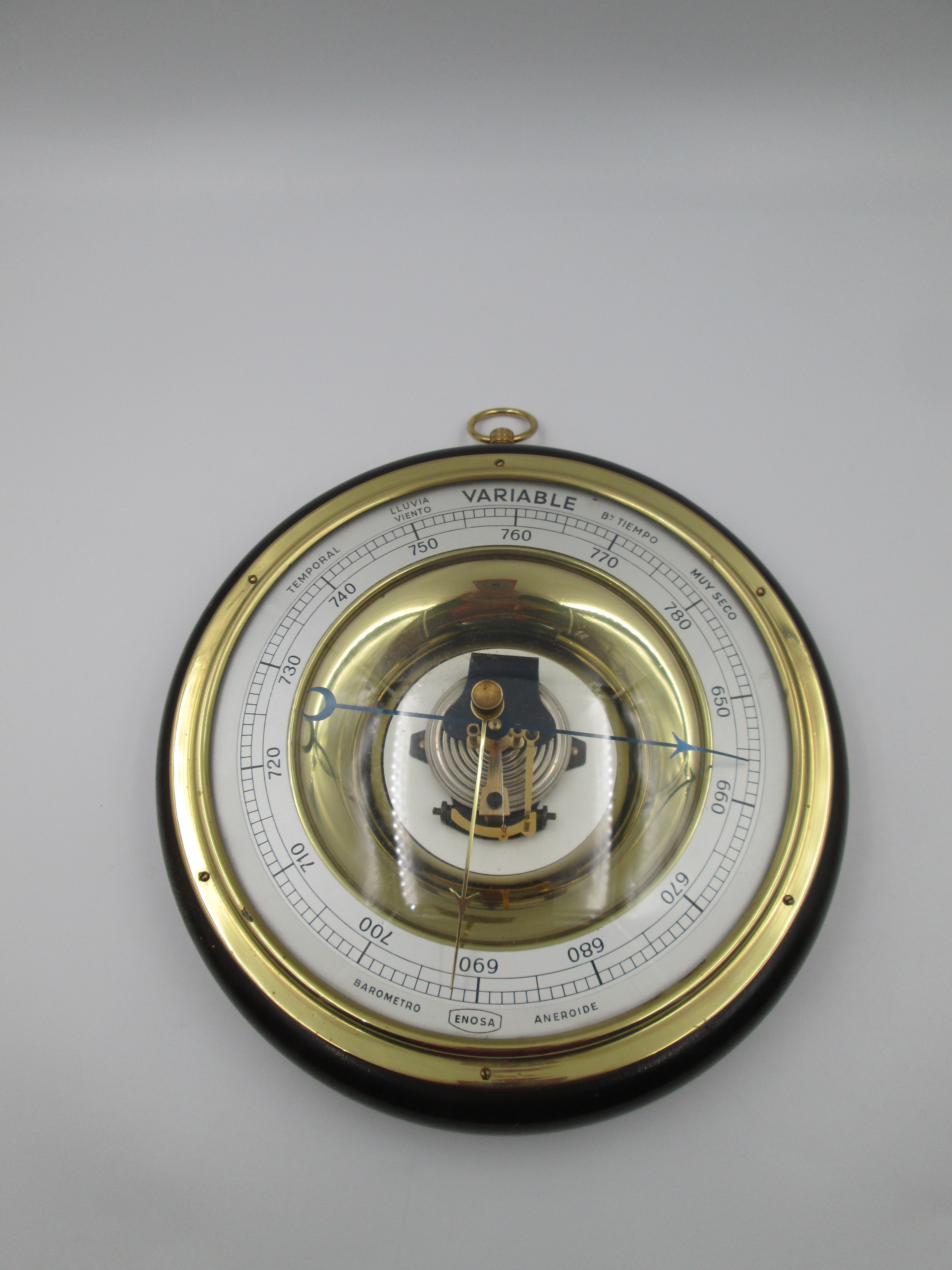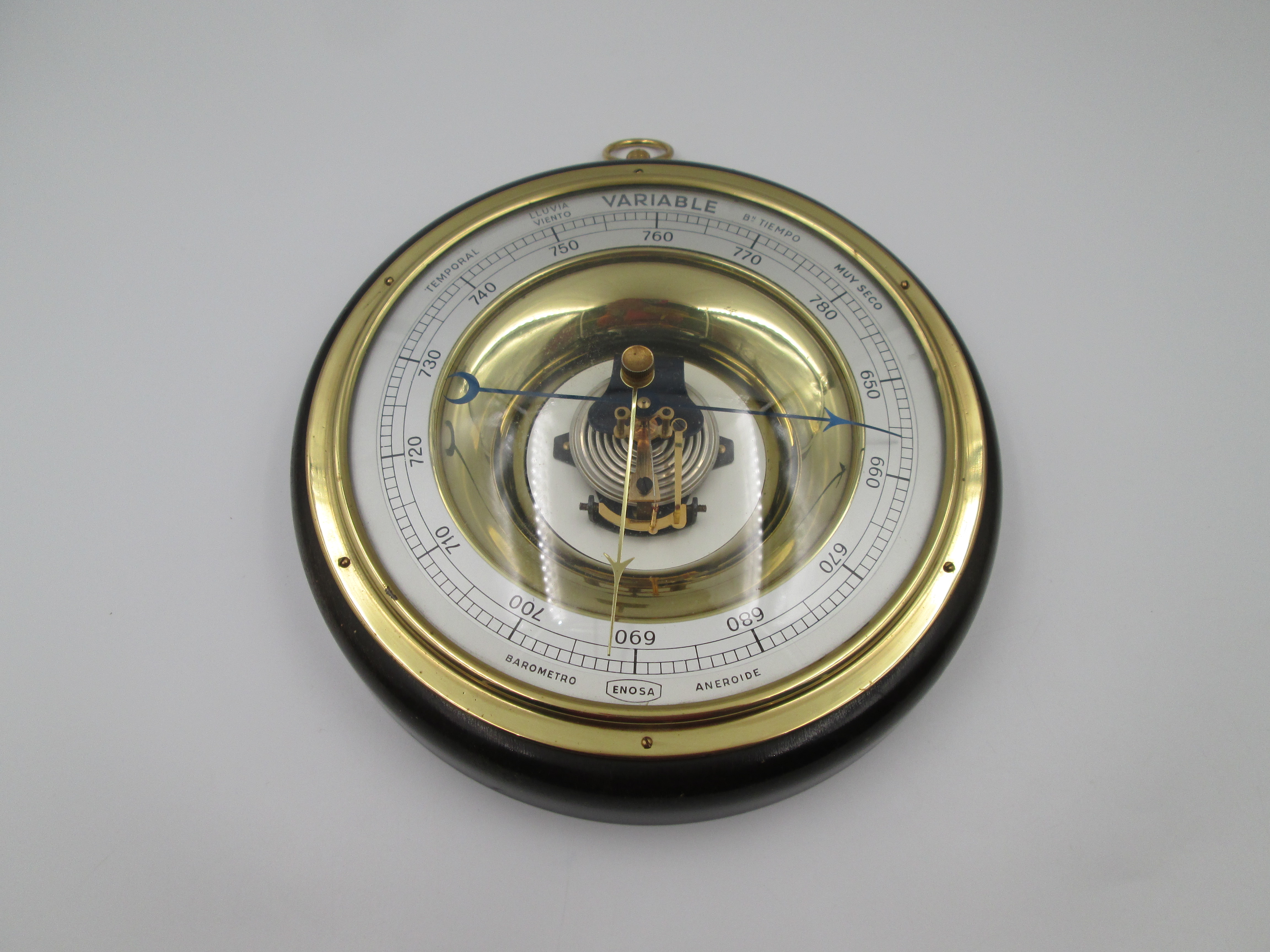 Barómetro aneroide circular de pared manufacturado en España alrededor de los años sesenta por la Empresa Nacional de Óptica (ENOSA).