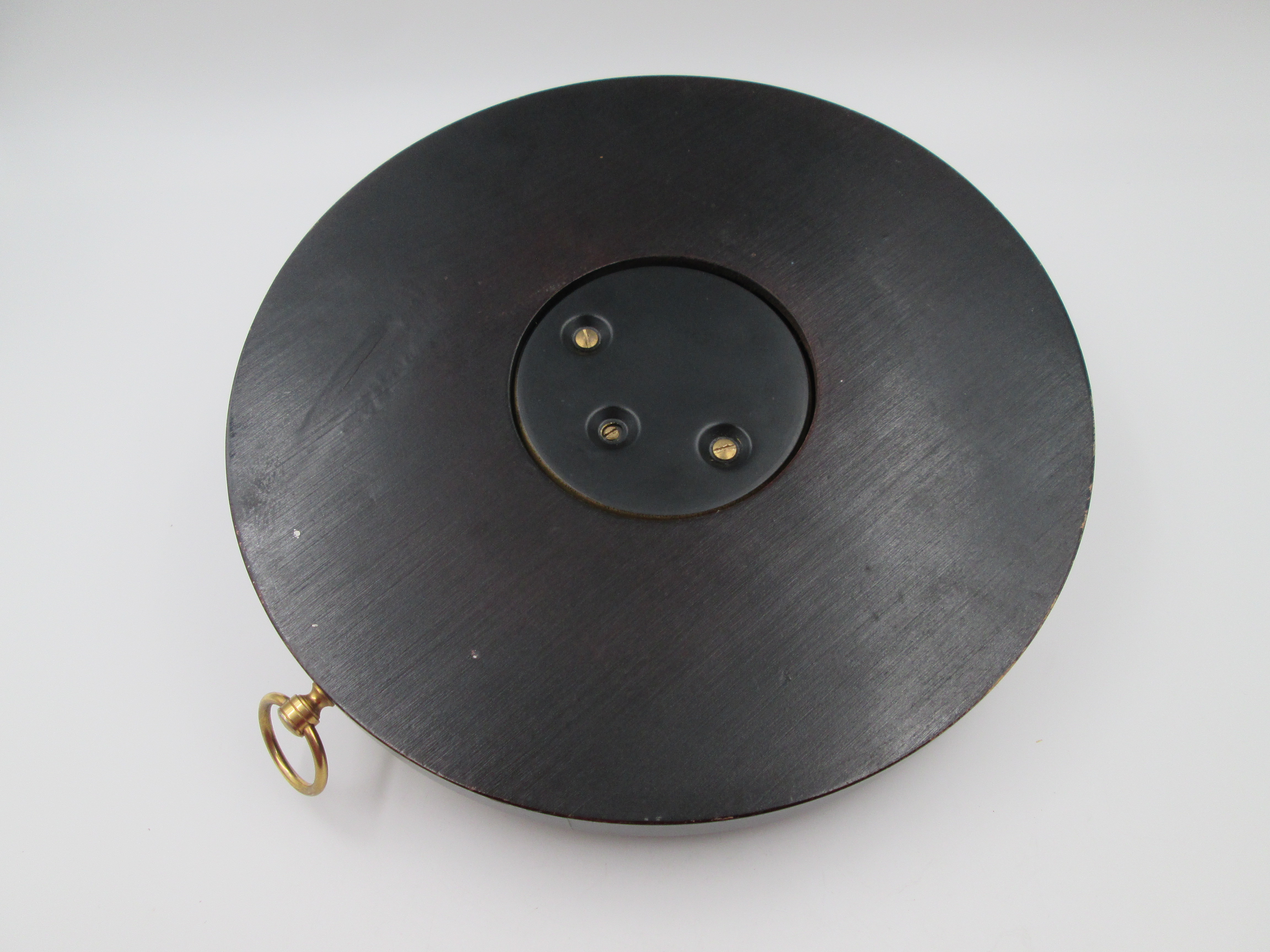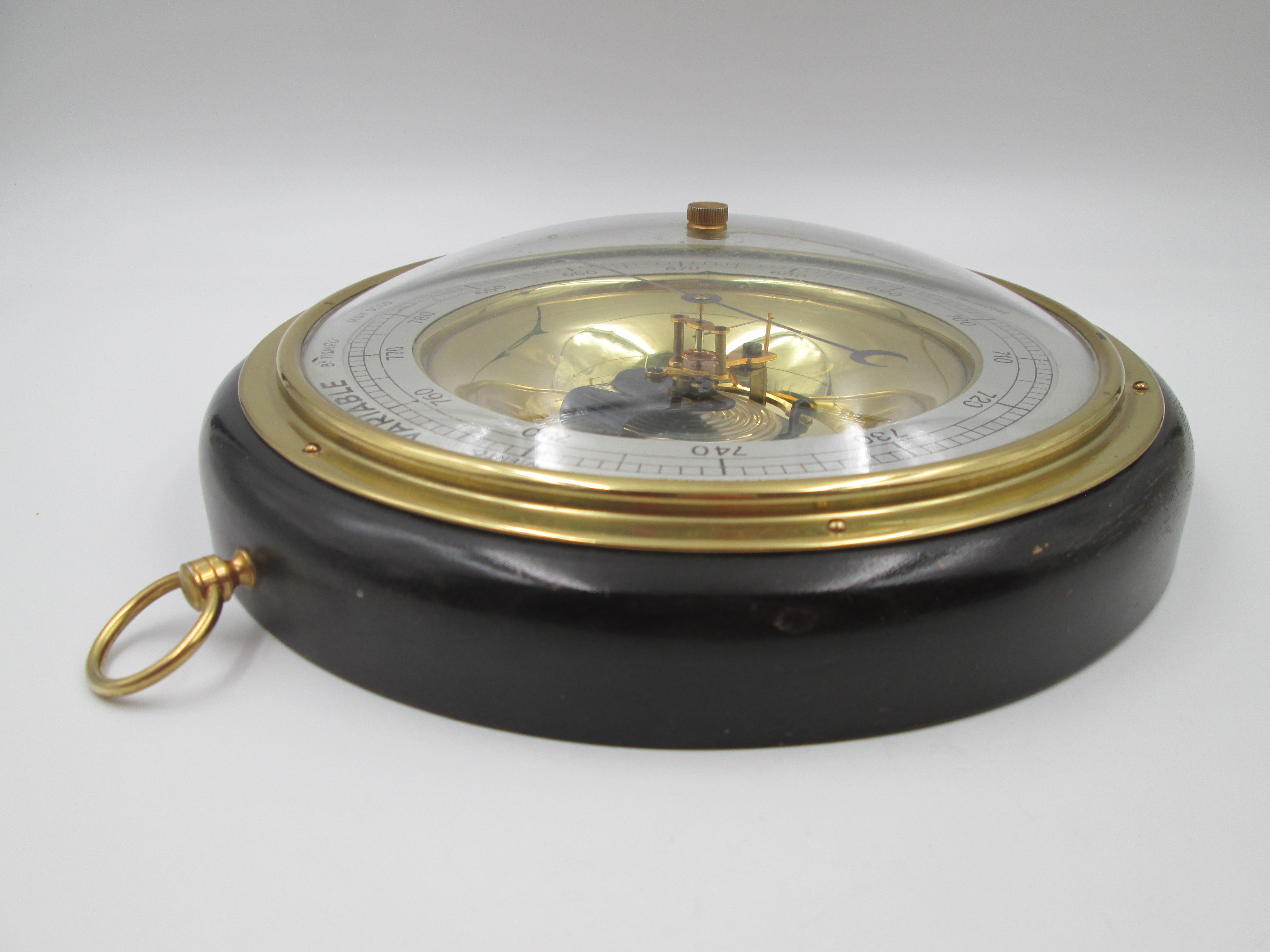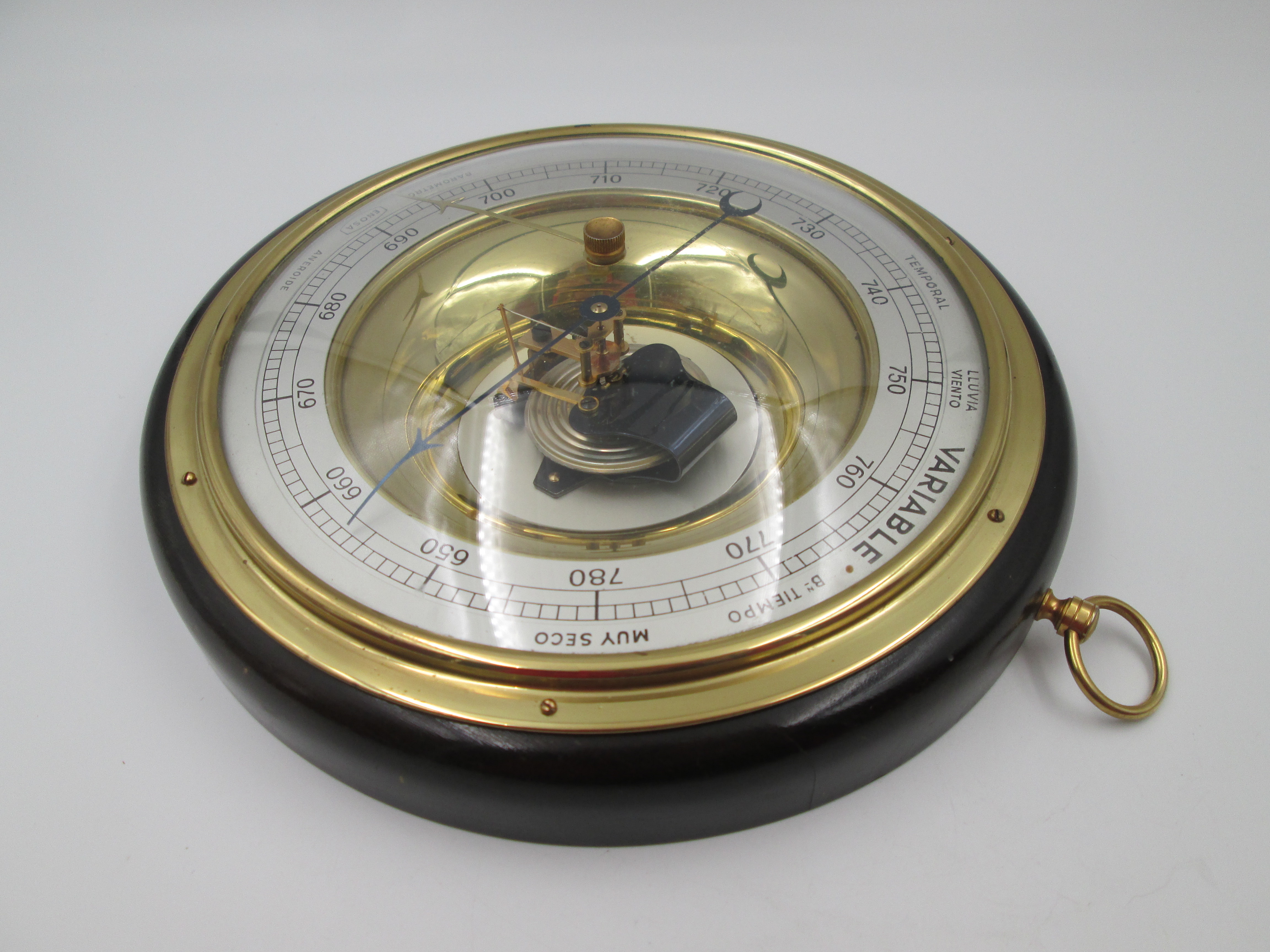 Barómetro aneroide circular de pared Enosa en madera y latón. Dial metálico. España. 1960