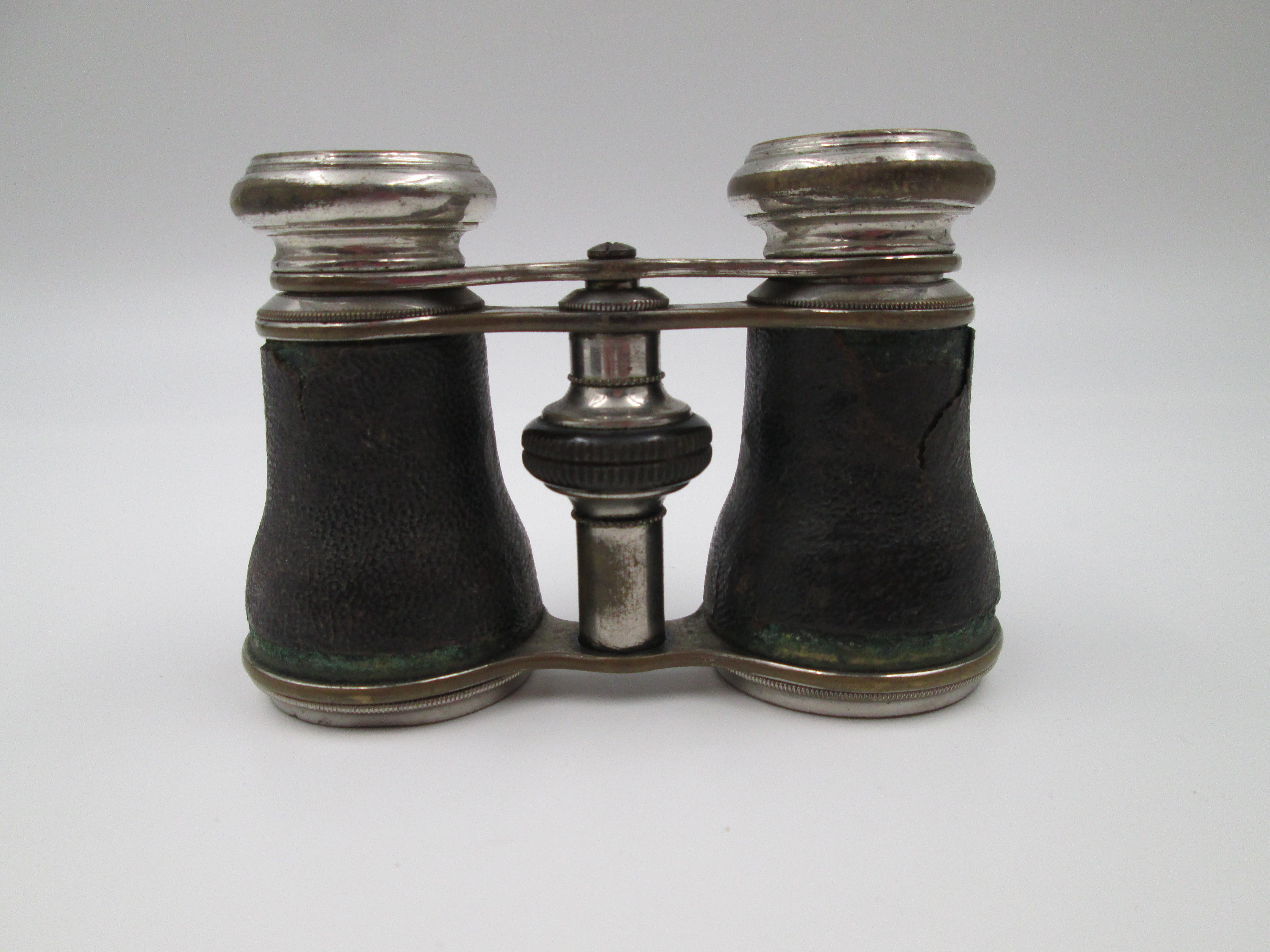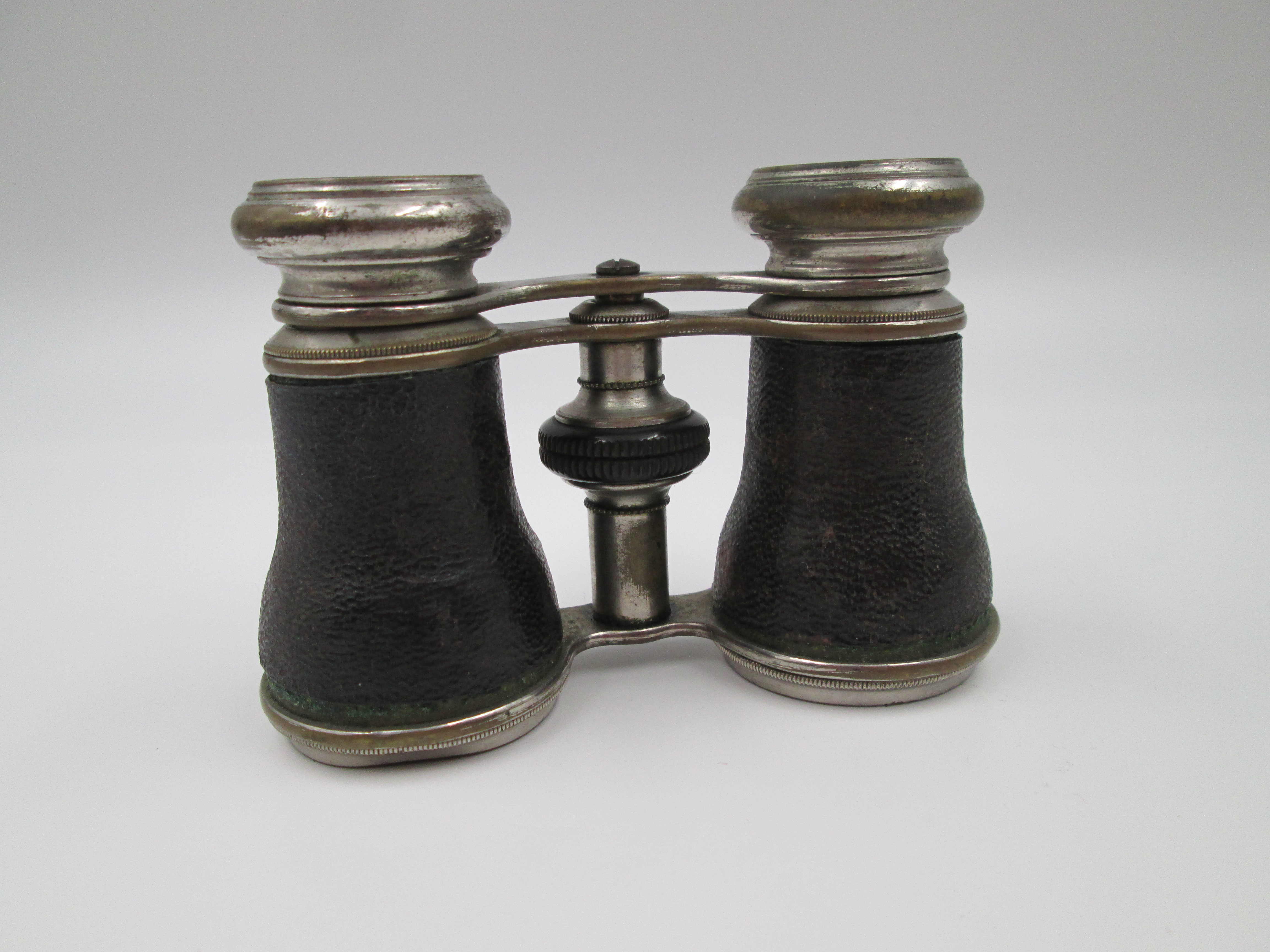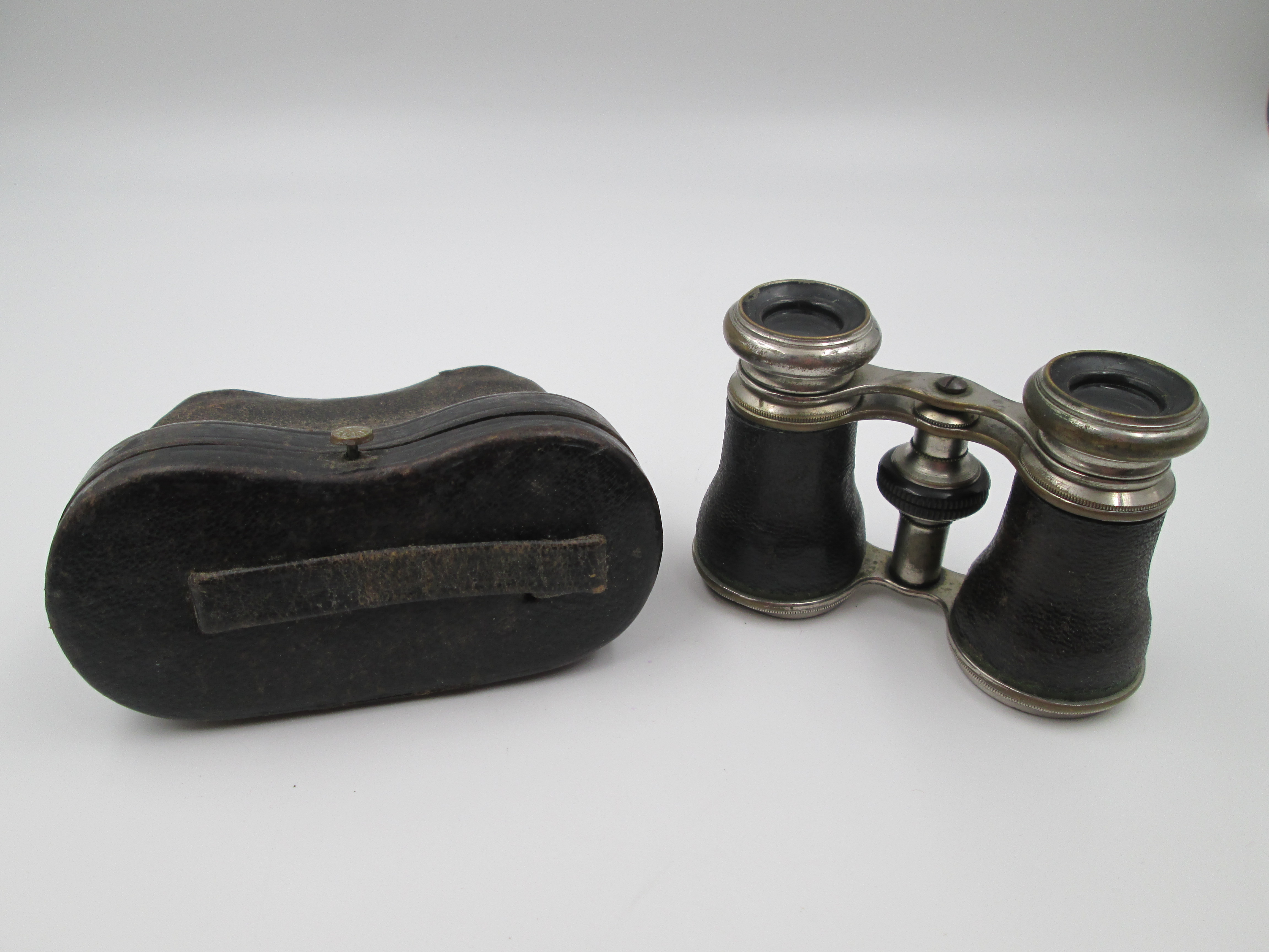 Binoculares de teatro con estuche. Latón plateado y piel negra. Alemania. 1930