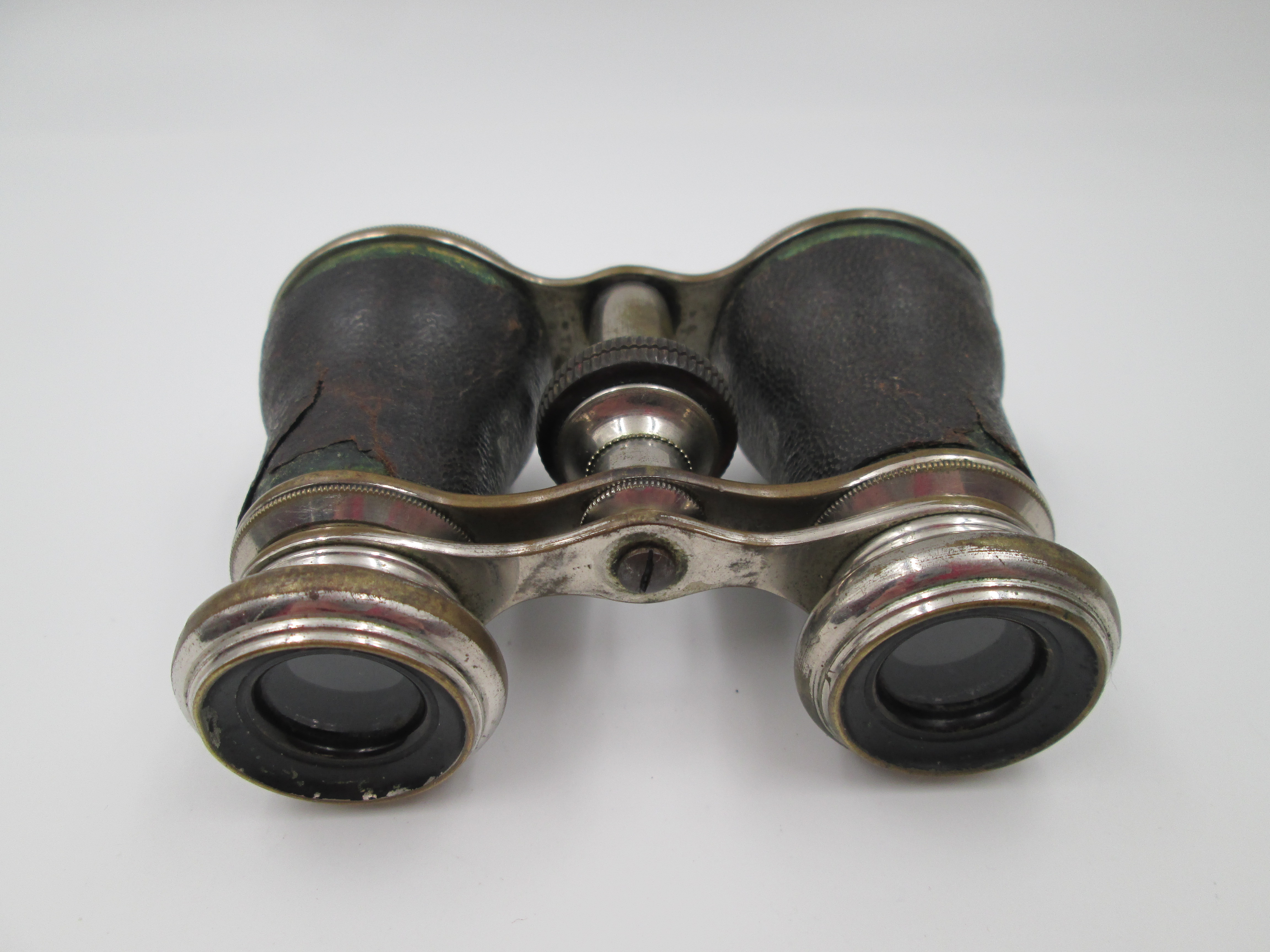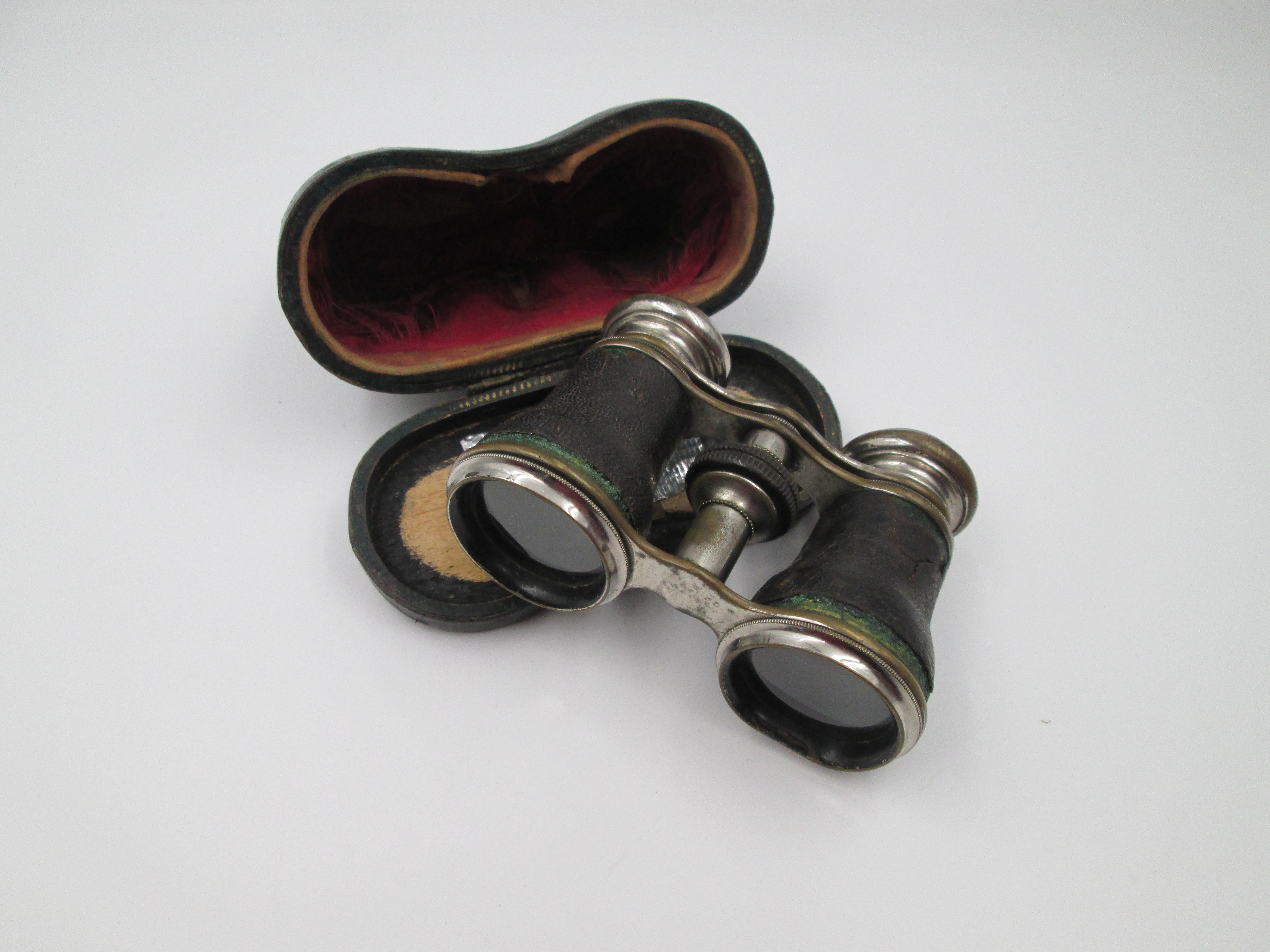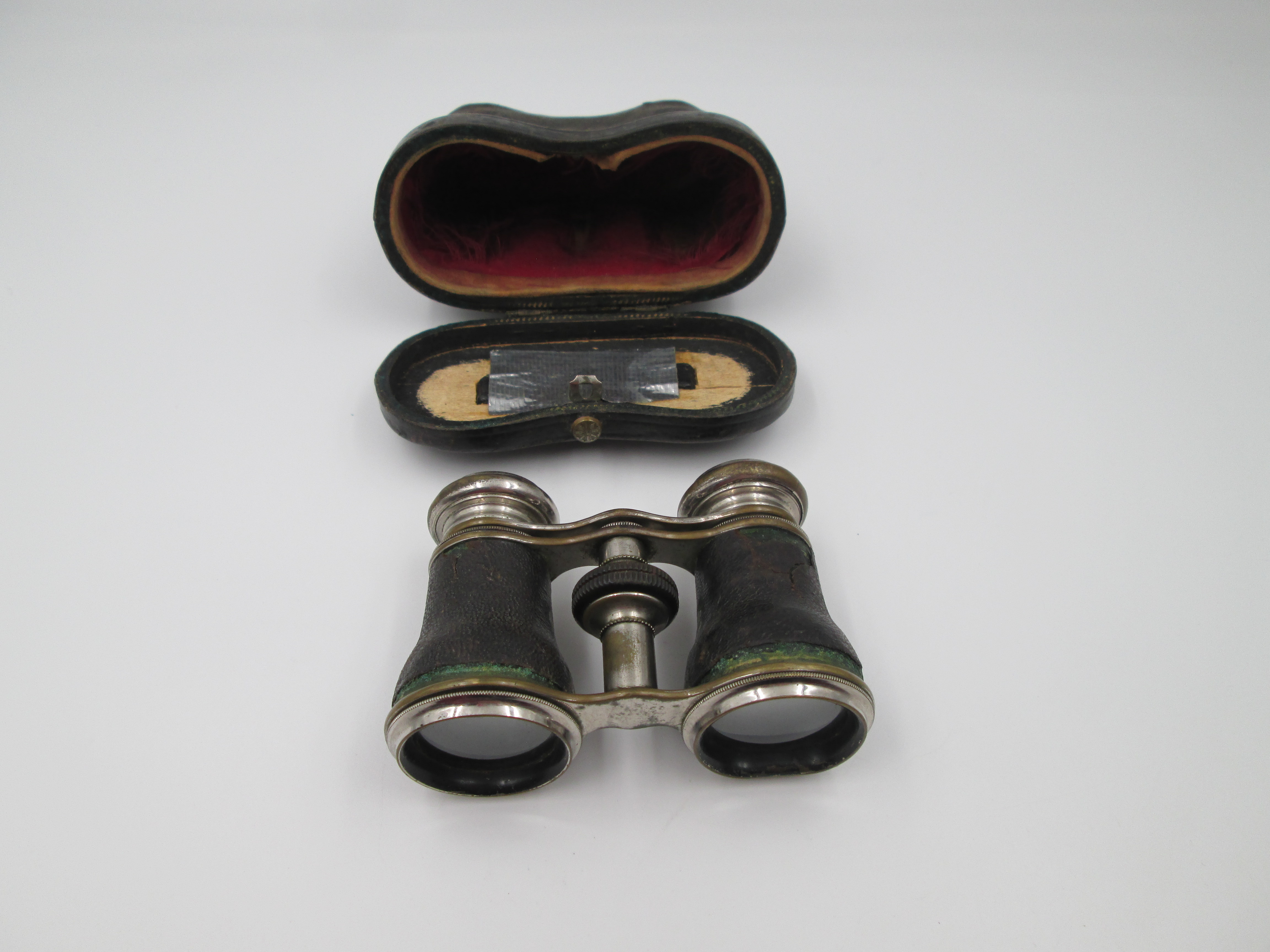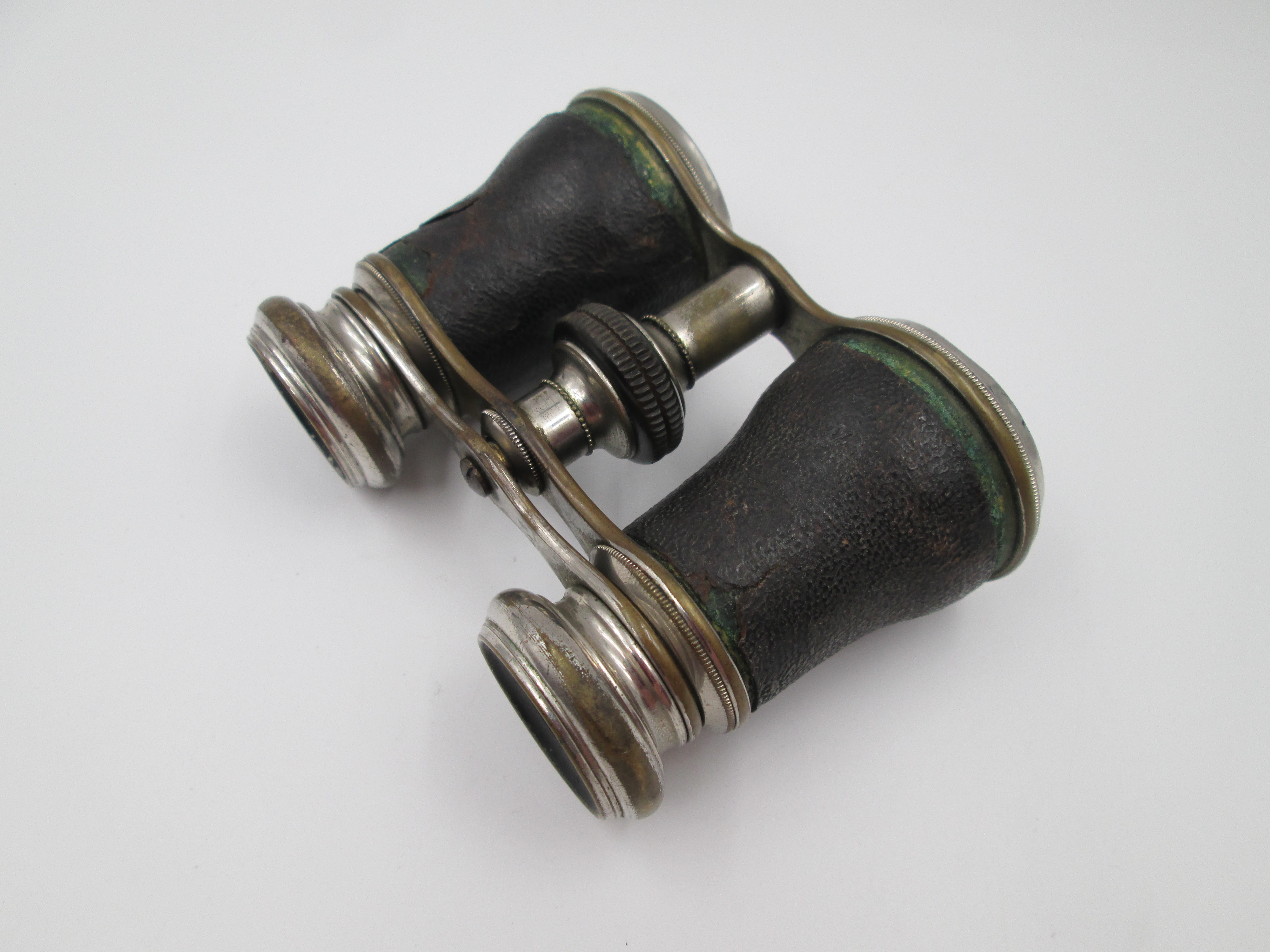 Binoculares de teatro con estuche. Latón plateado y piel negra. Alemania. 1930