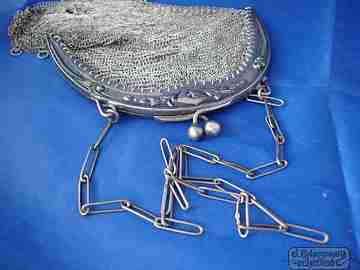 Bolso malla. Plata de ley. Boquilla ornamentada. Cadena. 1910