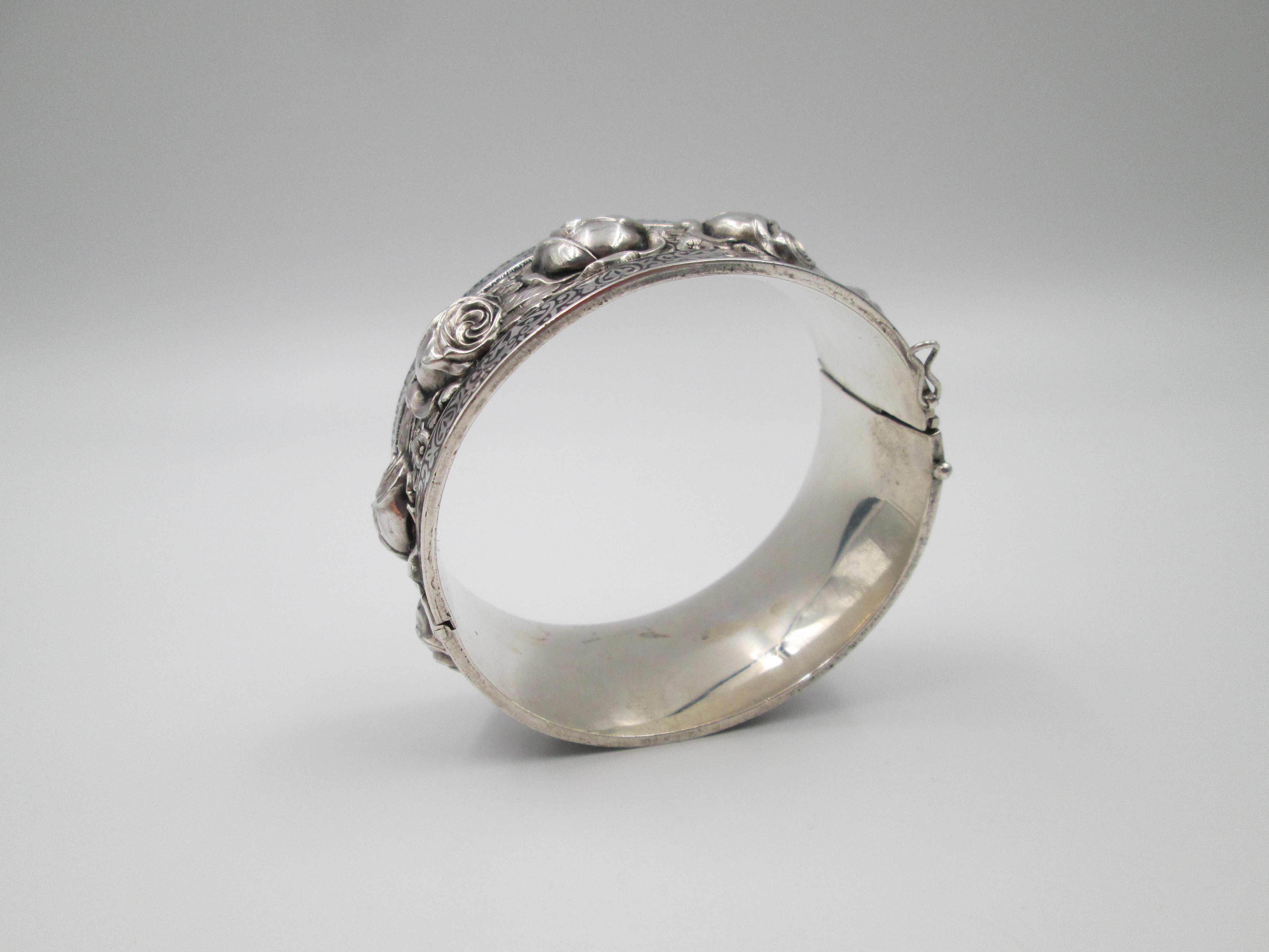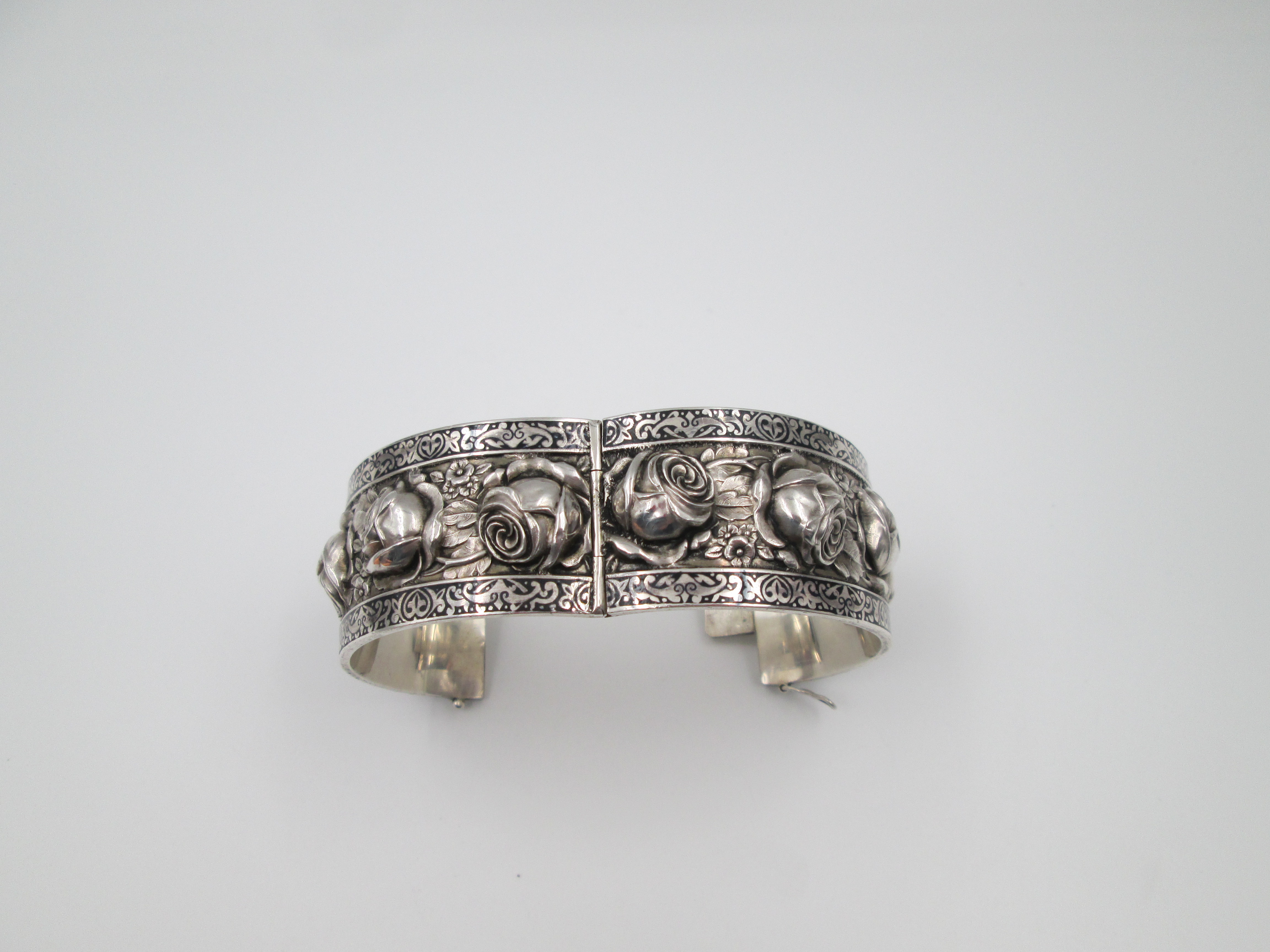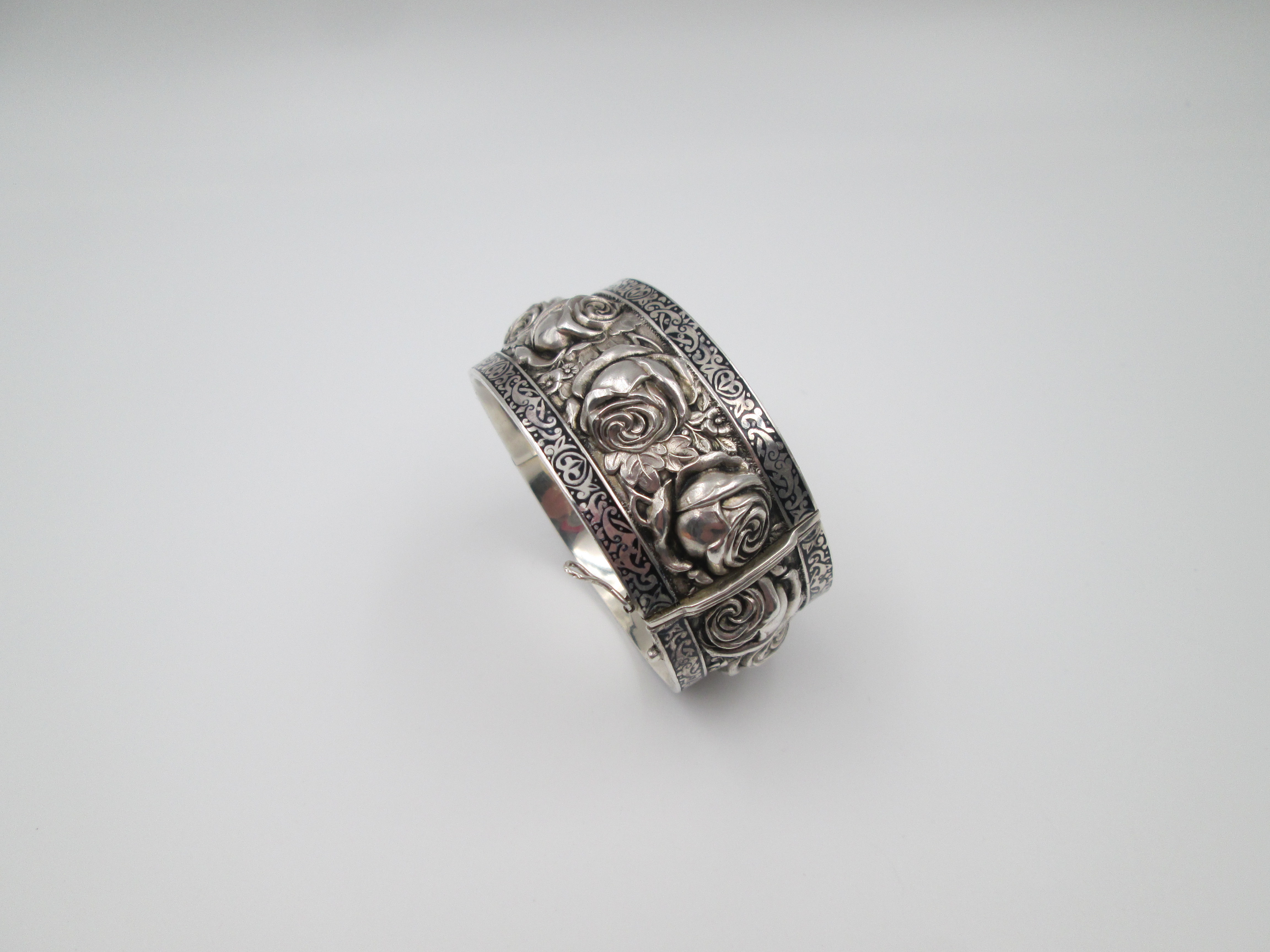 Brazalete ancho mujer. Plata de ley. Rosas en relieve y cenefa vegetal. Cierre pestaña. 1970