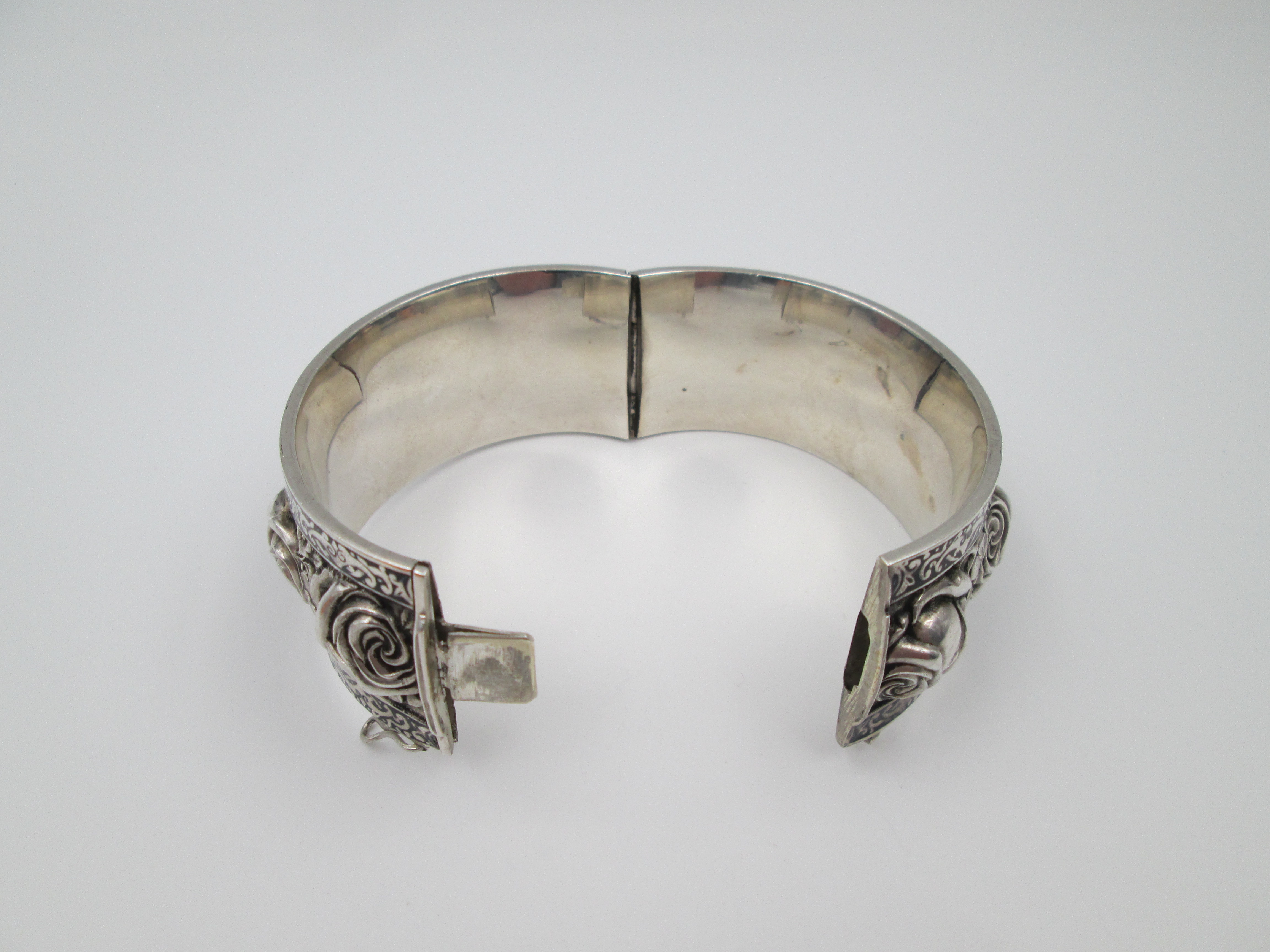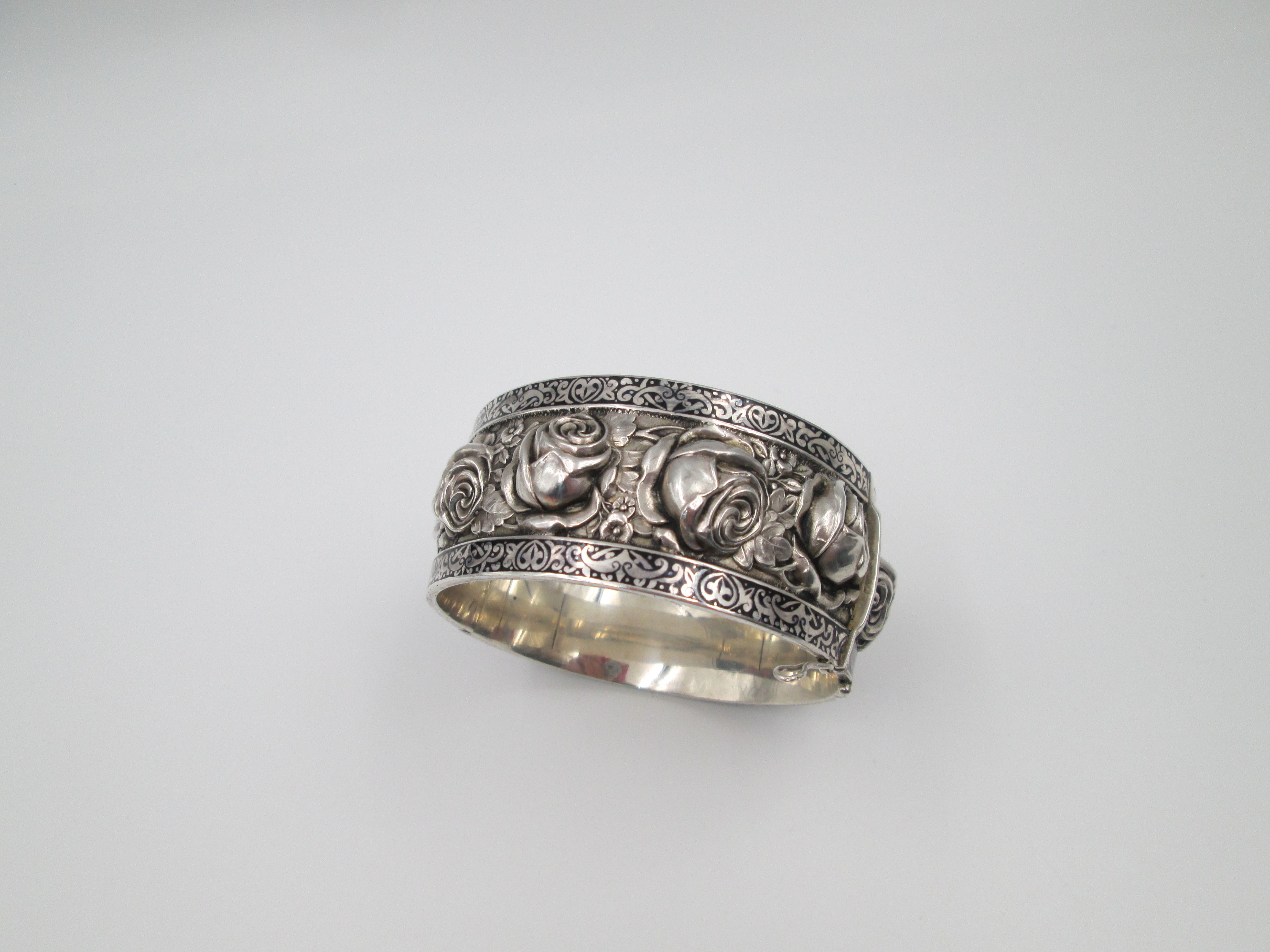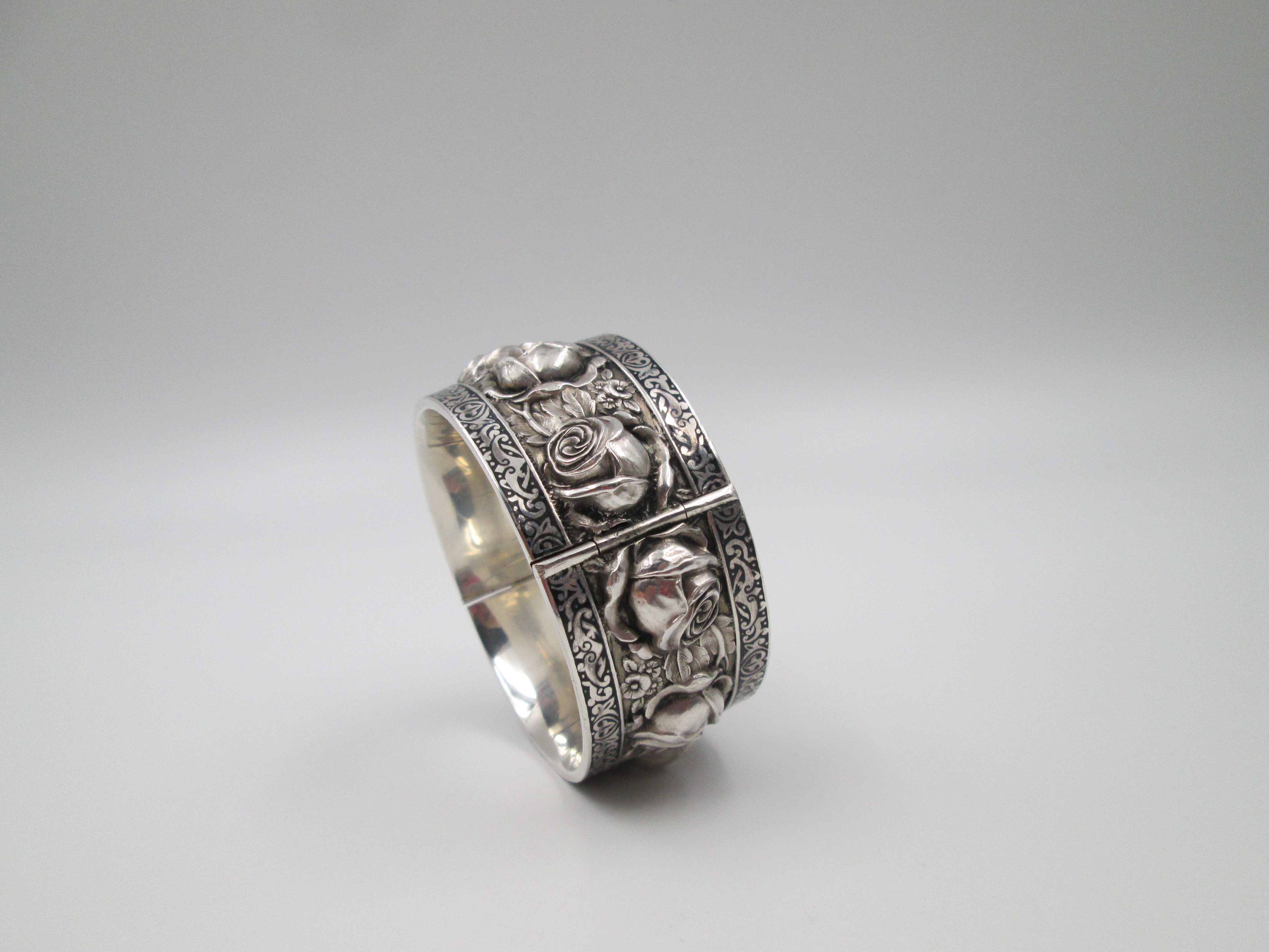 Brazalete ancho mujer. Plata de ley. Rosas en relieve y cenefa vegetal. Cierre pestaña. 1970