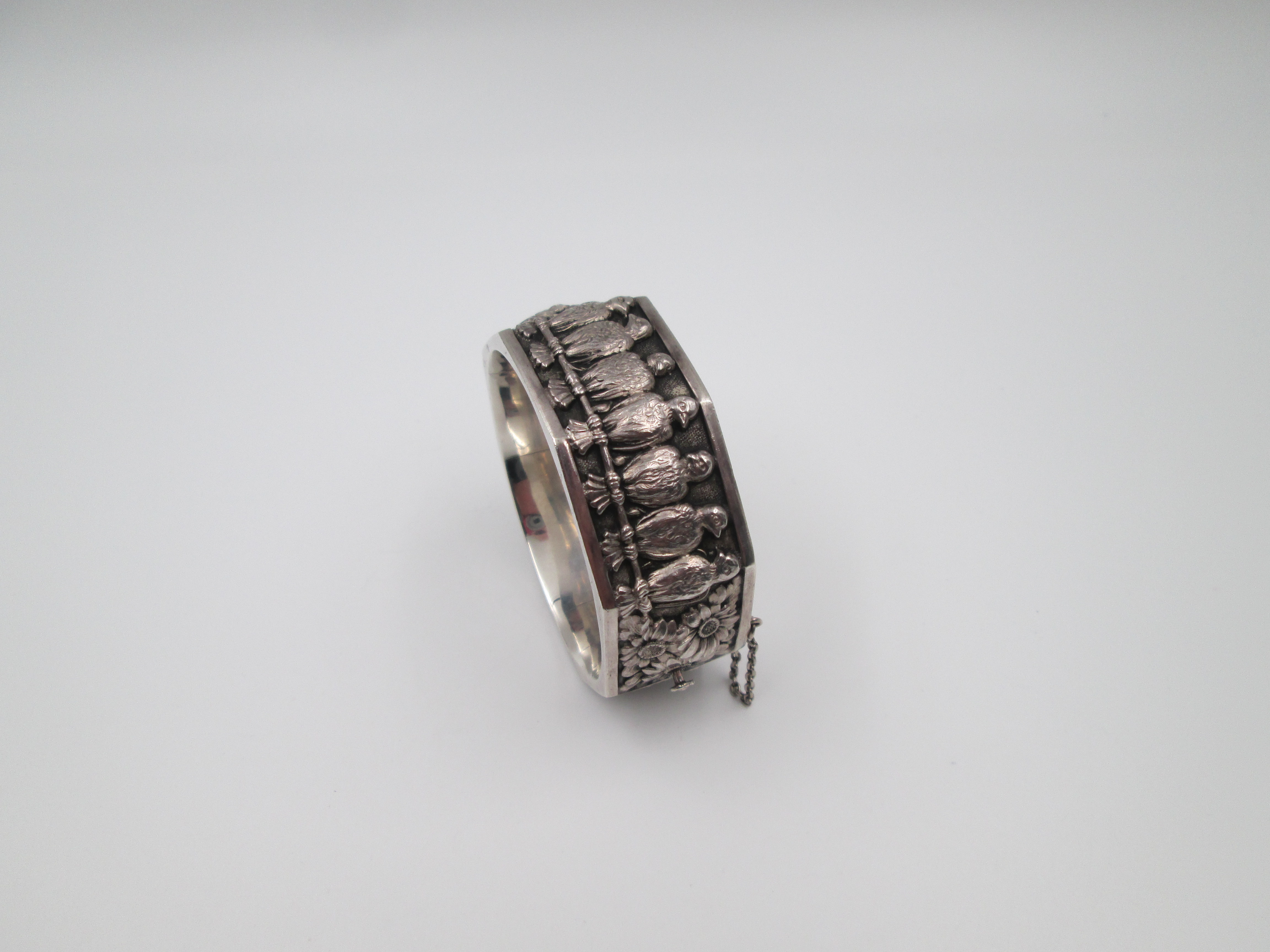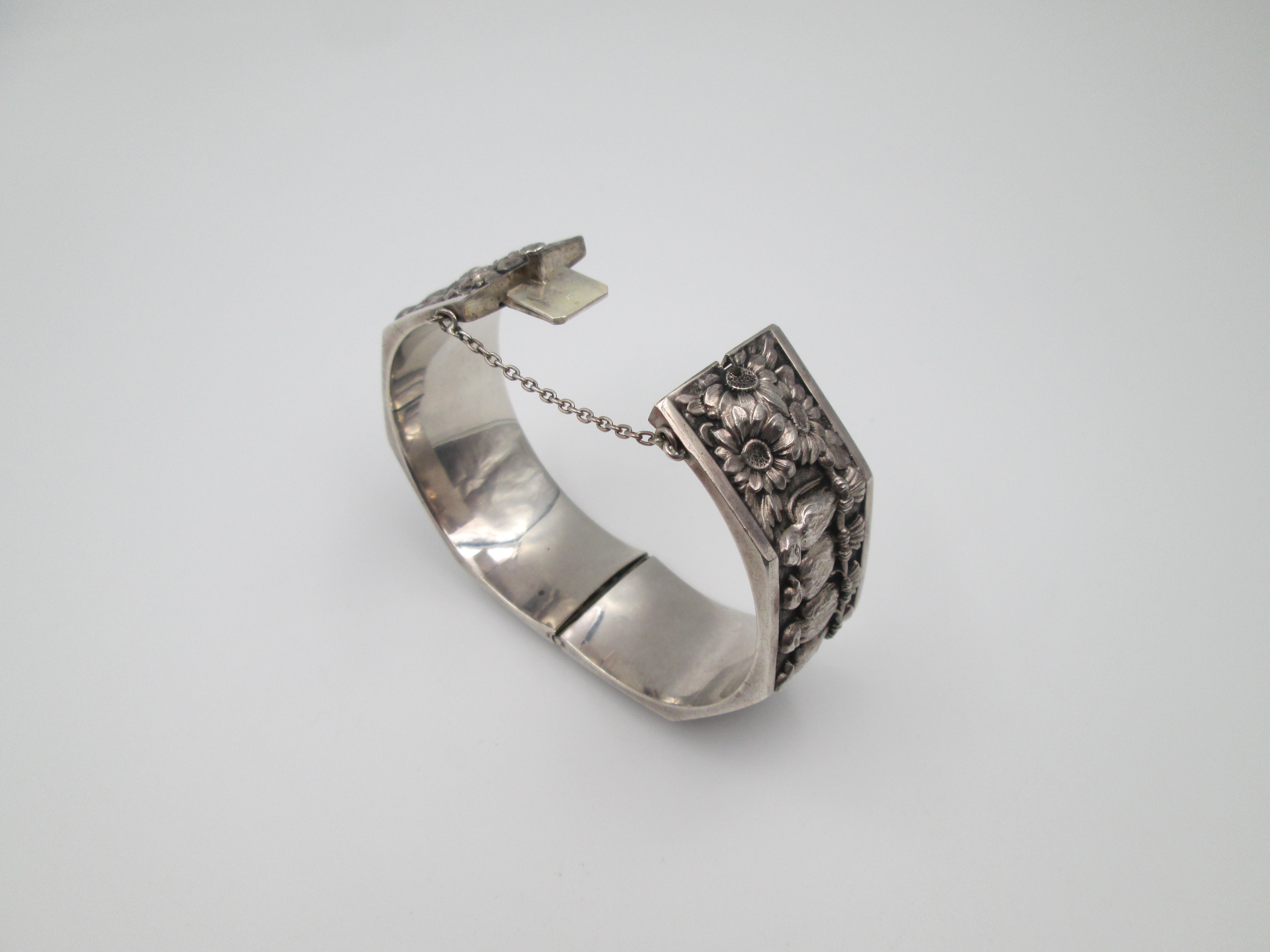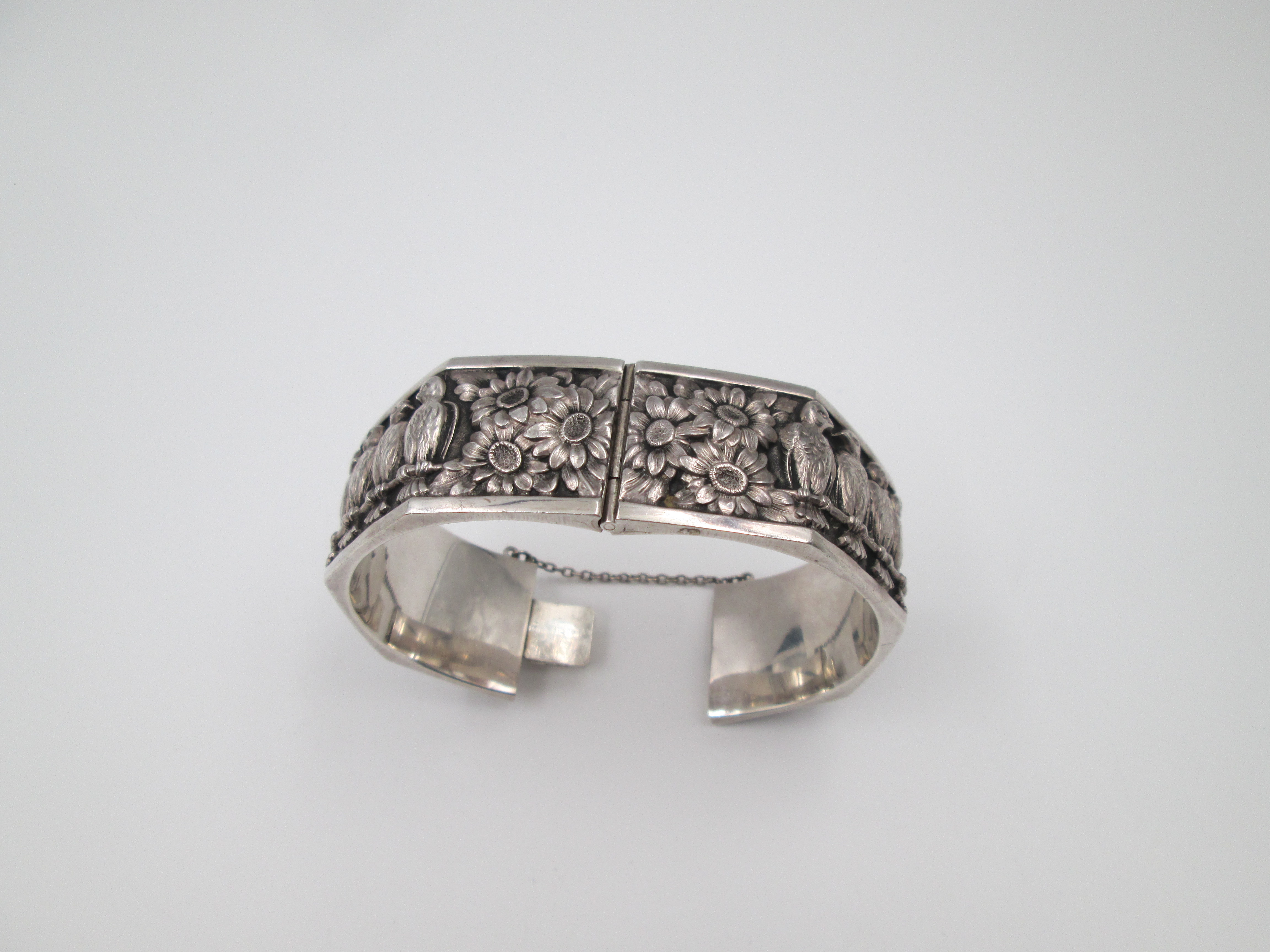 Pulsera brazalete para mujer. Plata de ley. Margaritas y águilas en relieve. Europa. 1970