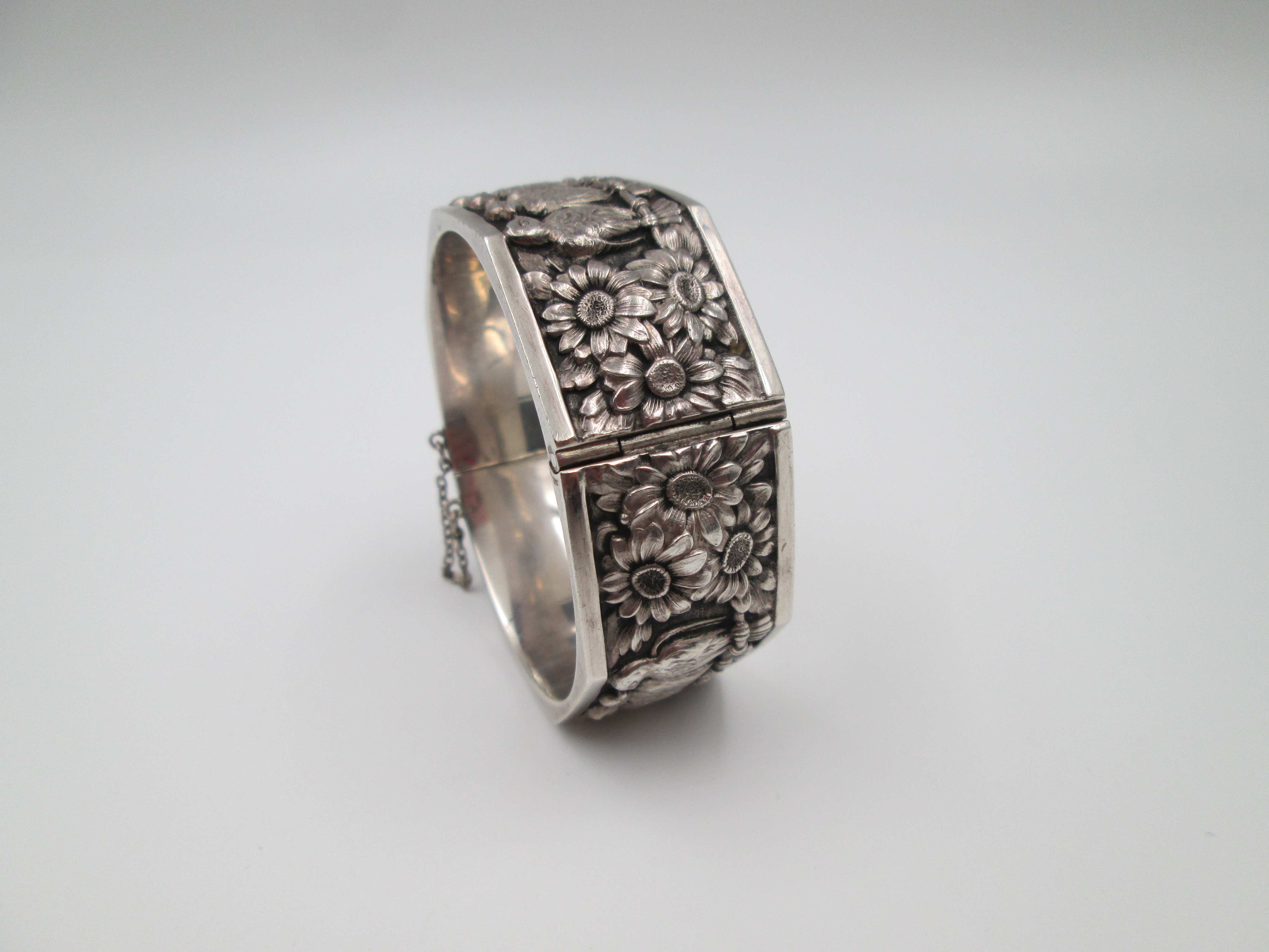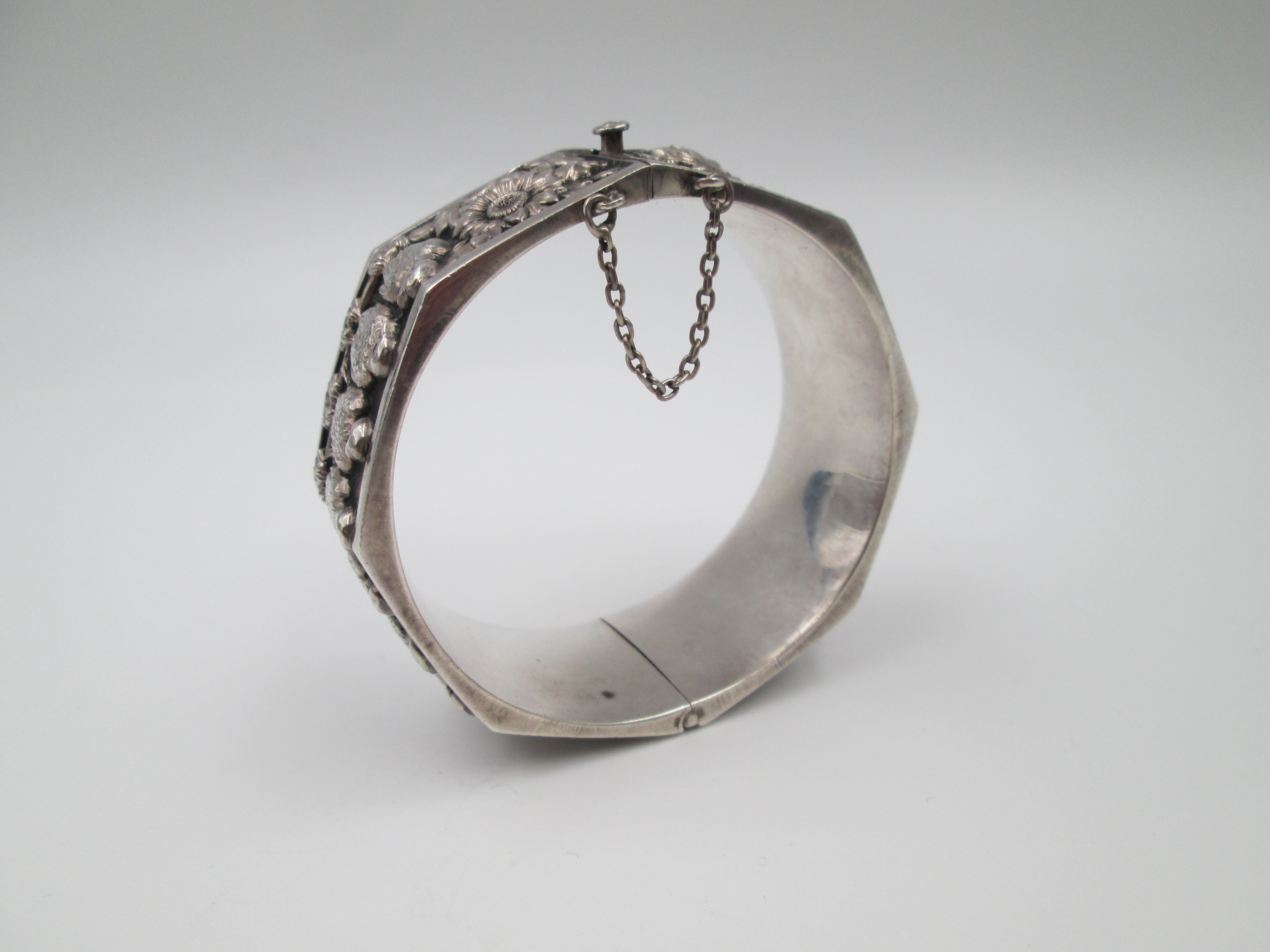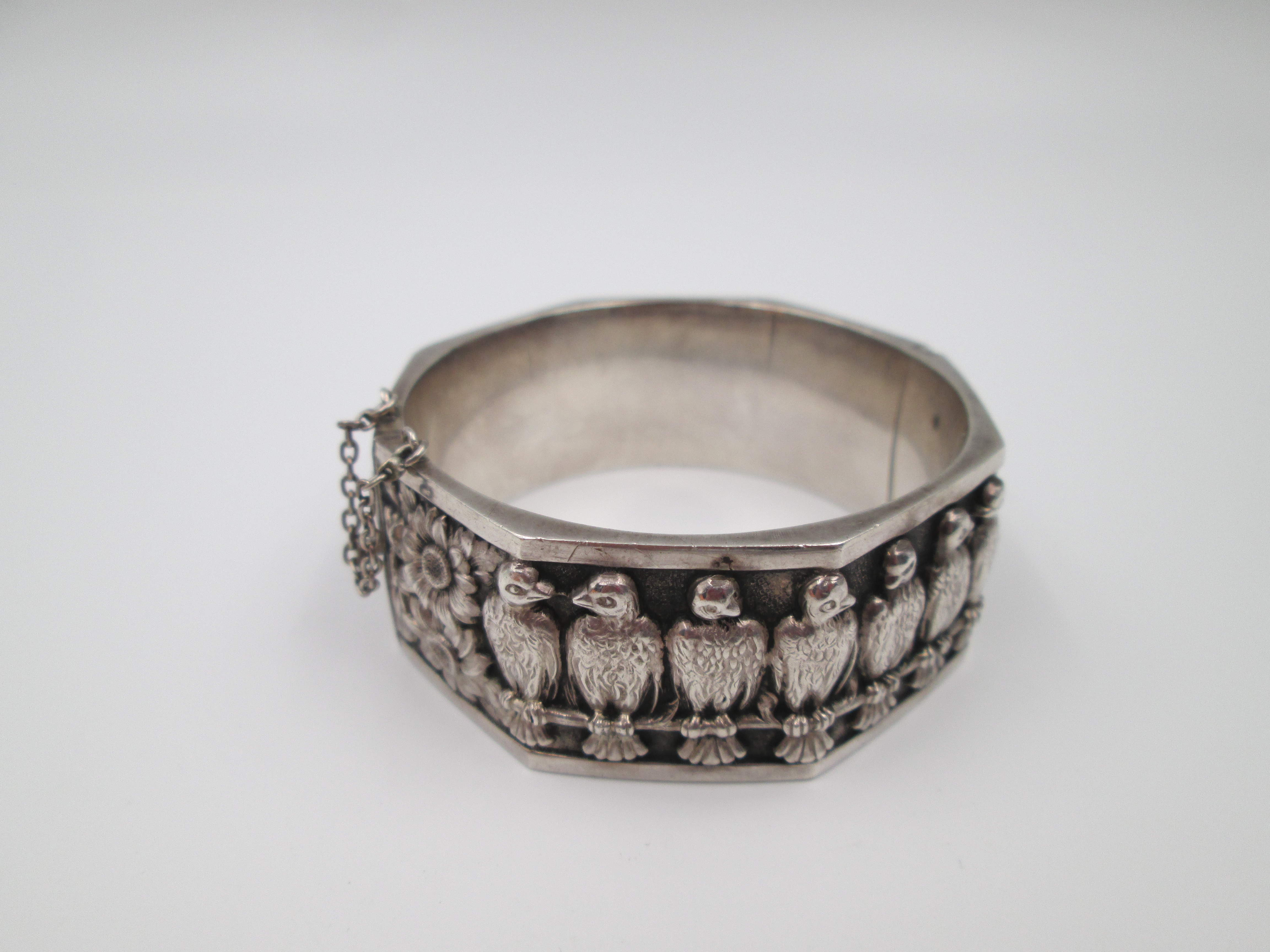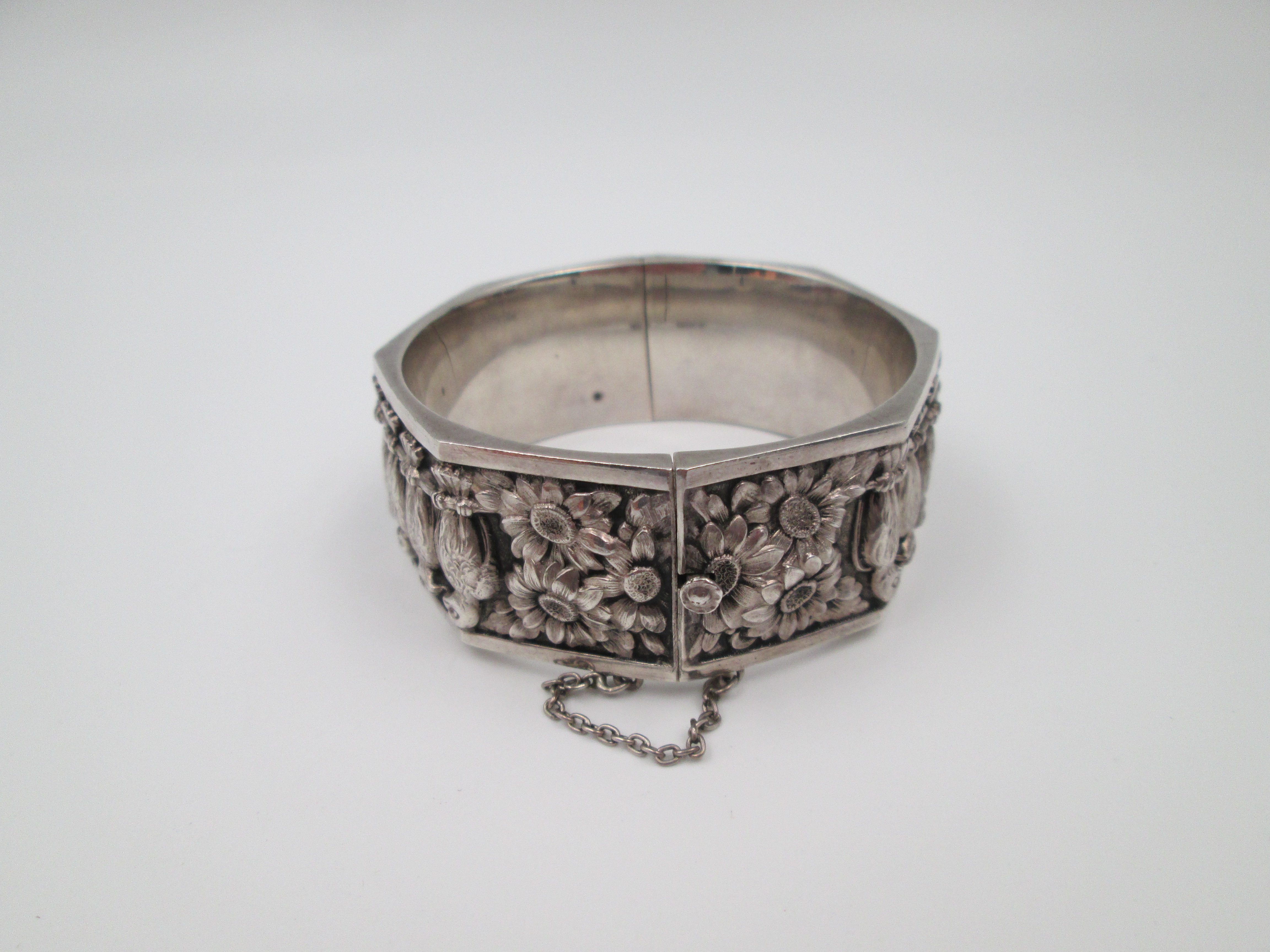 Pulsera brazalete para mujer. Plata de ley. Margaritas y águilas en relieve. Europa. 1970