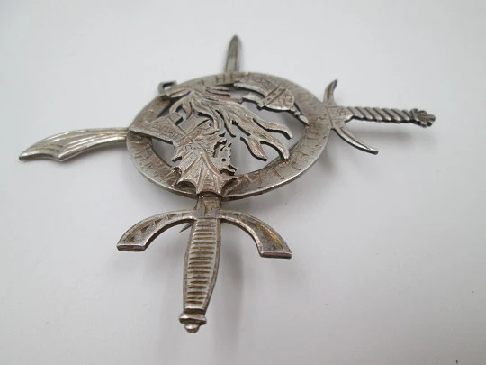 Representa en el anverso dos espadas entrelazadas en torno a una escena central calada de un caballero y un dragón separados por llamas y cuenta con el correspondiente alfiler en el reverso.