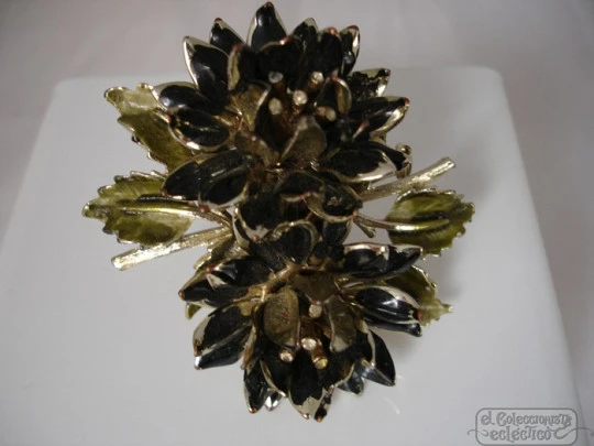 Los pétalos vienen decorados con esmalte negro y las hojas inferiores se rematan en verde. Lleva el correspondiente alfiler de seguridad en el reverso y el sello y los contrastes de la casa americana.