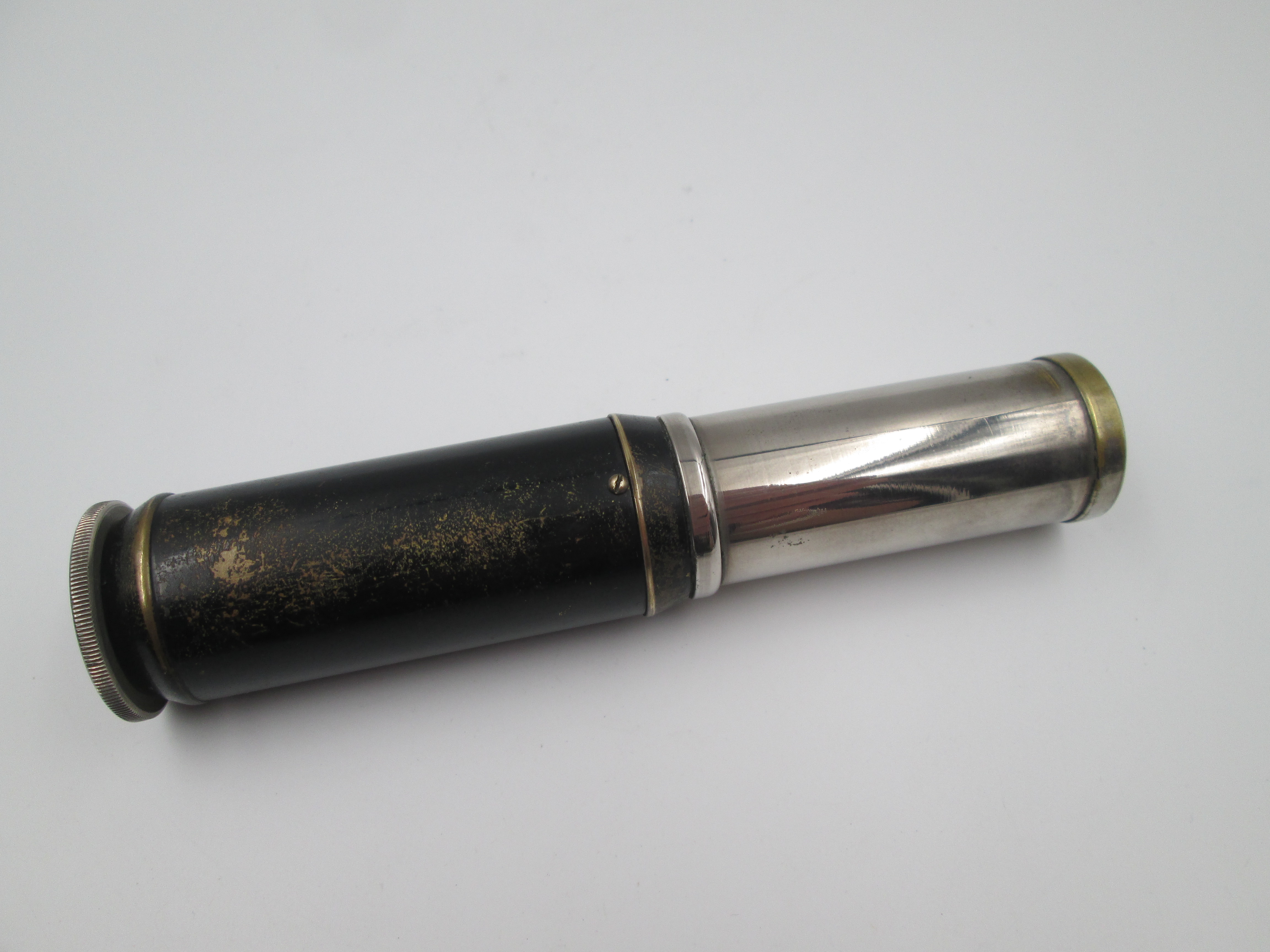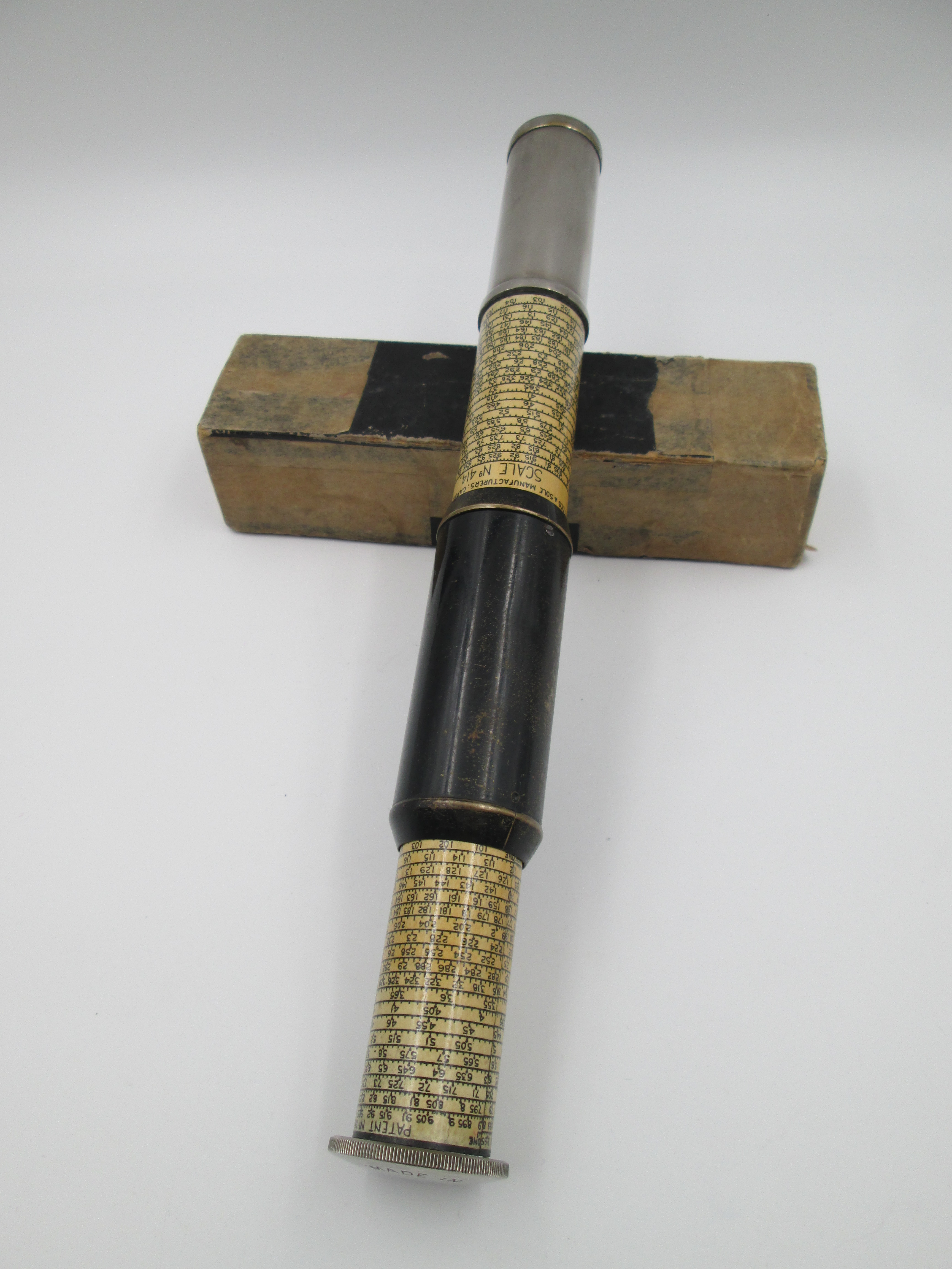 El modelo tiene forma cilíndrica y está realizado en metal cromado y pavonado en negro, con la escala acabada en blanco.