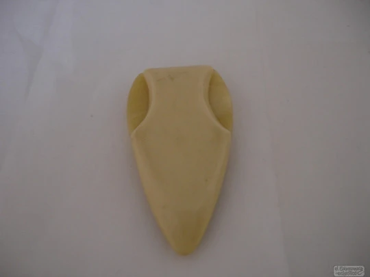 La pieza, de forma ovalada y trabajada en alto relieve, viene adaptada para lucirla como colgante o broche gracias a la argolla y el alfiler que tiene en el reverso.