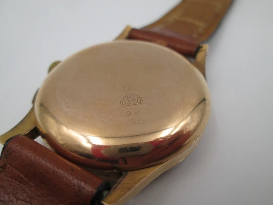 Chronographe Suisse. Cuerda manual. Oro amarillo 18 quilates. Esfera negra. 1960. Suiza