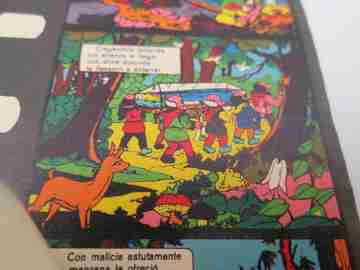 Viene realizado en baquelita bicolor, roja y negra, con los mandos laterales de avance / retroceso en azul claro, y se suministra con la caja original y cuatro películas de papel en rollo.